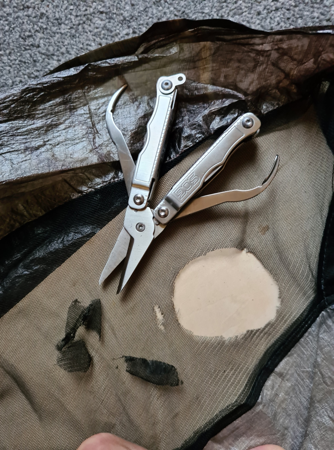 The damage to my shelter was cleaned up with a sharp pair of SOG Snippet scissors and, again, the mesh repair patch offered to the damage to ensure it would cover it. I kept the damage as two separate holes and didn’t join them as one large hole just to try and preserve as much integrity in the mesh side as I could.