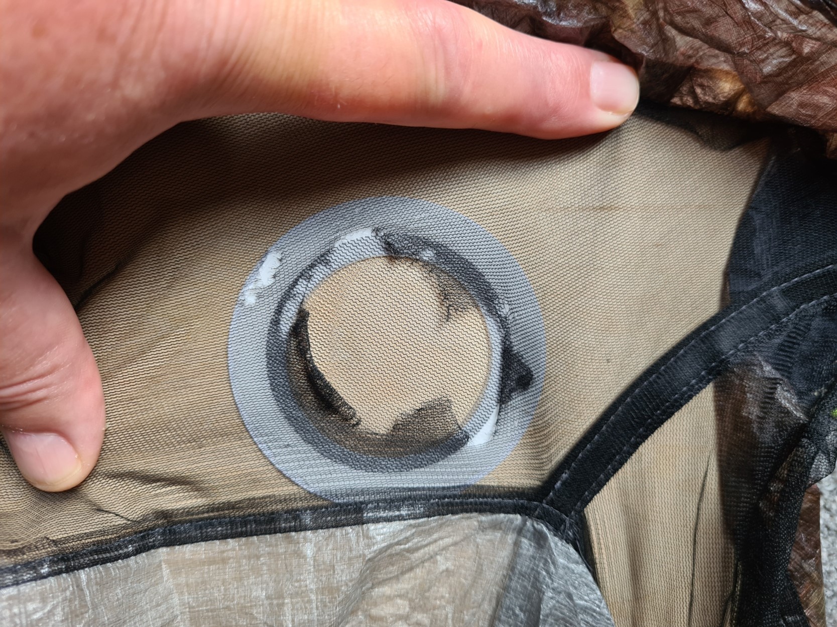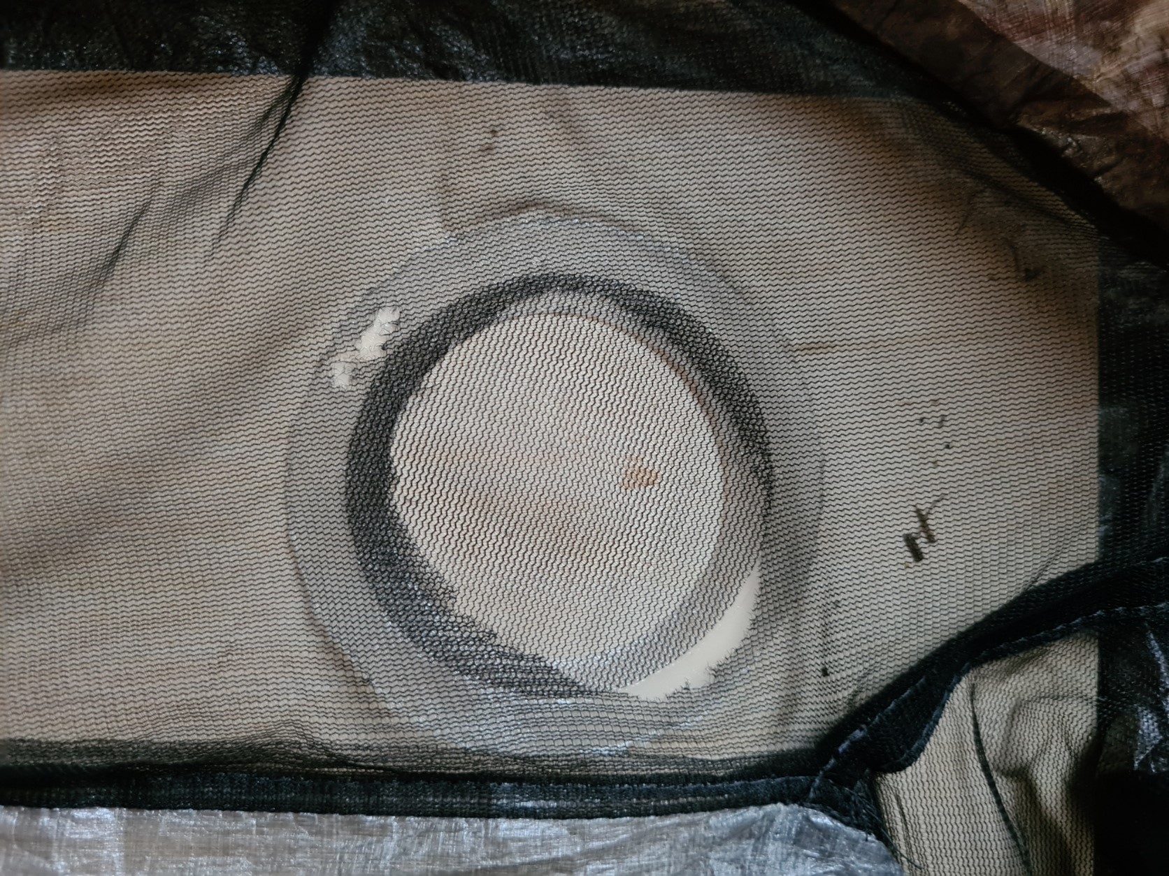 The adhesive on these patches is particularly aggressive and care had to be taken with sticking on the first patch, inside the damage. Any rucking of the mesh at this time would result in a messy job and strained material when the tent is erected. Moistened fingers will help prevent them sticking to the adhesive, but I never bothered.