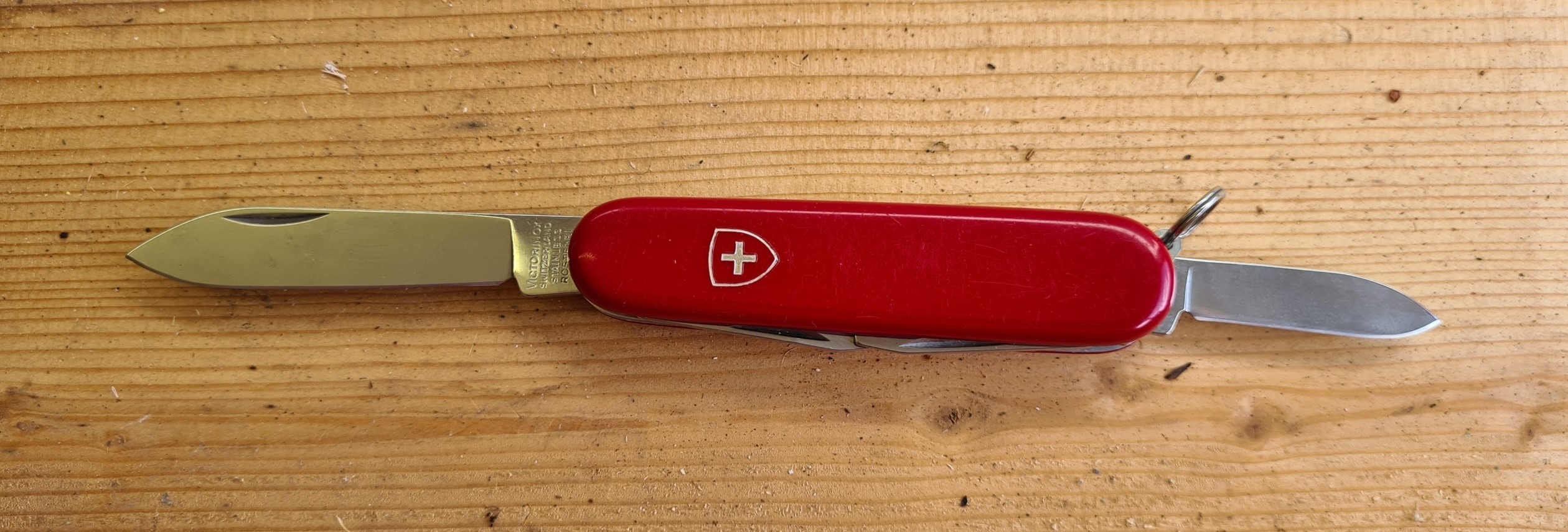 The Victorinox Recruit is the same as the simplest of the knives looked at there. It has tools on one side, there are no back tools. My Recruit doesn’t have tweezers or toothpick as scale tools either as it is an older ‘Economy Recruit’ model 2.2501 circa 1979-94. There are just a few differences with this knife from today’s Recruit, the simple shield on the scale being obvious. The lack of a half-stop on the bottle opener/large screwdriver is perhaps less obvious. A Victorinox Recruit purchased today will have the two additional scale tools, as do the three knives shown below.
