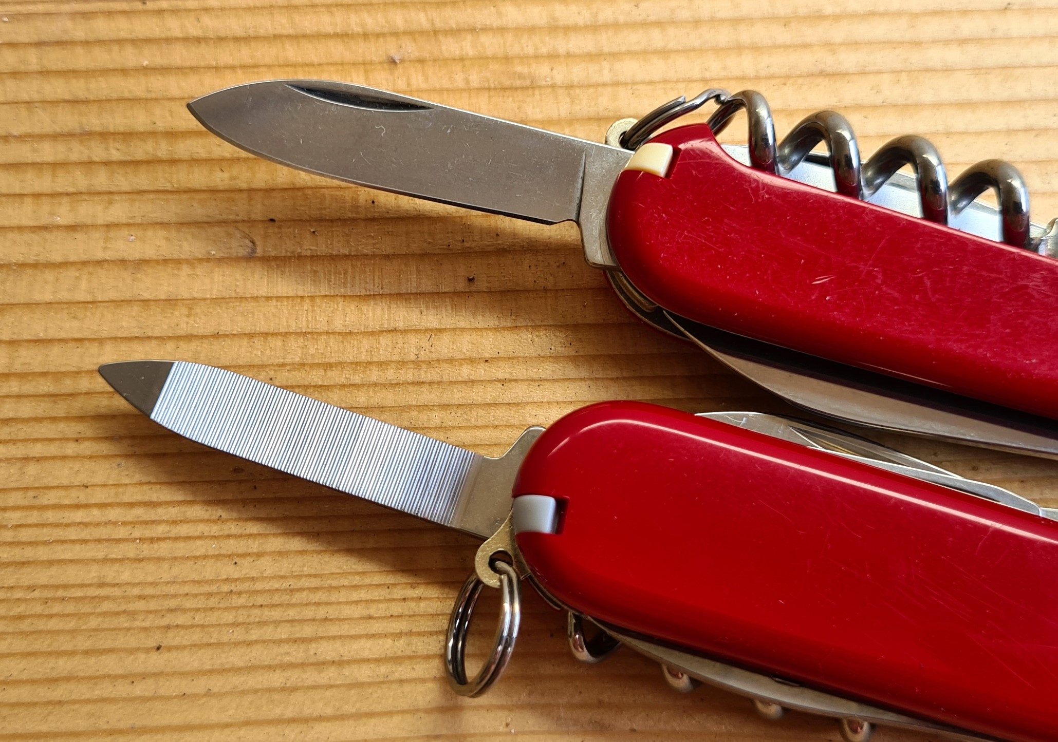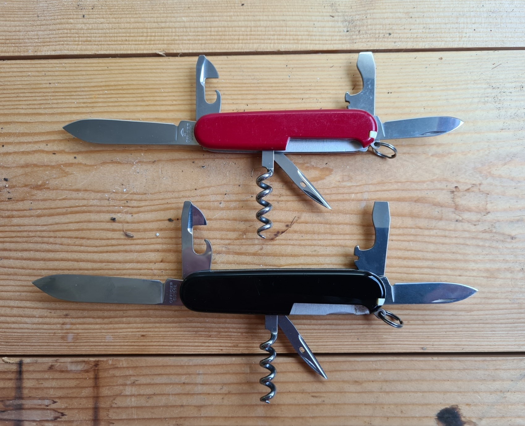 Many of the 84mm range of knives from Victorinox, including two of the four shown here, have a larger equivalent in Victorinox’s 91mm range that have identical tools, though tools are usually just a little larger in the 91mm. For example, both of the combination tools found on the 84mm knives are a little smaller than their equivalents found on their larger 91mm cousins. This can be seen on the 84mm Tourist and a 91mm Spartan (with black scales) below. While the 84mm Small Tinker, unsurprisingly, a smaller version of the 91mm Tinker, there is no directly comparable variant of either the Recruit or Sportsman.