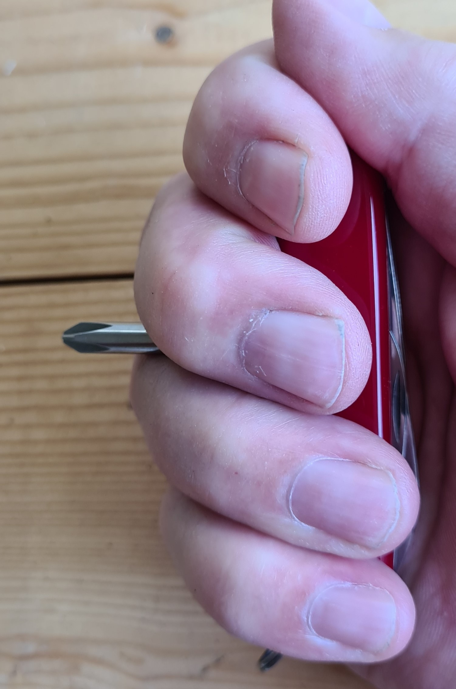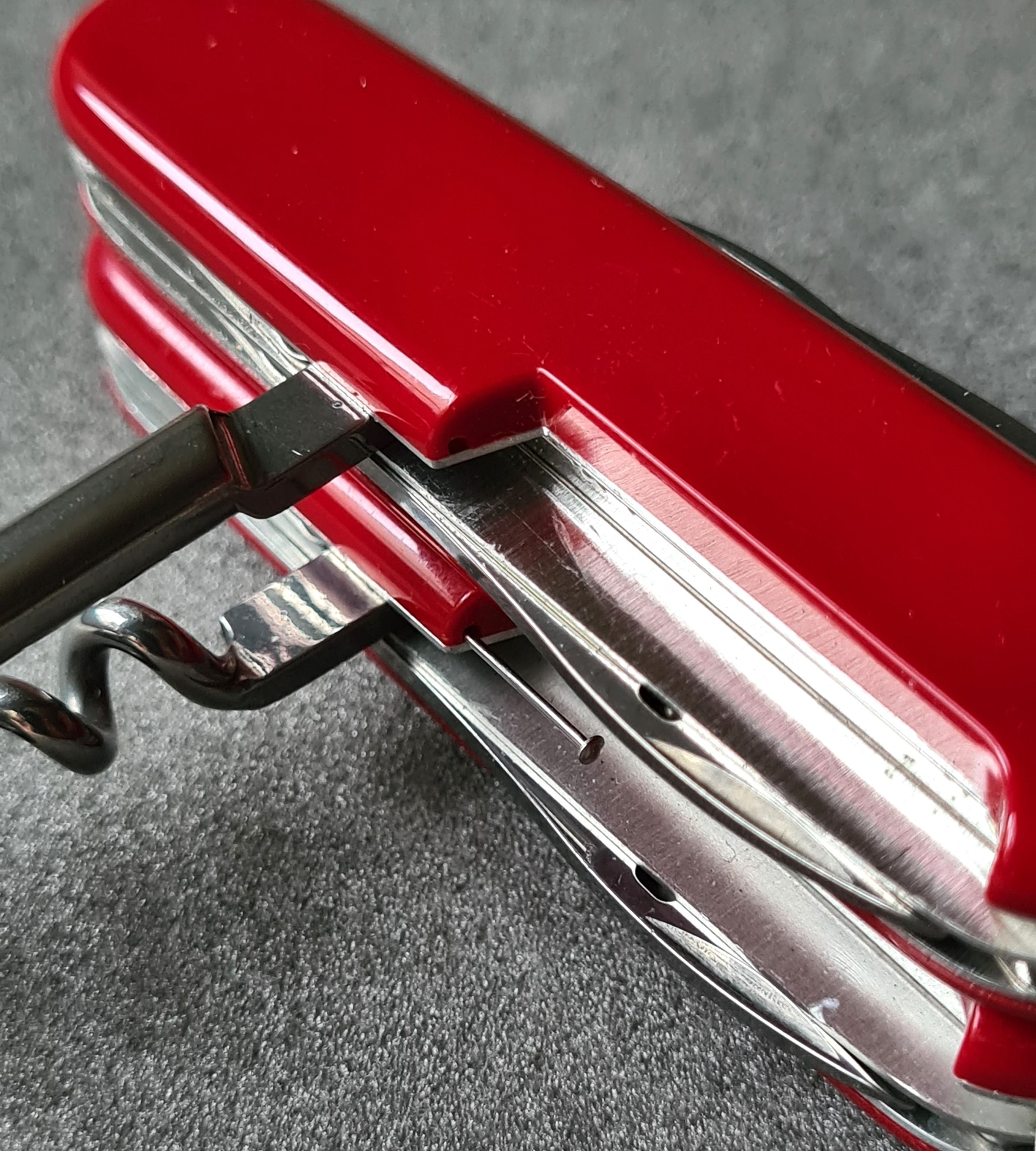 There is a 37.5mm long awl, what Victorinox call a reamer punch, as a back tool on the Tinker Small, Tourist and Sportsman, this has a sharp 23.5m long section with a slight curved edge, just about perfect for punching and reaming leather, or even wood. Used in ‘T’ fashion, the lack of a sharpened edge under the fingers means there is less chance of damaging the hand when holding the knife while torquing down. There is a sewing eye in this awl too (added by Victorinox in 1985). All awls should have these, but do not. The nail nick on all three awls is placed on the wrong side of the tool, adjacent to the corkscrew so prevents easy opening. There is no issue with the nail nick being beside the narrower Phillips screwdriver on the Tinker Small.