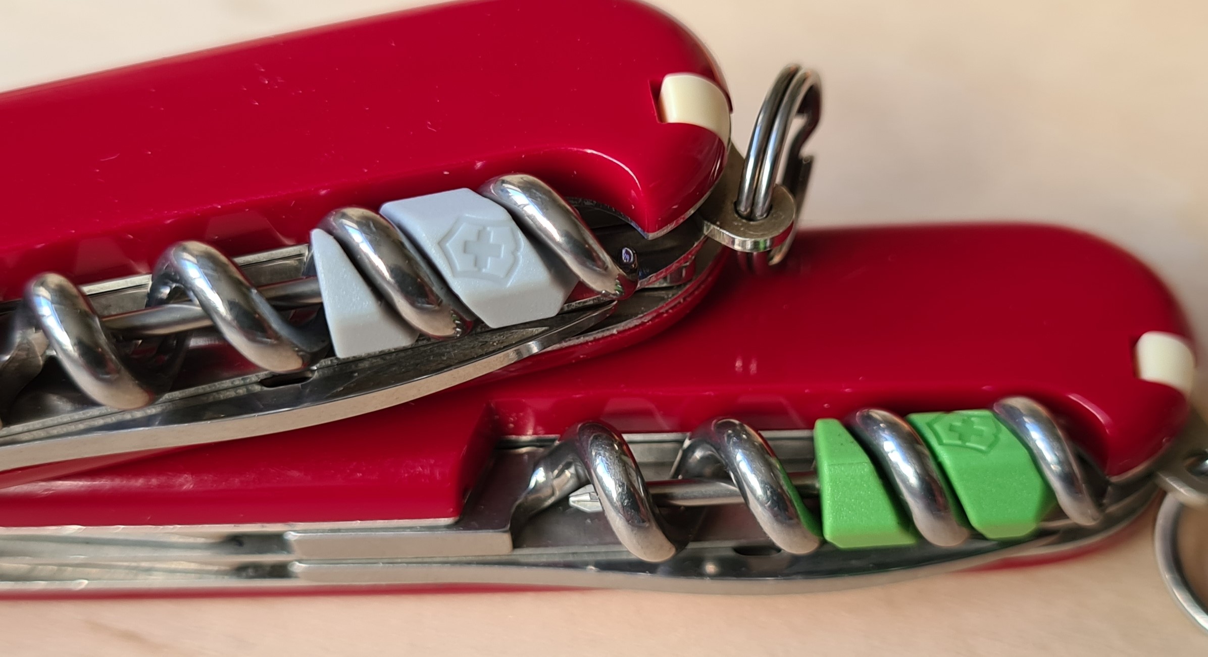 | Model | Main blade | Small blade | Nailfile | Bottle opener, with flat screwdriver | Can opener, with small screwdriver | Awl | Phillips screwdriver | Corkscrew |