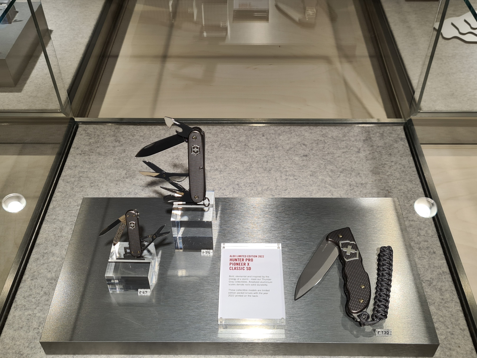 Victorinox closed their store in London’s Bond Street during covid. Almost three years later, Three Points of the Compass was keen to see what their new Flagship Store in Oxford Street had to offer. I visited on the store’s ‘grand-opening’ and was not disappointed. It is much as you would expect- high end, quality goods that includes travel gear, watches and fragrances. But walk upstairs and the iconic Victorinox knife is in profusion. Brightly lit cases line the walls and themed collections of knives are on show. Classic red Cellidor scales abound, Alox scales glint in the bright lights, warm walnut wood-scaled knives tempt the wallet. It doesn’t end there, recent releases of Limited and Special Edition knives are grouped in small, uncluttered floor cases. These are almost devoid of embellishment, instead relying on the allure of the product itself. Below the cased examples, many of the standard range are fastened to theft proof cabling and can be handled and compared to their nearby cousins. If you want to get a feel of a Victorinox knife before committing, this is the place to go.