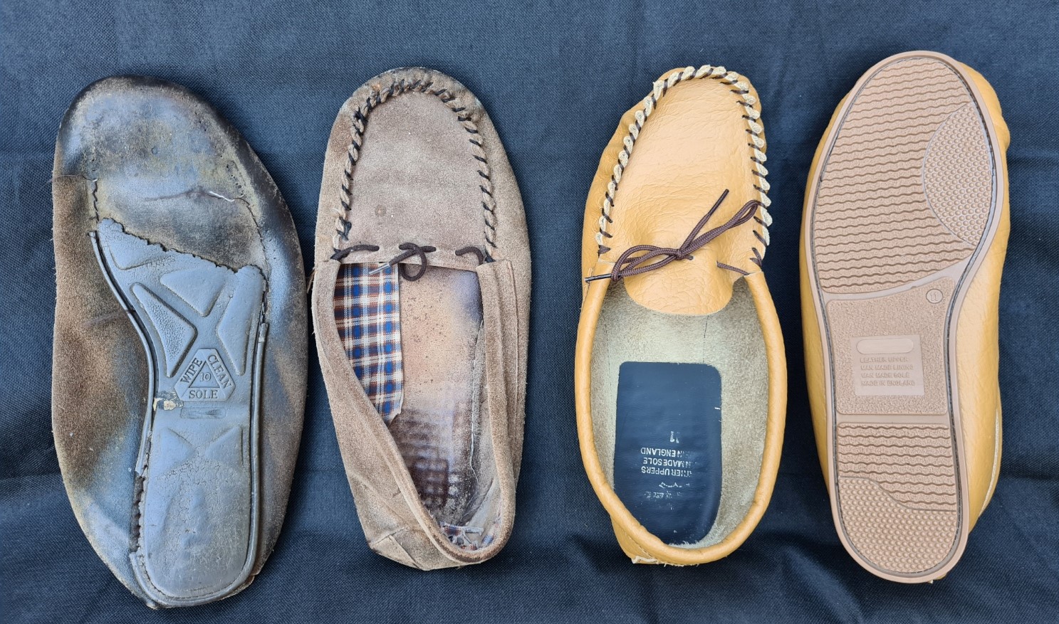 My camp shoe moccasins were one of the first pieces of gear to get the heave-ho. They still had plenty of life in them so moved to house wear and they became like old friends. Replaced by an identical pair after a decade, I have been patching that second pair up for the past twenty years, re-stitching, glueing and persisting with them ever since. The linings wore out, half the soles fell off. I confess that it is only this last month that I eventually gave in and bought a replacement pair. Sadly, those old backpacking type moccasins are finally going to the tip. At 511g a pair, I will not be returning to moccasins as camp wear though I note that if I did unstick and remove the heavy synthetic sole, it would reduce the weight by at least half.