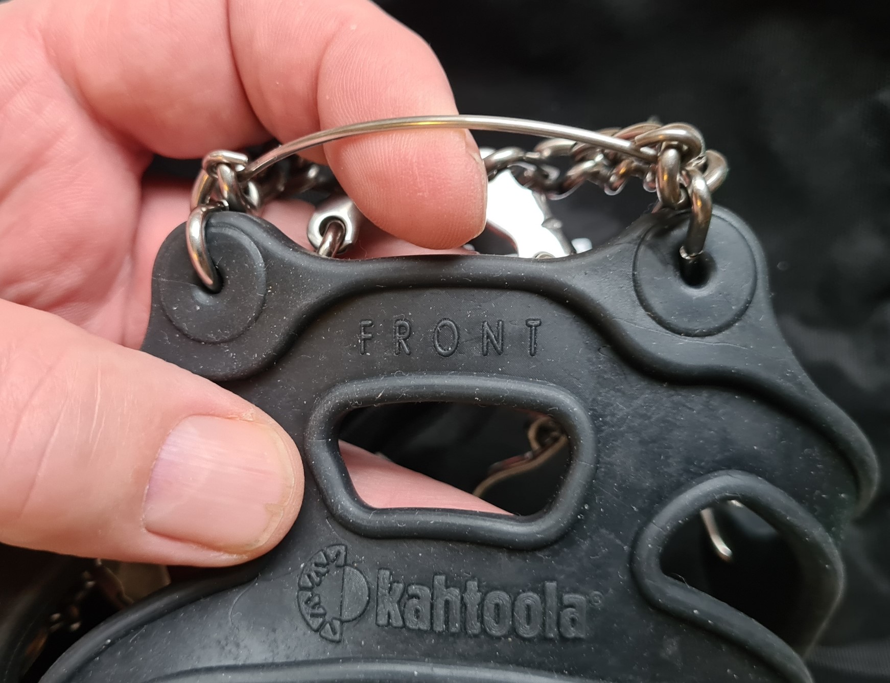 Each of my microspikes has ten stainless steel triangular spikes. Two 13mm on the heel and eight 11mm in front. The current version from Kahtoola now has twelve spikes per foot and all spikes are now a little shorter. These are attached to stainless steel chains that also provide a degree of traction. Chains are attached at the side of the foot to the eyelets of a TPE harness. They are a doddle to put on. Place the toe inside the harness against the curved bail and stretch the harness back under the foot and pull up to the back of the heel. There is a large tab at the back of the harness to aid in this when wearing gloves. Make sure the harness is properly pulled up all around the foot and that is it. No buckles, no straps. It takes less than a minute. My wife’s size Medium Kahtoola microspikes weigh 376g. Kahtoola lists a weight of 338g for their current Medium sized product. My Large spikes weigh 428g, current spec is 372g. We are all aware of how many manufacturers can massage their figures so I have no idea how accurate these currently advertised weights are.