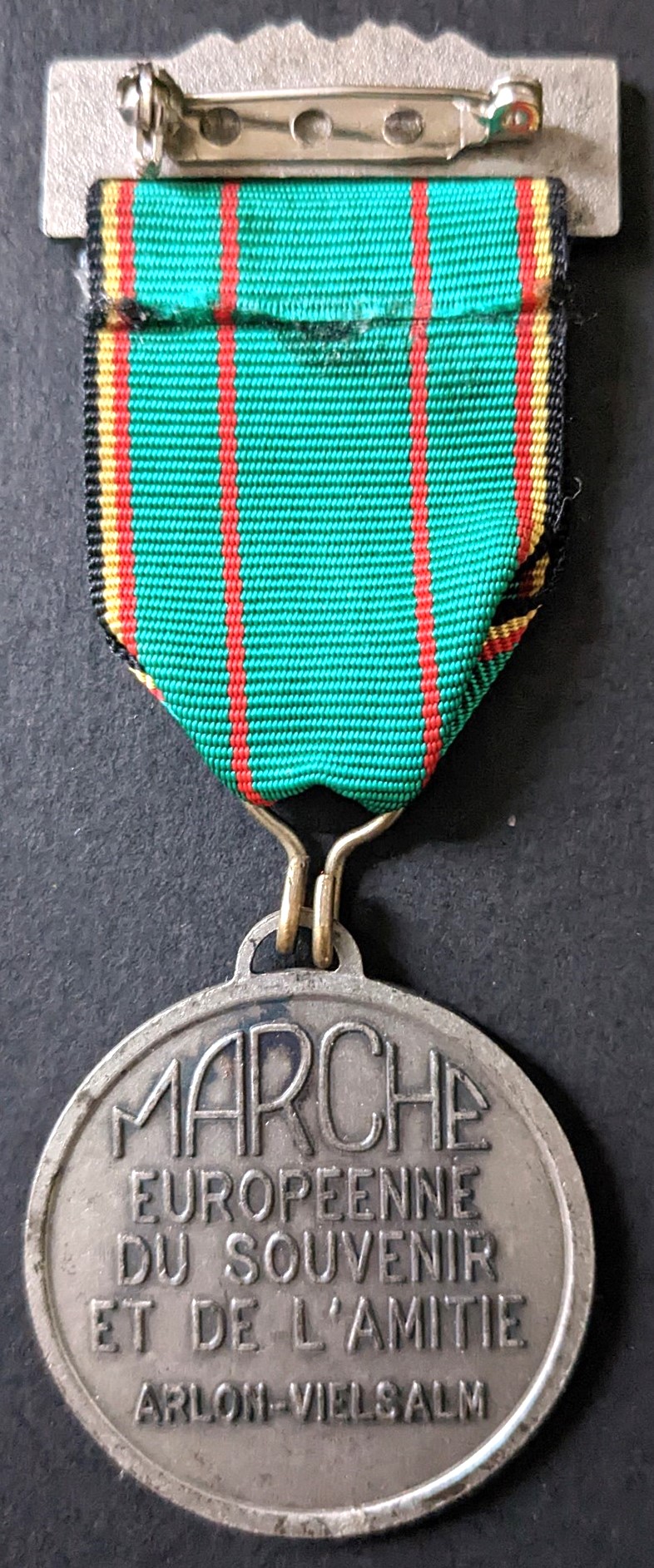 Earlier medals have a 3mm wide ring around the obverse rim bearing the relief inscription “3 CHASSEURS ARDENNAIS” in the upper half and “125 km” at the bottom. Also within a raised rim, the reverse relief inscription has altered over the years. A 1973 dated medal has: “MARCHE” “DU SOUVENIR” “ET DE L’AMITIE” “ARLON-VIELSALM” “OFFERT PAR ADEPS”. ADEPS is an acronym for “Administration de l’Éducation physique, du Sport et de la Vie en Plein Air”. This administrative service of the Ministry of the French community of Belgium promote sport and physical education amongst the population of the French-speaking community. On the M.S.A. medal: four lines “MARCHE” “DU SOUVENIR” “ET DE L’AMITIE” “ARLON-VIELSALM”. Arlon and Vielsalm are two of the locations where the Green Berets were barracked during their campaign to defend their country in May 1940. On the M.E.S.A. medal: within an encircling twelve stars- “MARCHE” “EUROPÉENNE” “DU SOUVENIR” “ET DE L’AMITIE”.