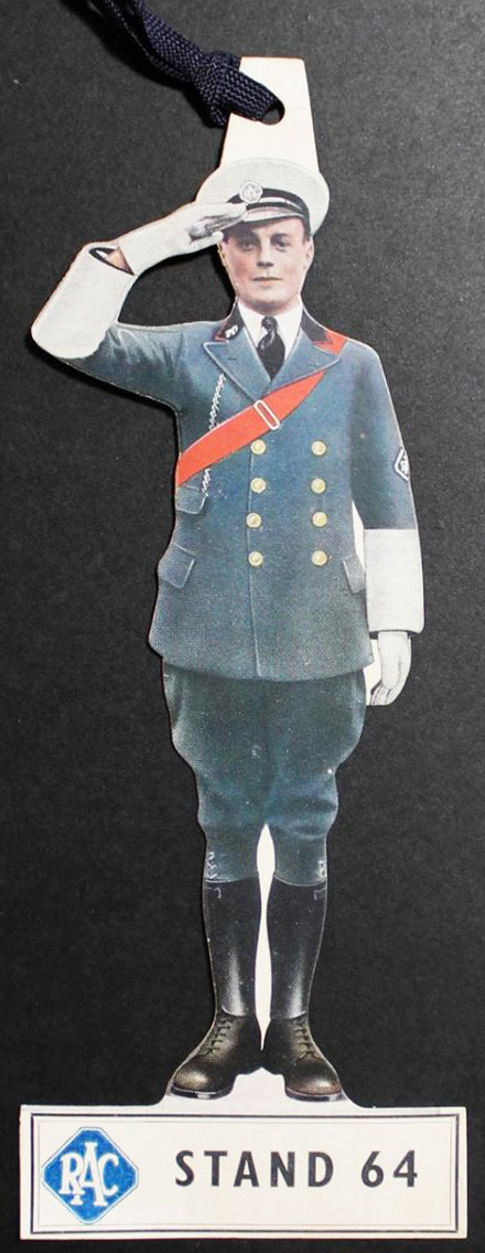 The Royal Automobile Club (RAC) was founded in 1897 as a ‘Society of Encouragement’ for the motoring movement. As well as acting as a roadside breakdown and recovery agency, the RAC also carried out many functions, not least the publishing of motoring guides and road atlases. These often included bookmarks, either in the figure of a uniformed RAC roadside officer or more frequently, a simpler, almost plain card marker. Publishers were wise to the opportunity however and most potentially blank space on a bookmark could include a calendar, or, more lucratively, advertising.