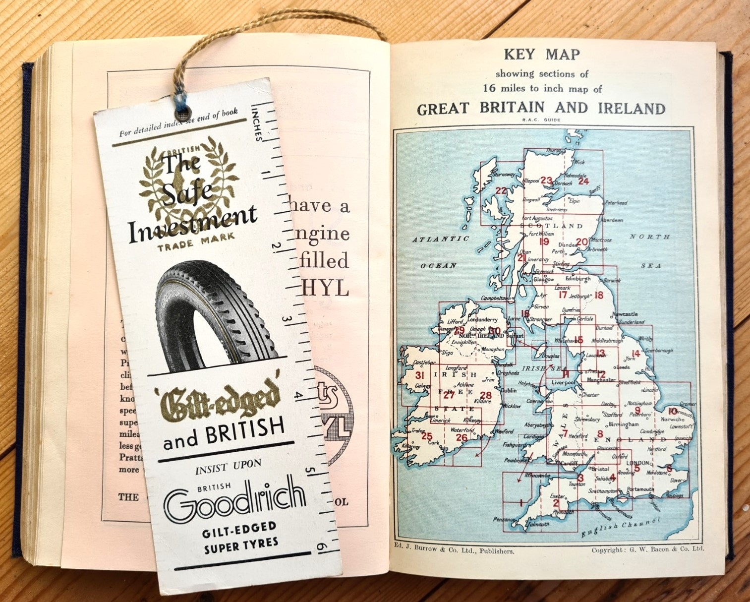 The bookmark measure is quite thin card, measuring 168.5mm x 64mm x 0.5mm. There is just the one reference to the Club Guide and Handbook on the bookmark measure itself, repeated on each side- “For detailed index see end of book”. There is no mention of the bookmark measure in the volume itself. The handbook includes many simple town maps throughout the Directory, printed to various scales. Each of these was prepared by Ed. J. Burrow and Co. Ltd. There are 31 pages of colour road maps of the British Isles in the RAC Club Guide & Handbook for 1933-34. These were also produced by Burrows and are quite accurately printed to a scale of 1 inch to 16 miles. An advertisement for the Burrow’s R.A.C. County Road Map & Gazetteer appears on the inside rear cover of the Handbook.