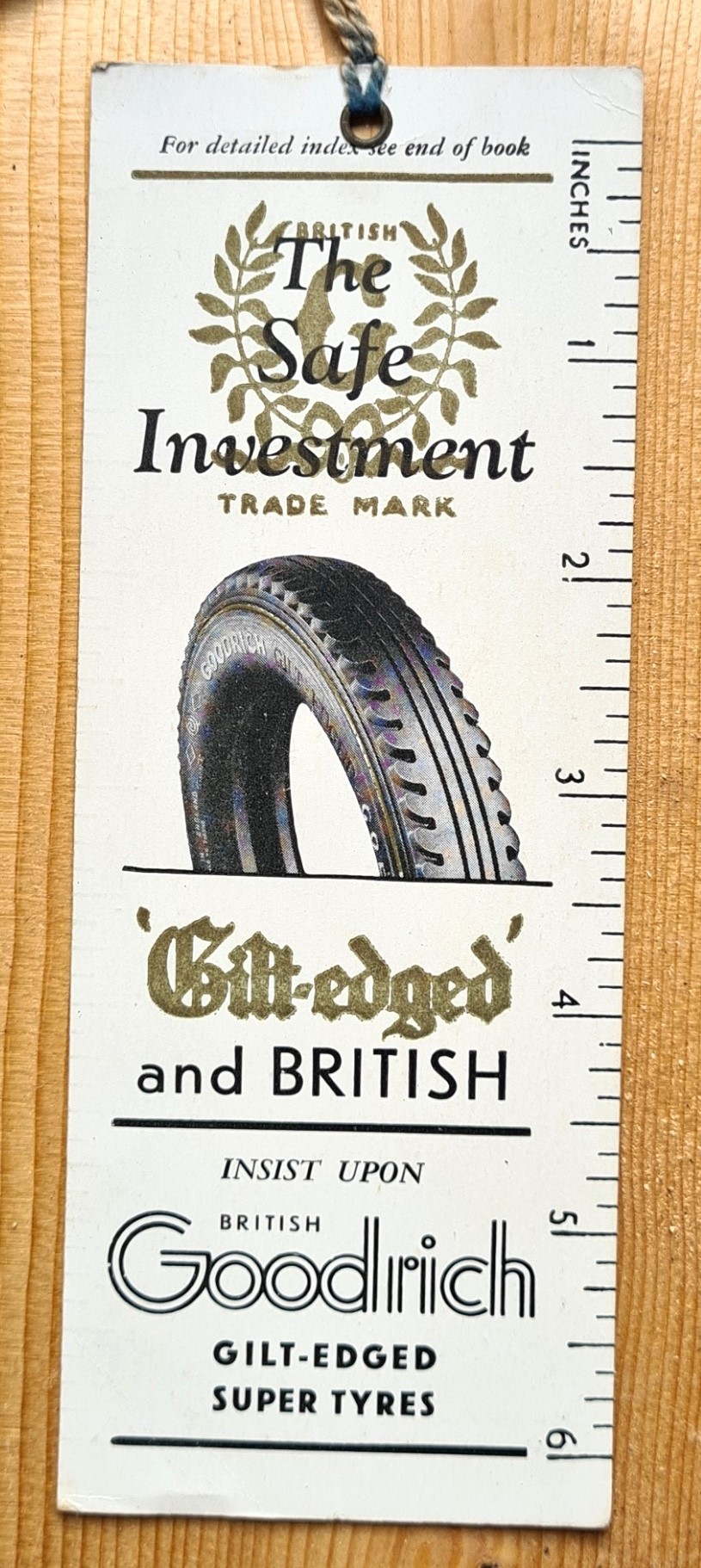 If the bookmark measure were detached from the RAC Guide and Handbook, there is nothing on it to identify it as an RAC product. Each side of the RAC bookmark/measure carries an advertisement for British Goodrich tyres. This was part of an advertising campaign reinforcing the availability of British made tyres.
