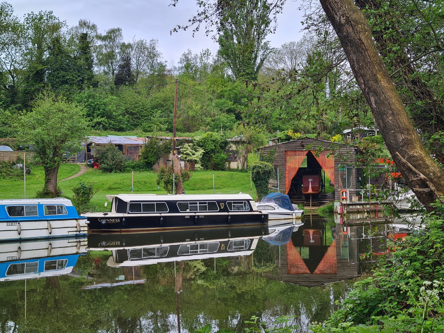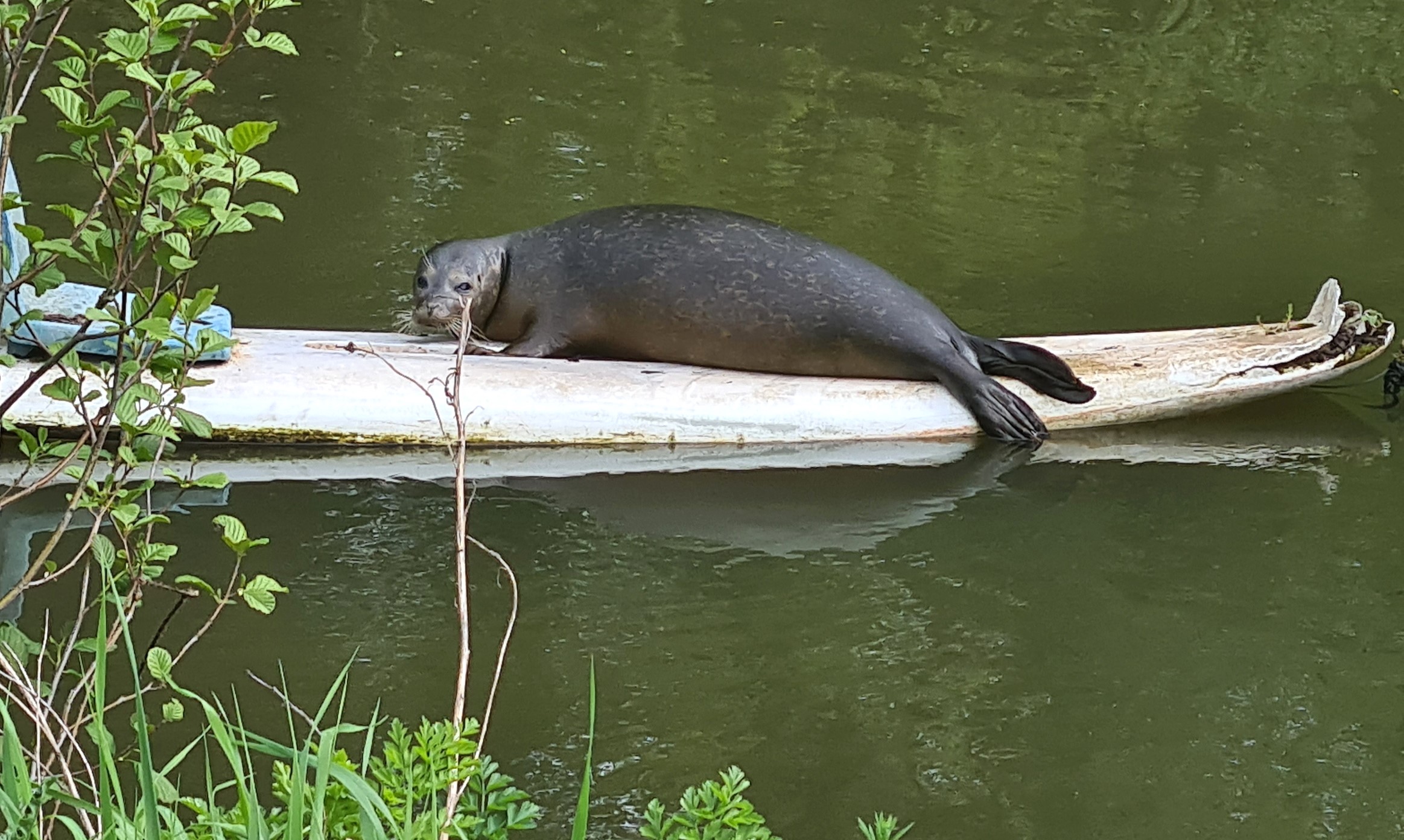 Reaching Yalding I realised I was going to have to get a move on if I didn’t want to get caught in the forecast torrential rain. If the path had been easy enough so far, it became even more so, wide grassy wides or stretches of gravel, and I knew that tarmac would take me the final couple of miles into Maidstone. It was very obvious that a great many people were out enjoying the coronation bank holiday. Families and couples were walking the banks, cyclists passed me frequently and I began to see increasing numbers of boaters doing what boaters do most, sitting down on or beside their stationary boat. Other than these people, I saw few mammals over the two day walk. The occasional rat scurried around the odd boatyard and I doubted I would catch sight of what was purported to be the largest mammal on the river, the Otter. I later found out that there are none of this elusive animal anywhere on the Medway. Though I did have a surprise just before reaching Maidstone. An unconcerned Seal lay on a paddleboard, no doubt sleeping off a bellyful of fish.