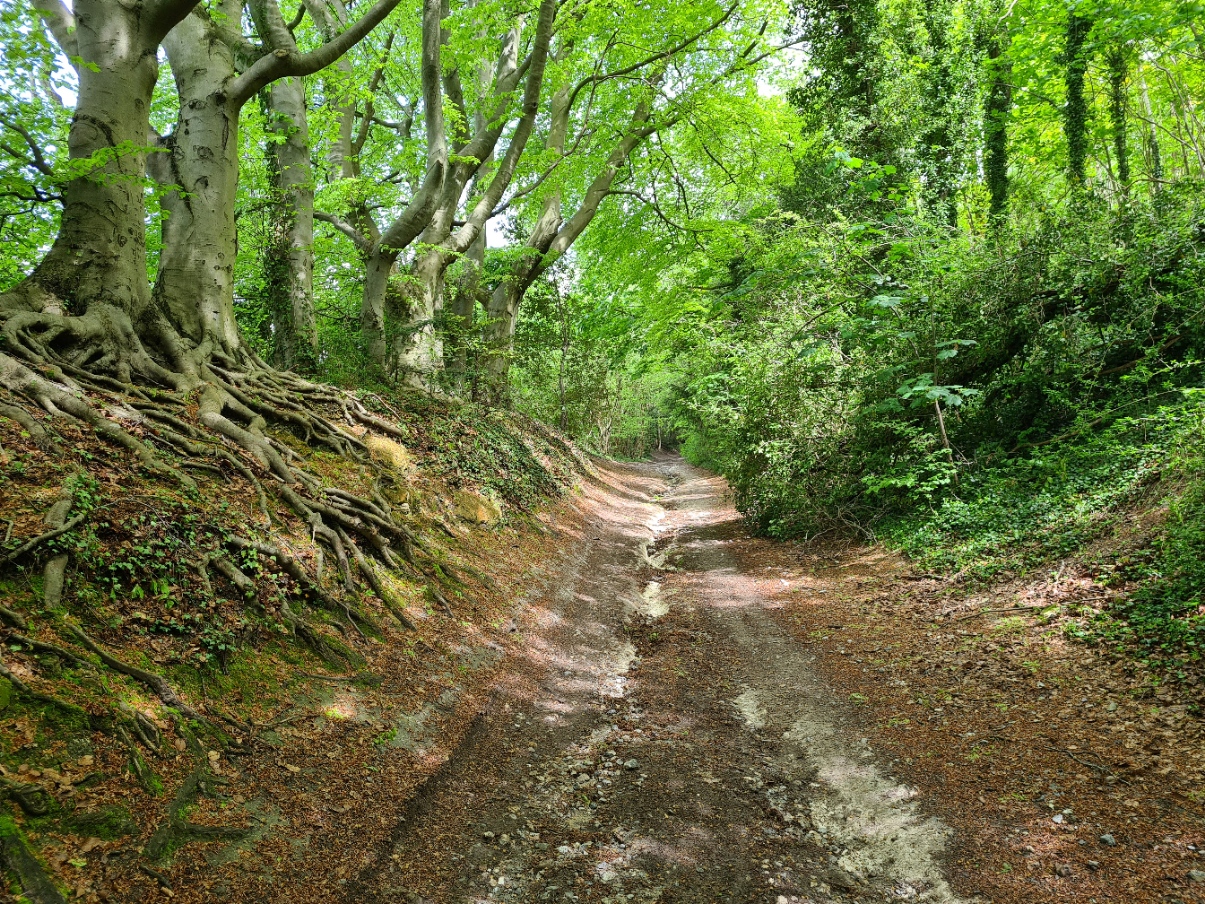 In to and back out of Wouldham, turning right out of the village to begin the steady climb up the chalk slopes to join the North Downs Way that overlooks the River Medway in the valley below. I stopped for a brew-up, to accompany my sarnie, watching the High Speed trains hurtling through cuttings at Nashenden toward the continent.