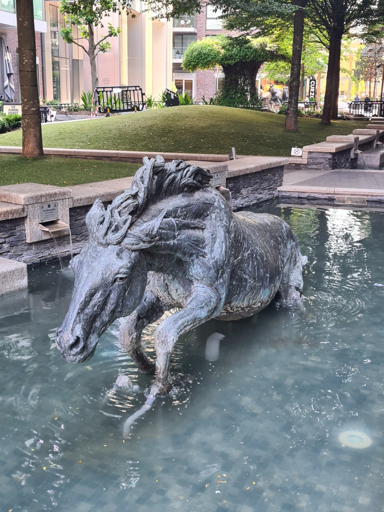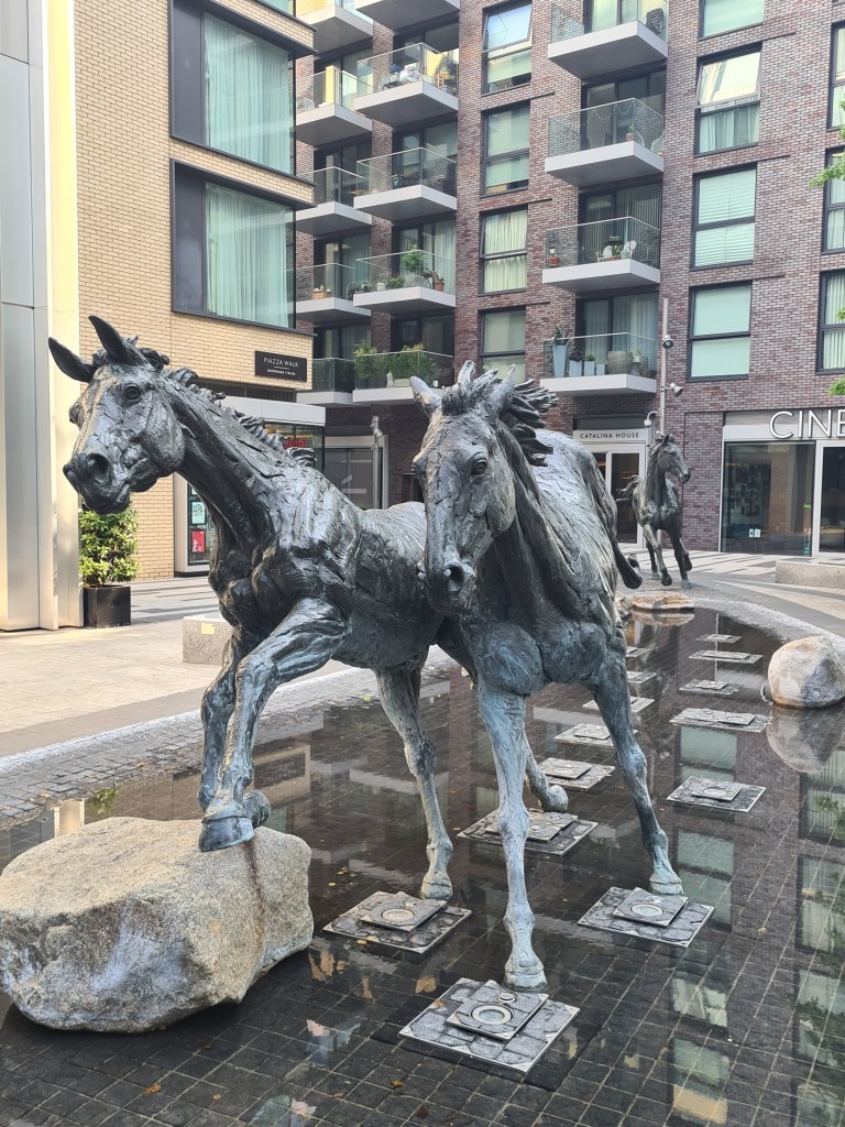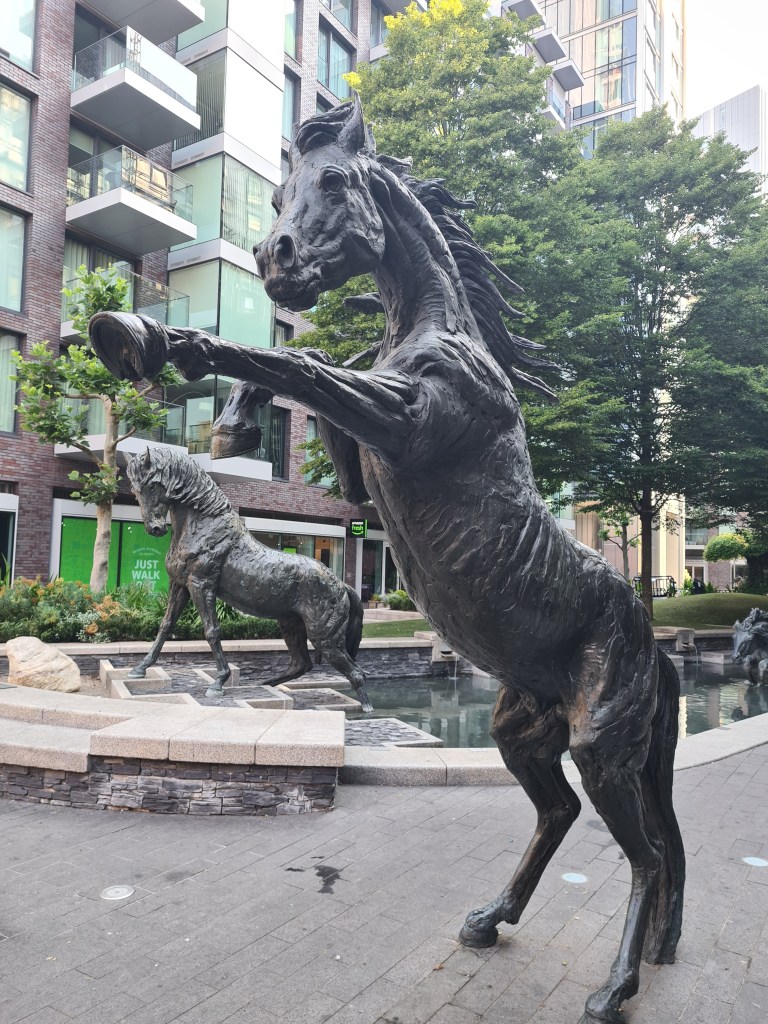 Our room at the Buxton could, without any hint of pretension, be described as bijou. I wish we had slept better, but Brick Lane apparently never sleeps, not until around five in the morning it appears. We treated ourselves to the Full English for breakfast. And a very relaxed occasion it was too, leisurely taken, with soft music in an unhurried ambience. It was with only slight reluctance that we finally departed for our final day on trail. This commencing with a mile walk back to where we left the Thames Path yesterday afternoon. Just for a change, no rain is forecast for the day. Just strong sun and high temperatures. The walk back to the river was mostly uninspiring however I was much taken with life size sculptures by Hamish Mackie depicting the occasion when six horses careered through London until corralled by wall to wall traffic in Leman Street.