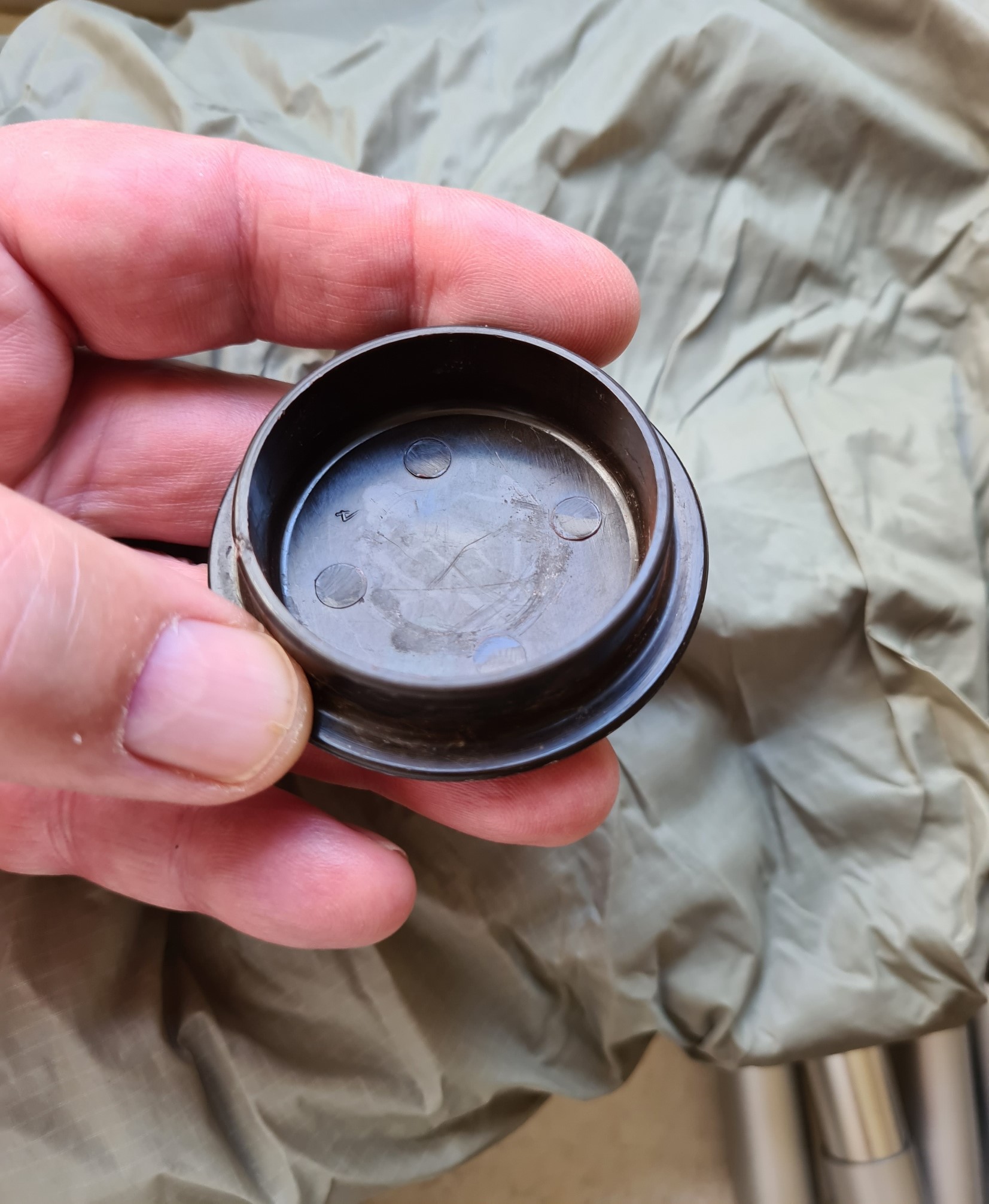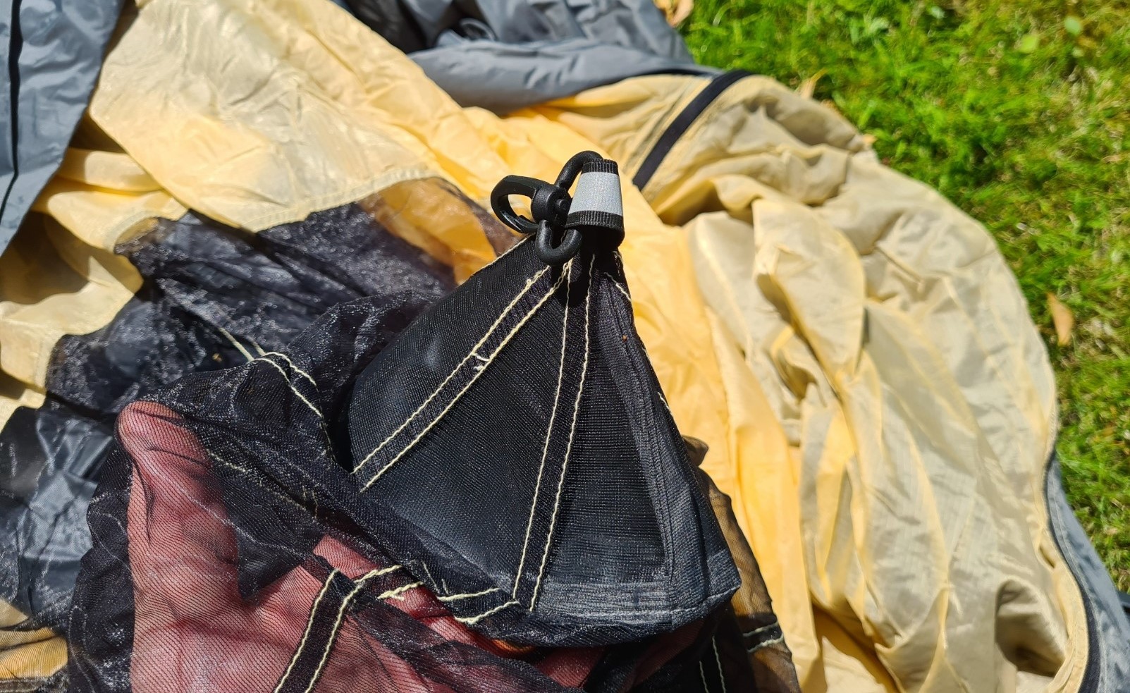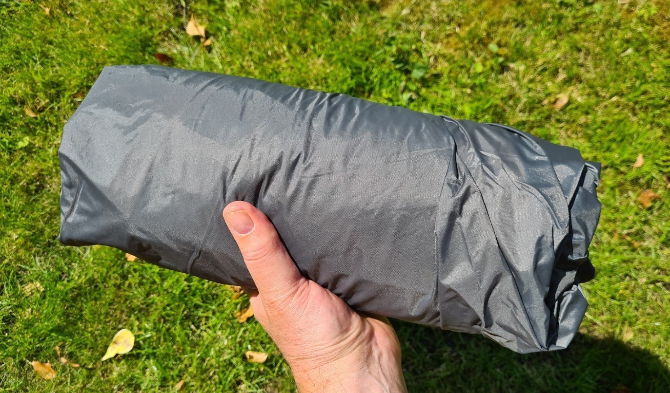 The top of the pole nestles into a reinforced section of the nest or fly and the entire pole is adjustable in length. The bottom end of the pole can slowly sink into soft ground over time, lowering the peak. I just included a small 10g plastic cup that was made to go under the narrow feet or castor wheels of armchairs, and placed the end of the pole in that to spread the weight. If attempting to sleep three inside, the pole can be offset to one side at the bottom to allow this, but it isn’t an ideal set-up in this fashion.