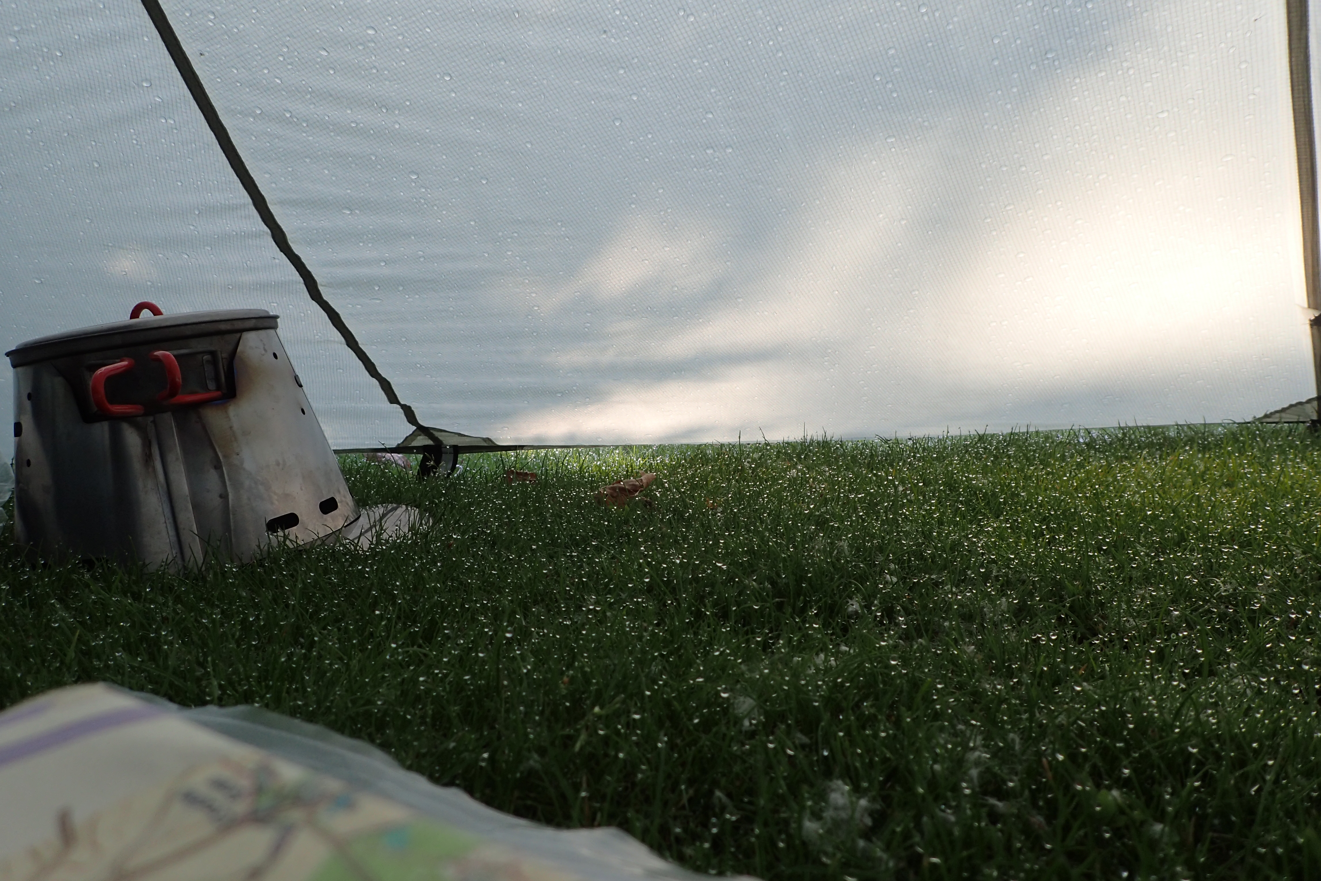 The WickiUp 3 SUL is a large tent with a large footprint. Large enough to bring a cycle inside. It requires a large area on which to pitch and isn’t the most forgiving of lumpy ground. If you want this tent to stand up to bad weather, it has to be pegged well as just all of its stability is dependent on the pegged circumference. Hence the beefy tie-outs around the circumference of the fly. Time taken when pegging is time well spent. The SilNylon outer will sag when wet which can mean that it then touches an inner, which isn’t ideal. So despite it occasionally tipping down outside, and a design that means rain comes in as soon as the zip is undone, you have to exit the tent and tighten guys if the tent is sagging. If you are fortunate, you can simply heighten the pole on it’s adjustable section and that will tighten the shelter from within. On wilder nights, in horizontal rain conditions, rain can be driven in through a vent onto the inner nest or occupant. There isn’t much you can do about this other than try and pin the offending vent closed.