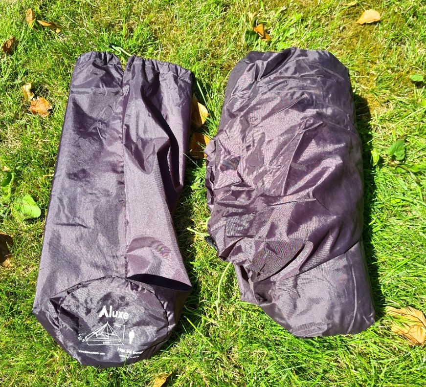 My outer fly weighs 797g, the full nest, with three quarter solid sides and remainder mesh, weigh 938g. The stuff sack weighs a further 44g. My third party half inner from Luxe was a weighty addition at 643g, in a 26g stuff sack. The collapsible four section adjustable pole weighs 314g and the lighter alternative, a walking pole extender link, is 46g. Pegs need to be added. At least six are required, and as many as twenty if using all guy tie-outs. At it’s most minimal set-up- comprised of fly, pole link and pegs, this provides a large covered shelter for less than a kilogram.