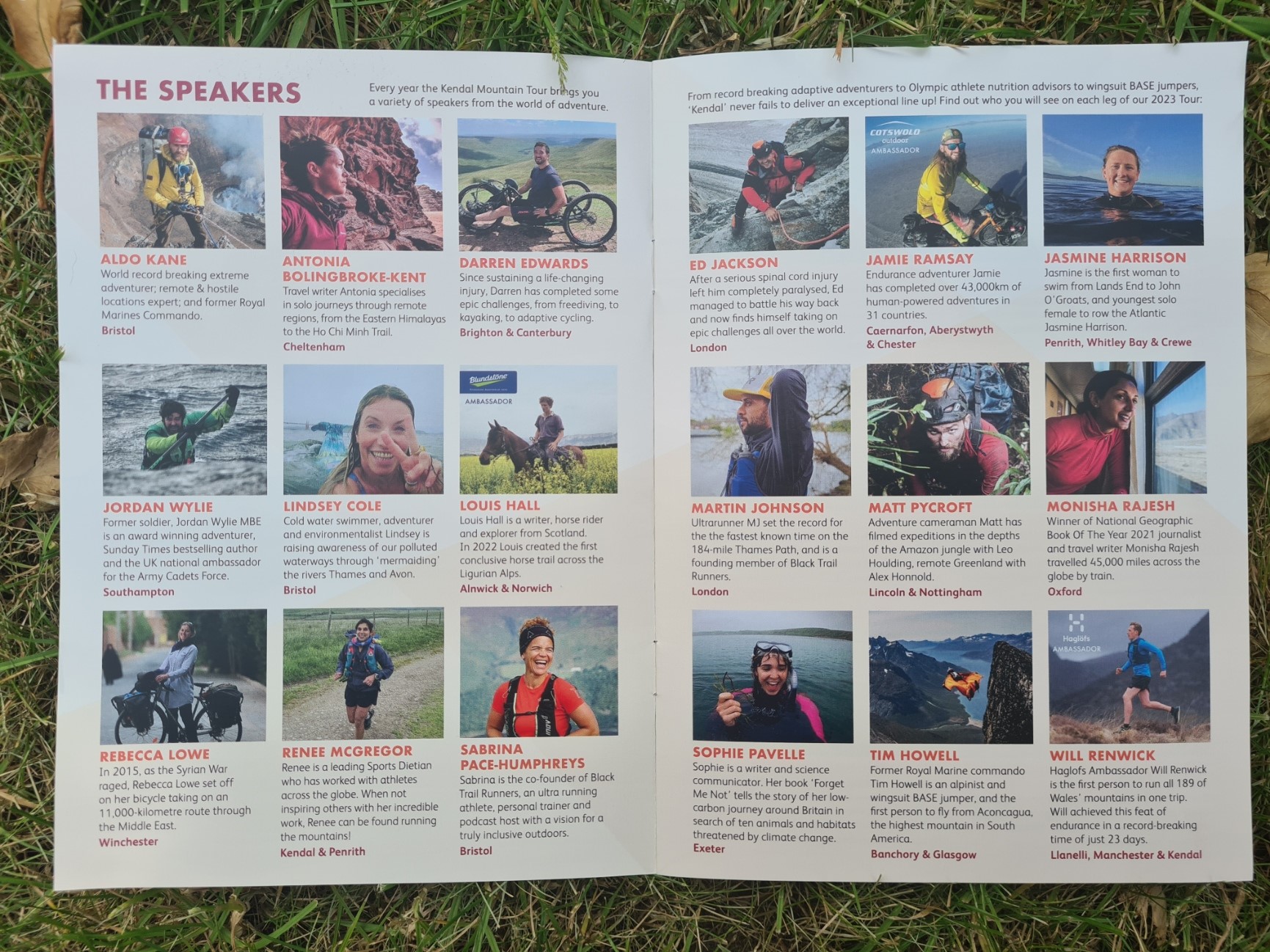 Thirteen films had been selected by the organisers for the 2023 Kendal Mountain Tour. Not all are shown at each venue. The choice from the larger curated annual selection varies from venue to venue. Films shown on the tour are short, frequently award winning and diverse. A very much larger selection, including feature length, are shown at Kendal during the Festival. A speaker is included at each venue, drawn from the world of adventure and outdoor recreation, details on who will be appearing at which venue are included in the tour programme.