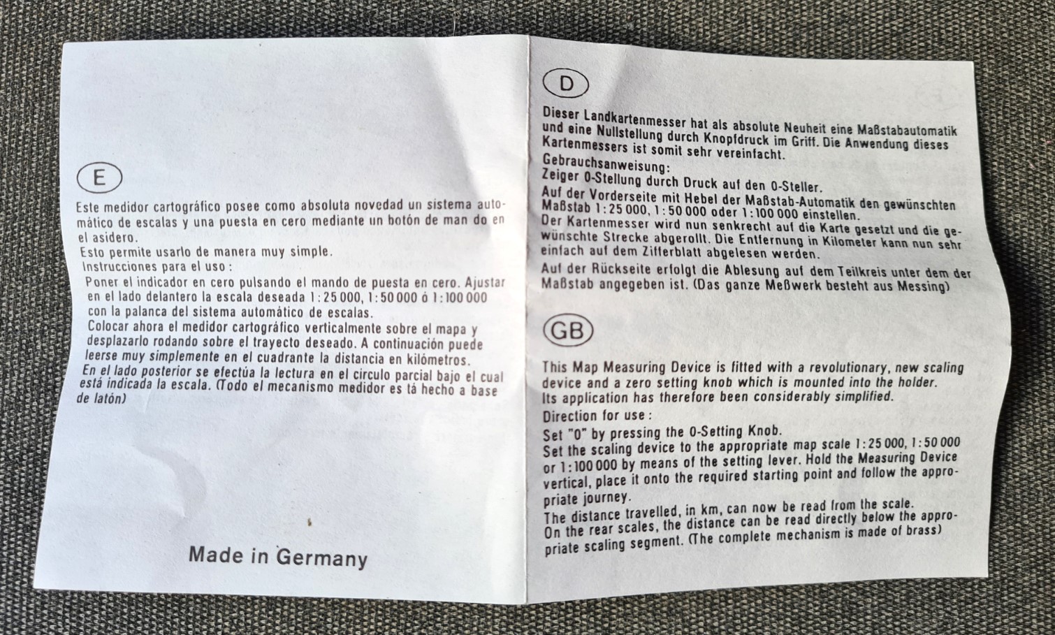 “this map measuring device is fitted with a revolutionary, new scaling device and a zero setting knob which is mounted into the holder. Its application has therefore been considerably simplified”