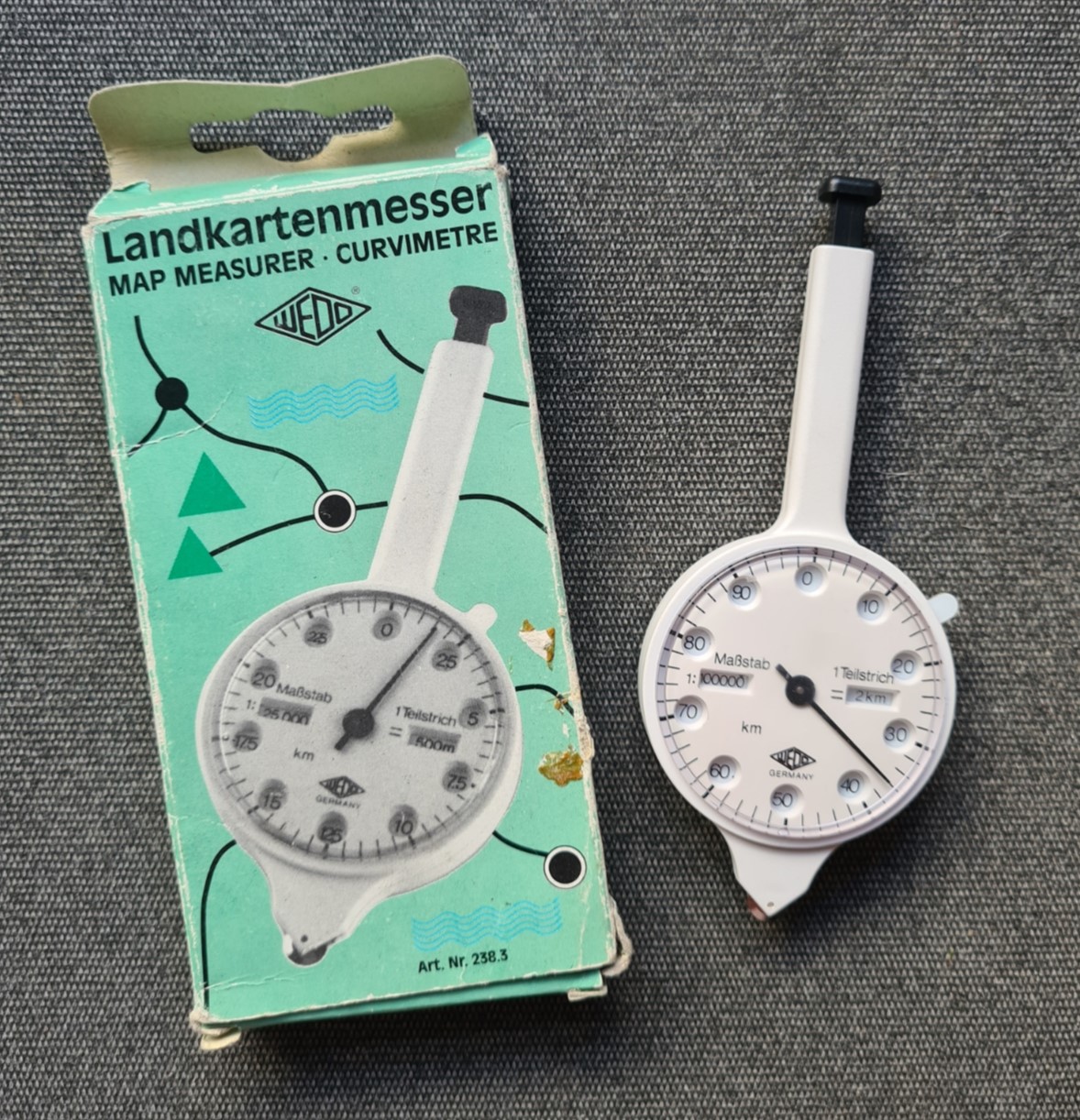 The WEDO map measure appeared as their Art. Nr. 238.3 model, and has a wide range of kilometre scales. The front face has two windows on the dial, one shows a changeable scale (Maßstab), the other window indicates the divisional increments (Teilstrich) around the dial. Moving the switch on the outside of the case rotates and changes the scales viewable through the ten windows around the circumference of the front dial.