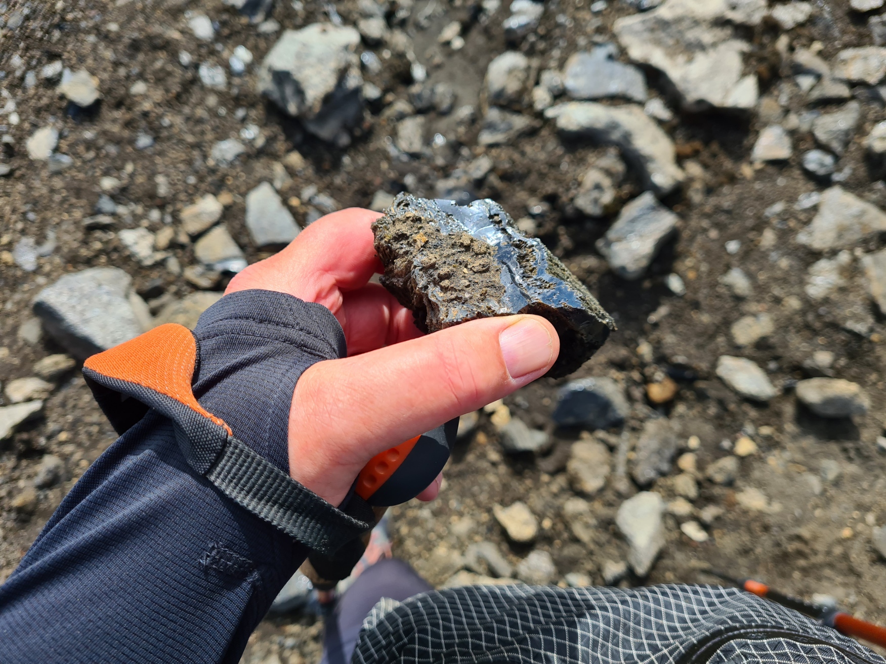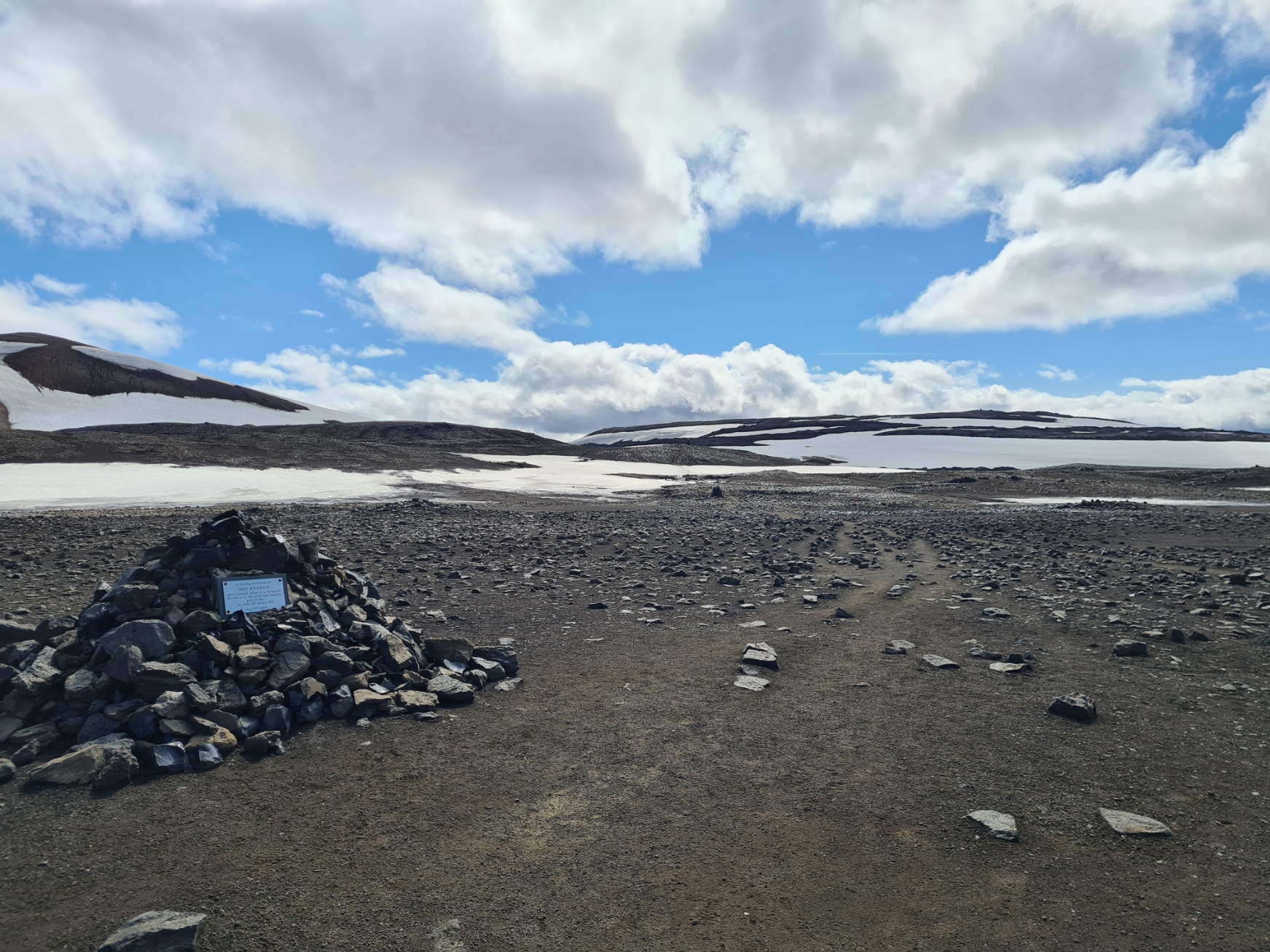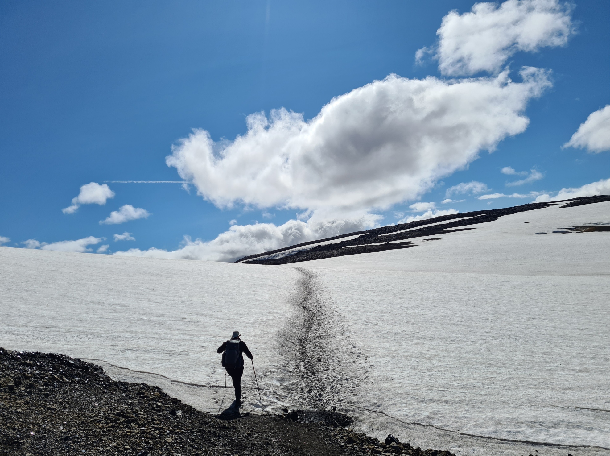 I started to encounter snow fields, despite it being high summer, the only time when this trail can be hiked. Snow never leaves many parts. This is often melting from below, either as a result of running water, or due to a ground surface warmed from below. This can make crossing some patches of the white stuff, especially in ravines, a bit dodgy. In some summers it can be treacherous, people have died here on trail or got into trouble and I was extremely fortunate in how good the weather was. Also, nearing the huts, I passed through extensive areas littered with black glassy obsidian rock.