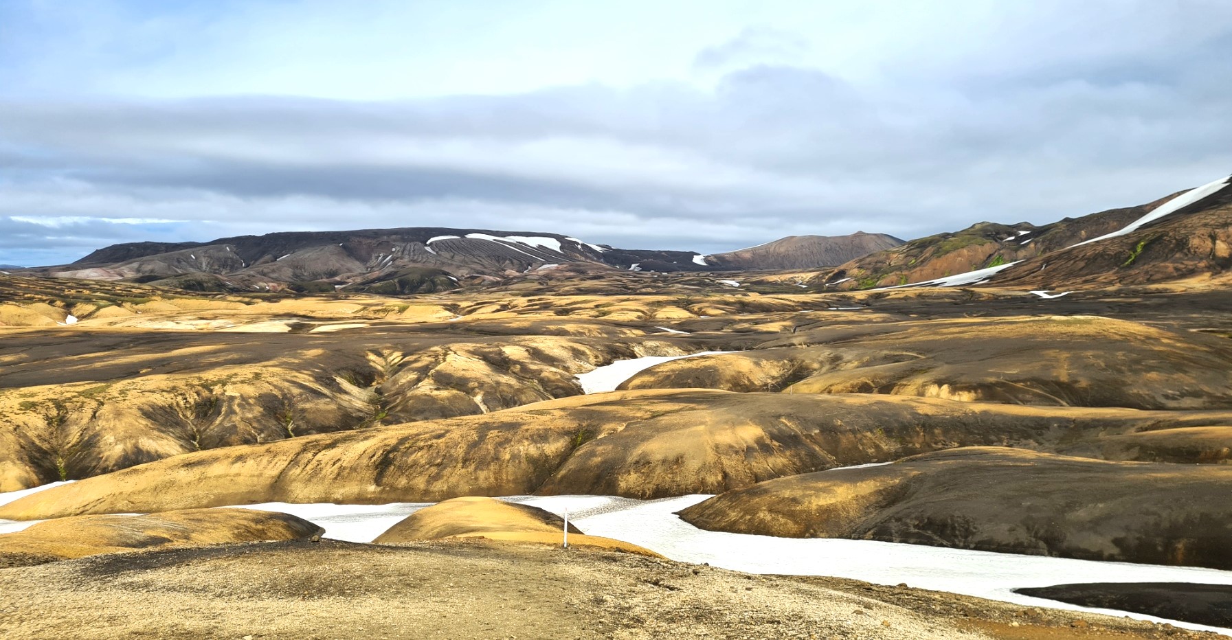 It is a spectacular first day on trail and volcanic activity surrounded me. I was determined to take my time and enjoy it all. I stopped to photograph constantly. The trail first runs through the Laugahraun lava fields, concurrent with one of the day hike trails, many visitors to Iceland wish to get at least a flavour of this area and shorter walks take in the Brennisteinsalda volcano, the Bláhnúkur mountain, or the Suðurnámur mountain ridge. That said, I was pleased to eventually reach the point where my trail went one way, and the, if not hordes, but certainly plentiful visitors, went another. The hills are an amazing range of colours, mostly due to the rhyolite, which is a type of volcanic rock made of quartz and silica. Minerals such as iron and sulphur add extra colour.