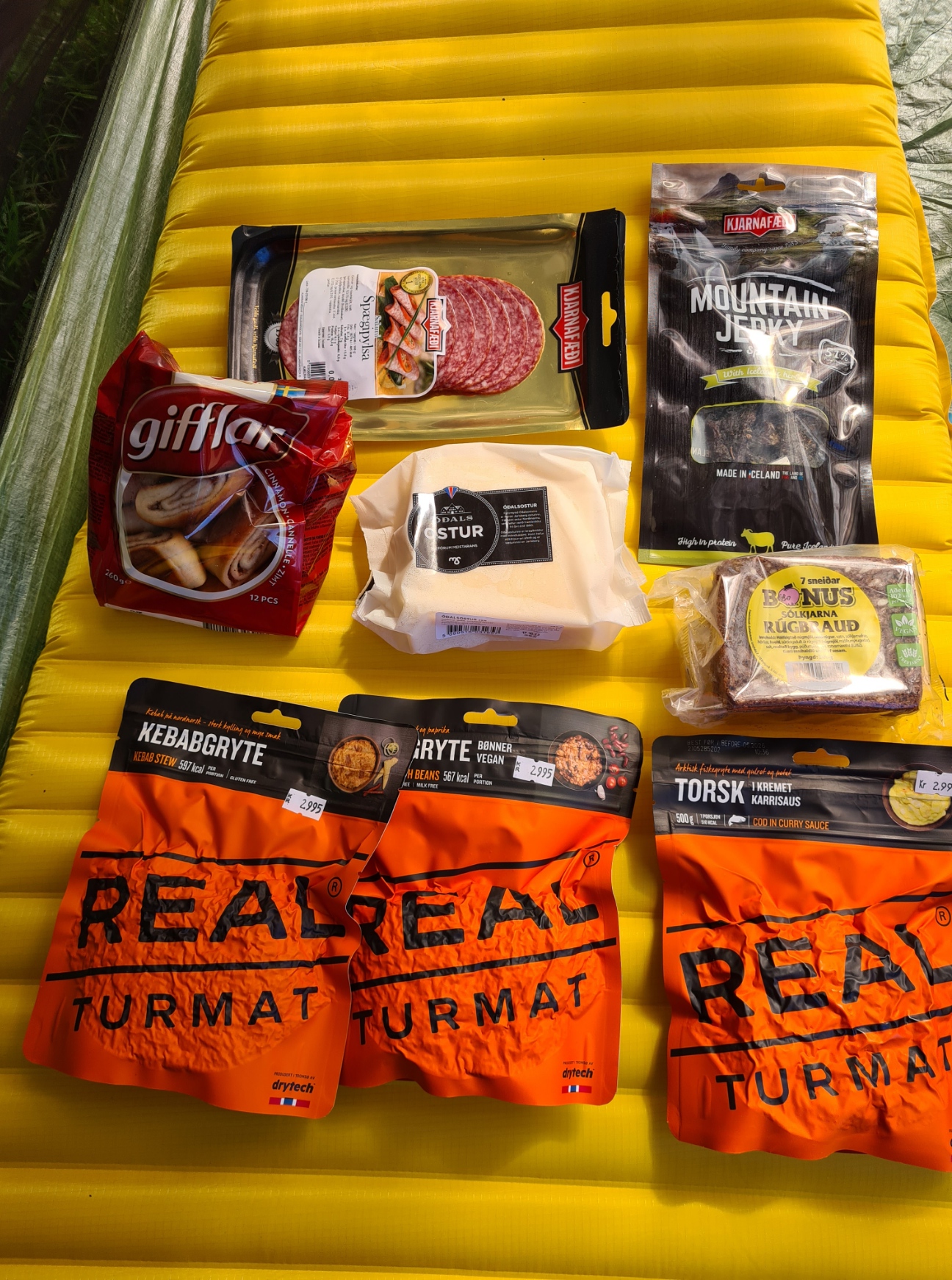 I had bought some food from the UK with me- a couple of Bla Band dehydrated meals (the best there is in my opinion), bars, decent chocolate and a brew kit that included some hot chocolate. So I then walked to the Nesti at the adjacent petrol station to see what food they had to add to this. Finding nothing I wanted I did note they also had gas canisters; screw valve, nozzle and pierceable Campingaz, also liquid Colman fuel. On my freebie paper map I plotted a route to the campsite, about an hours walk away, via the Everest outdoor equipment shop at Skeifan. Here I was able to buy a handful of Real Turmat dehydrated meals for the evenings. These had also been available back at the bus station, but I had hoped for a wider range, then into the Bónus supermarket opposite for a perfectly adequate choice of supplementary food for other meals on trail, mostly rye bread, cheese, salami and pepperoni (I hoped cooler temperatures would allow meat to last two or three days) and cinnamon buns. From there, it was a twenty minute walk to the Eco-Campsite, situated next door to the busy and ‘very noisy-’til-late’ sports grounds and facilities