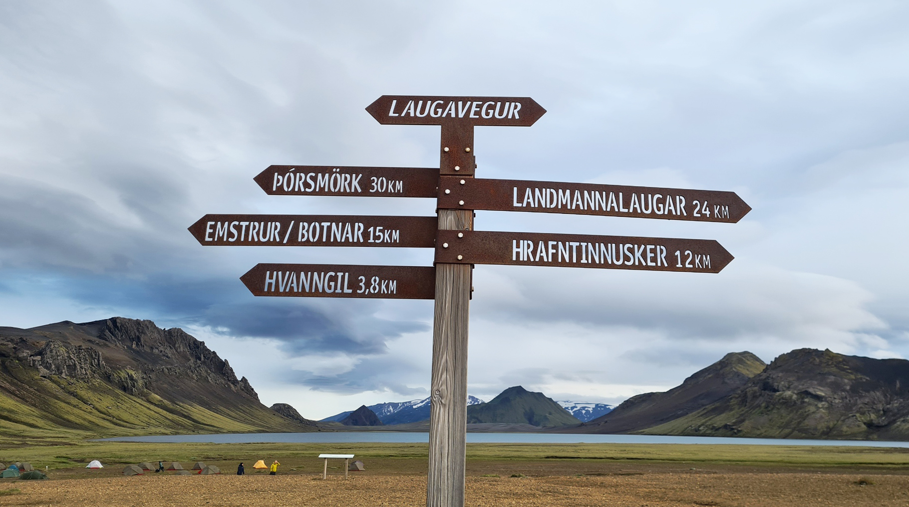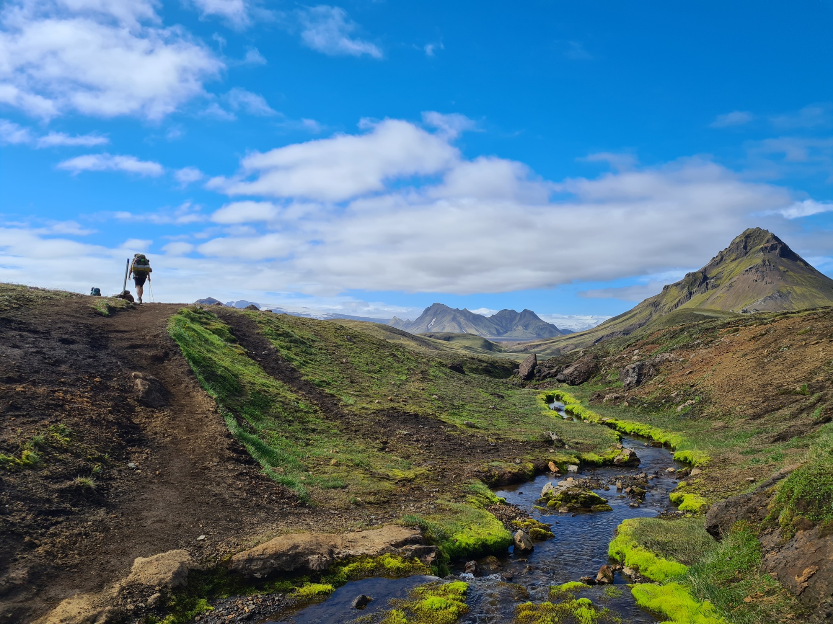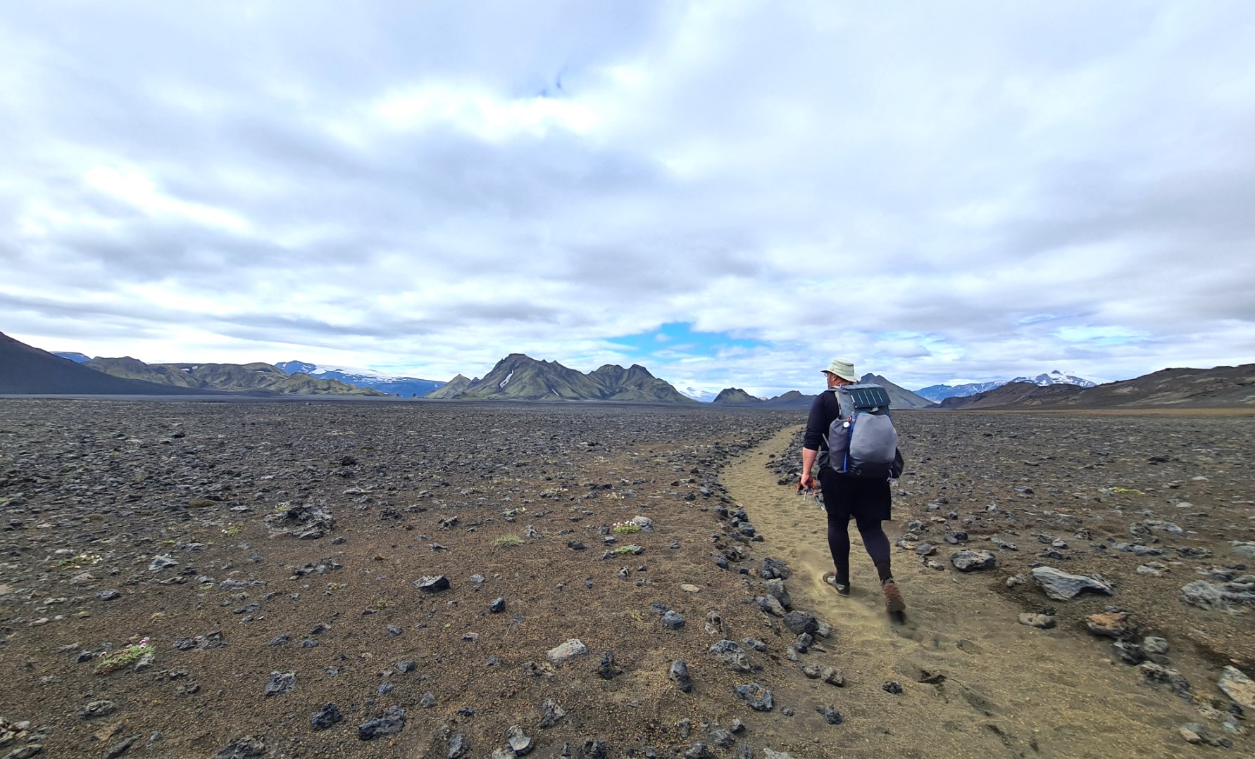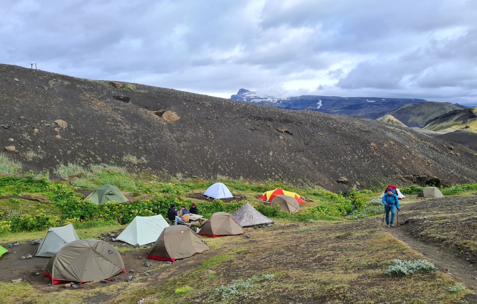 My walk across the ash desert coincided with the annual Laugavegur Ultra Marathon that takes place along the trail’s length. I am amazed no one had broken a leg or fallen through a snow bridge and perished. A few were sporting bloody injuries where slips and trips had occurred. I stepped off trail or to one side whenever I could as they approached from behind. The runners didn’t bother me. What did annoy me were the infrequent but incredibly intrusive checkpoint stations for the athletes. Music blaring from speakers could be heard, literally, miles away. Passing through each checkpoint garnered a cacophony of clapping, bells vigorously shaken, shouts and whoops. Even I got congratulated. I am sure it is great motivation for the runners, but I found it all just a bit grating. Or perhaps I am churlish and getting old. I actually had comparatively few of the 579 runners pass me (no, I didn’t count them) until my final river crossing at Innri–Emstruá when numbers slowly built. But it was when I was pitched for the evening later, that the great majority passed through that checkpoint.