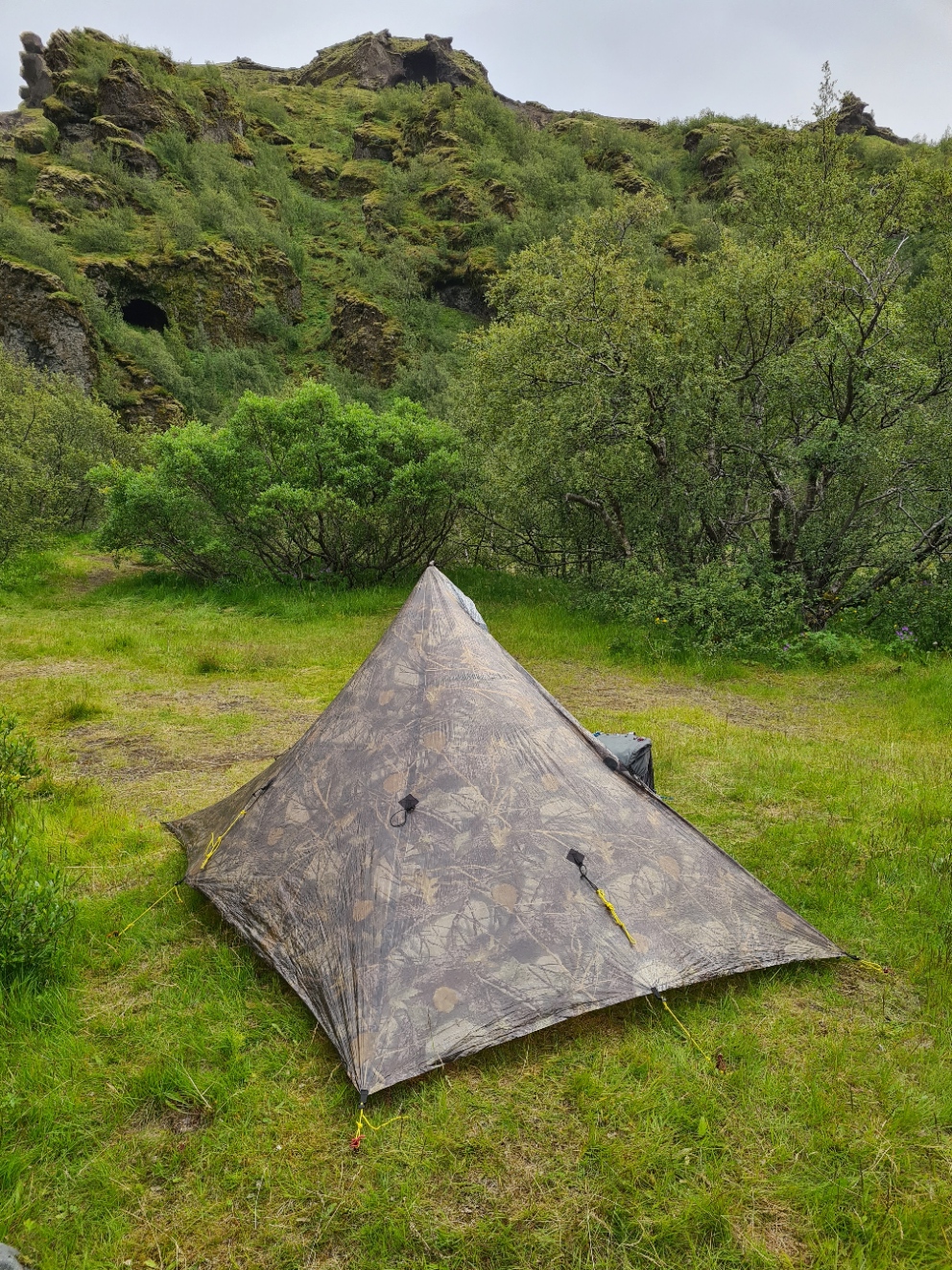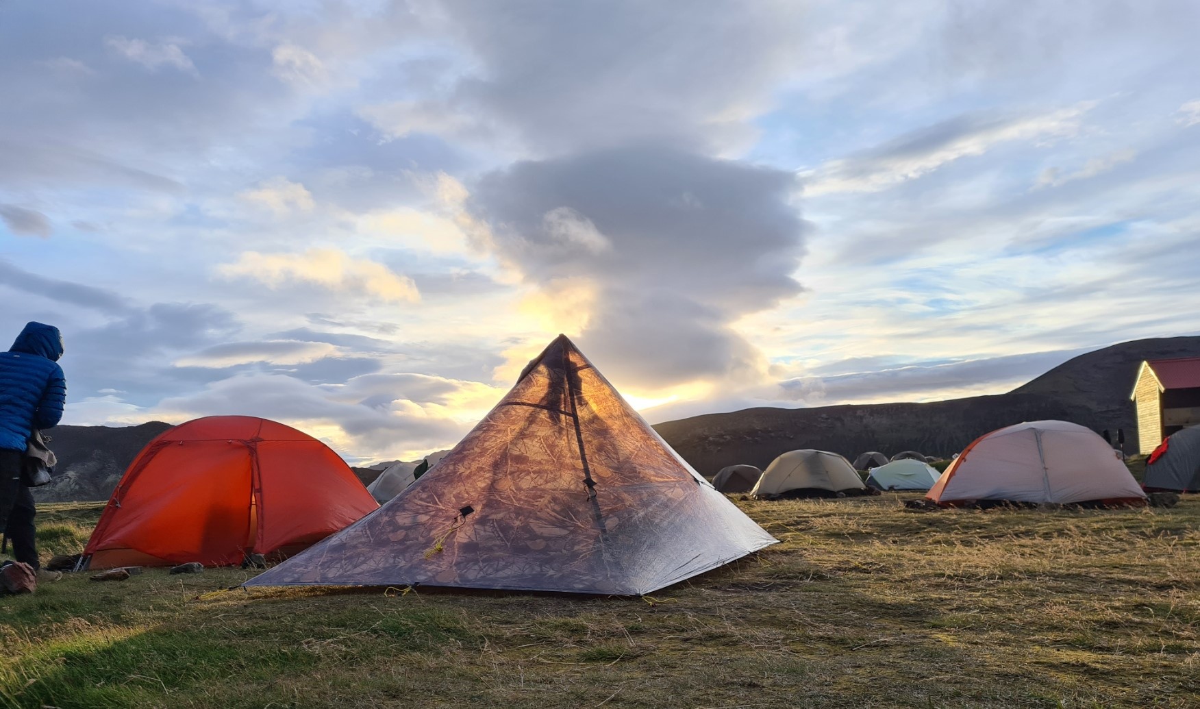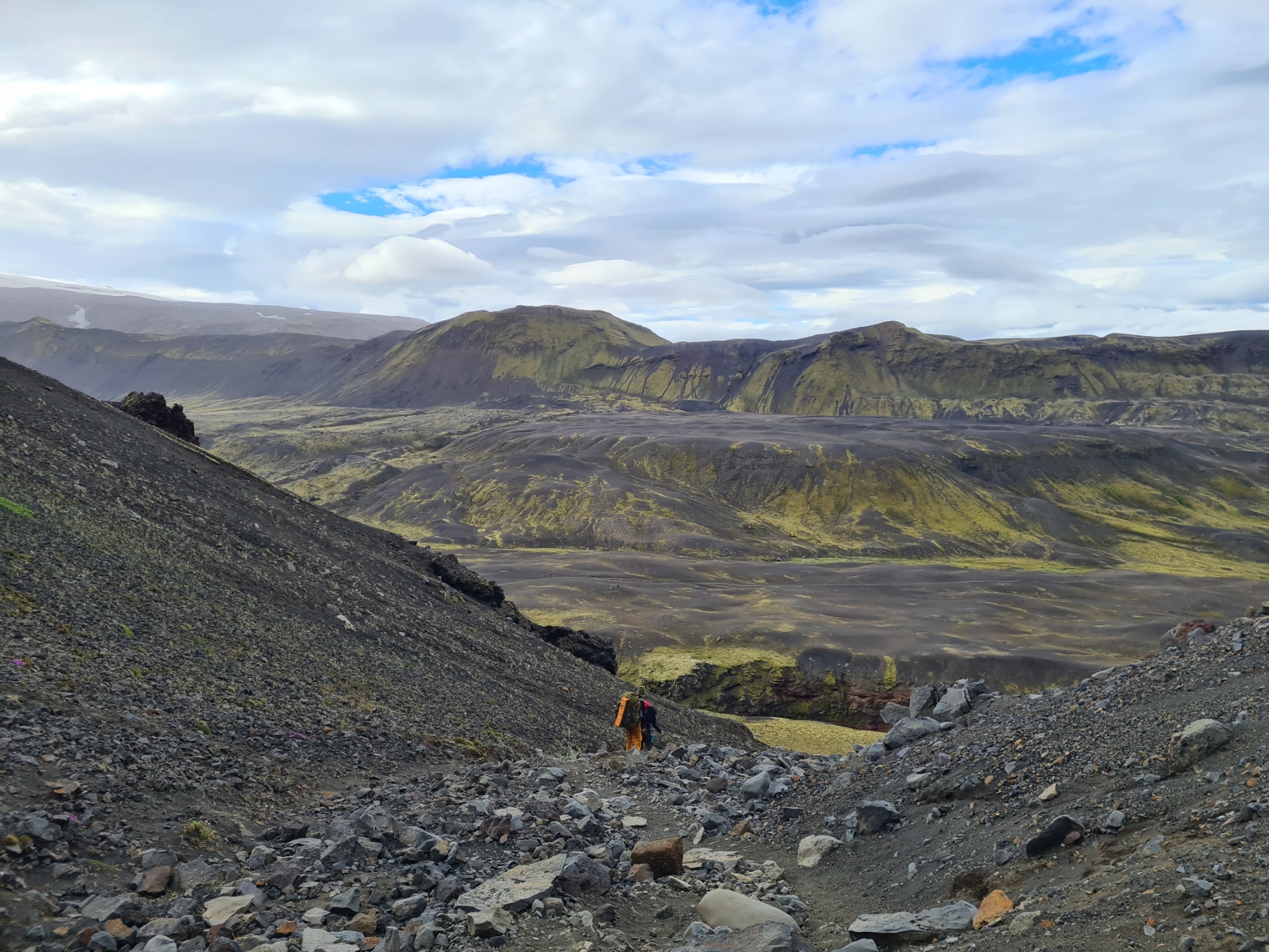 I slept fairly well. The white noise from a small stream just a few feet away masking any snoring from nearby campers. A cold breeze had sprung up during the night, which didn’t bother me in the slightest and meant that, again, no condensation issues in the DCF Duomid. I was the first to rise and sat at a little picnic bench drinking tea with cheese on the last of my rye bread, slowly consumed while reading. As usual I was in no hurry. The other campers, one by one, rose, packed, and I was content to watch them leave, quiet best wishes and waves all round. This was the final day on the Laugavegur. A bit longer than previous days and I was quietly anticipative at what I hoped would be another interesting day on trail, crossing the deep Markarfljot canyon, climbing in and out of small ravines and valleys on the way.