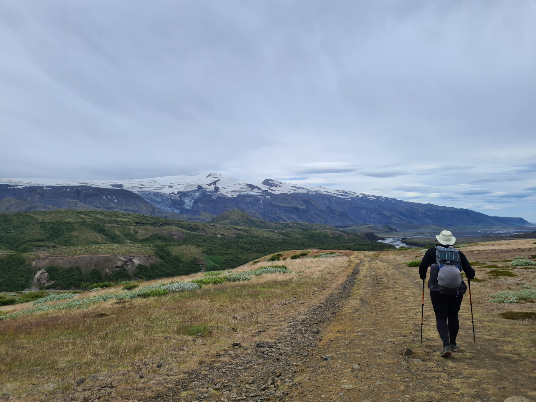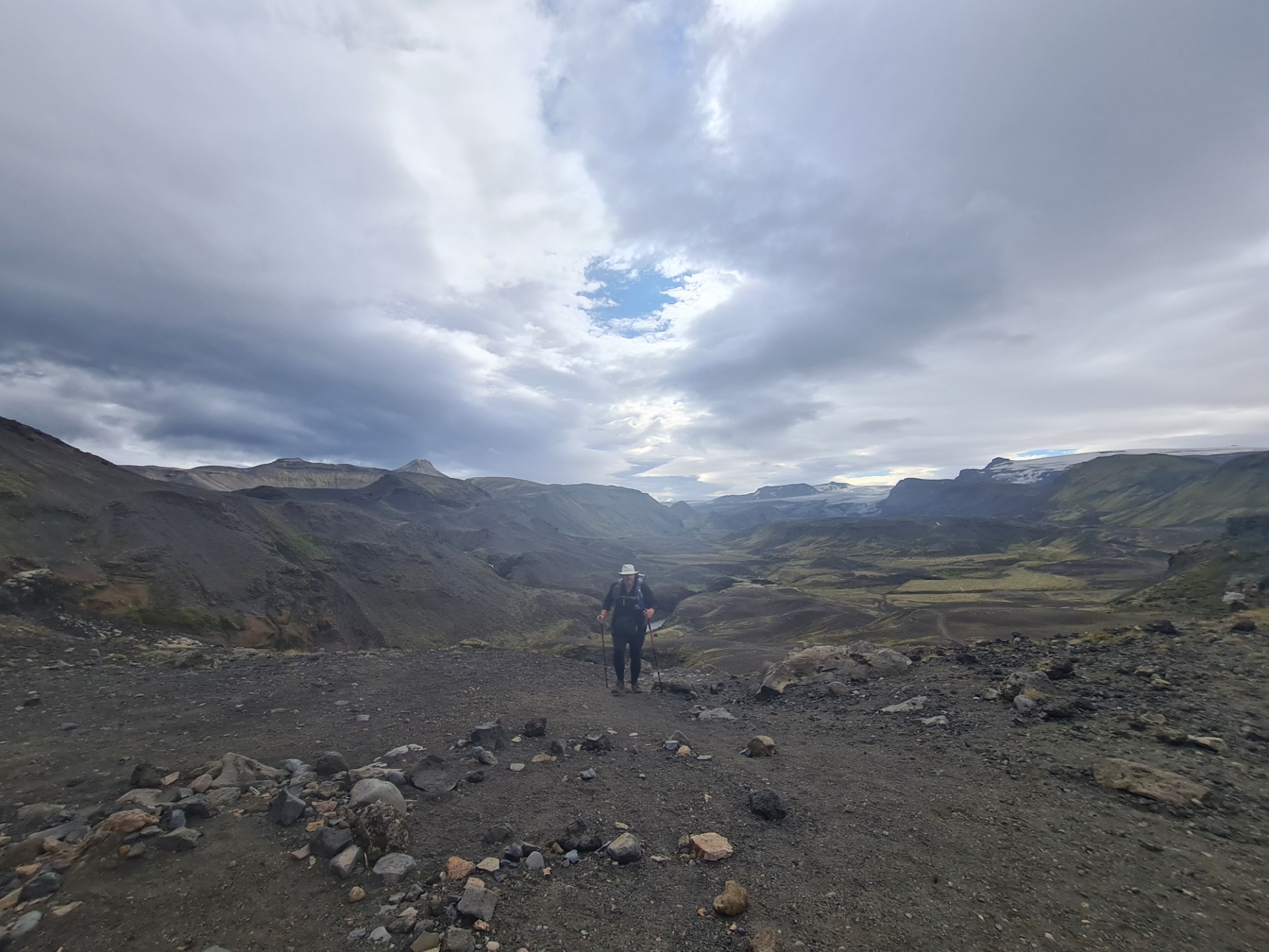 Two more wide rivers are crossed, the Kaldaklofskvisi and Innri–Emstruá, fed by the mighty Mýrdalsjökull glacier, however both of these have decent bridges. I may have given the impression there are a lot of hikers on this trail. While there are certainly a few leaving the huts and campsites each morning, these soon spread out and since I had left Landmannalaugar it was often that I looked across the exposed miles before and behind without a soul in sight. That was not to be the case for me today.