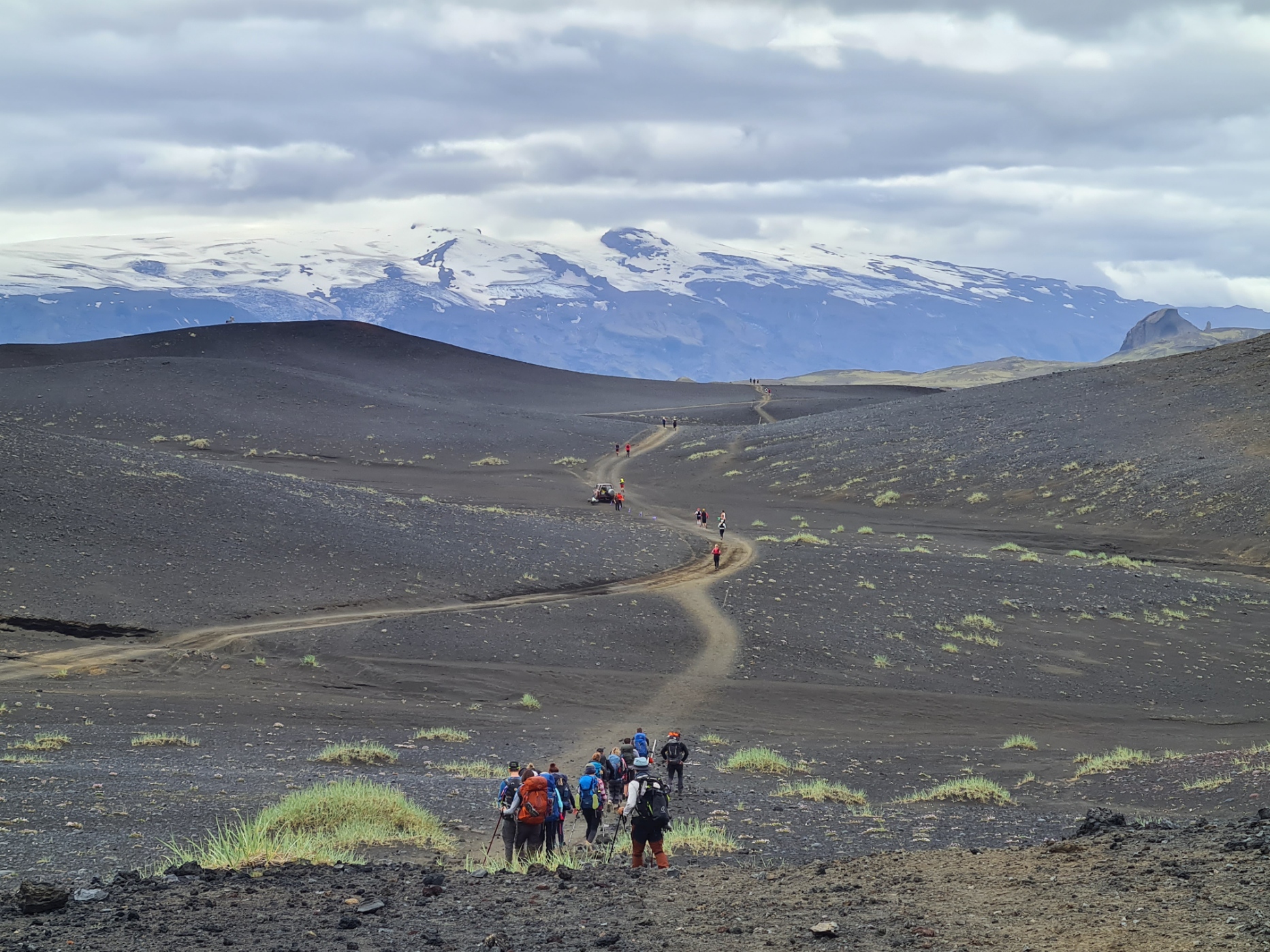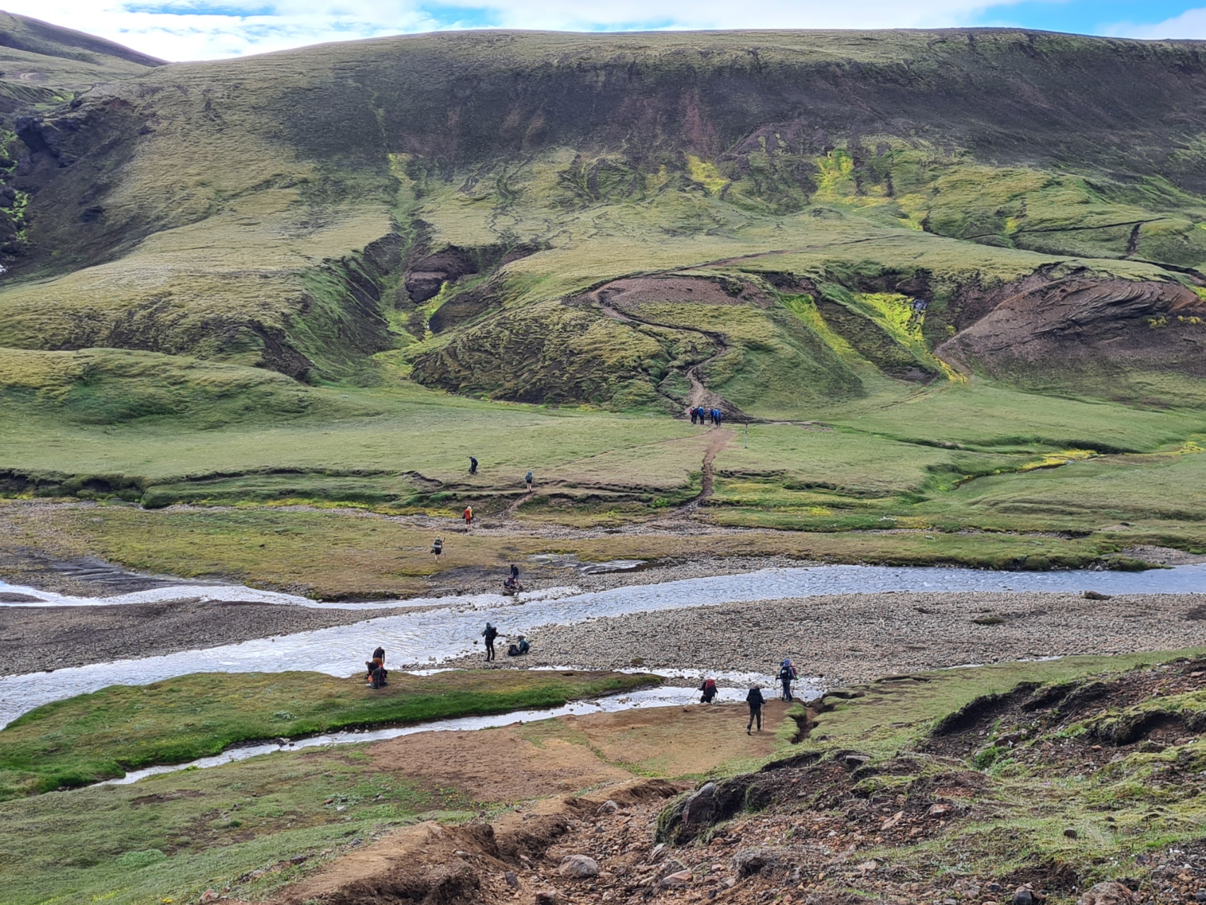 Almost all other hikers simply walked straight past the huts without halting. I may have been at the back of the pack again, but once through the black lava flows, I caught up with most, again, at the wider Bláfjallakvísl river crossing further on. We were all directed to cross a little further up the river by a race official keeping the usual crossing clear for runners.
