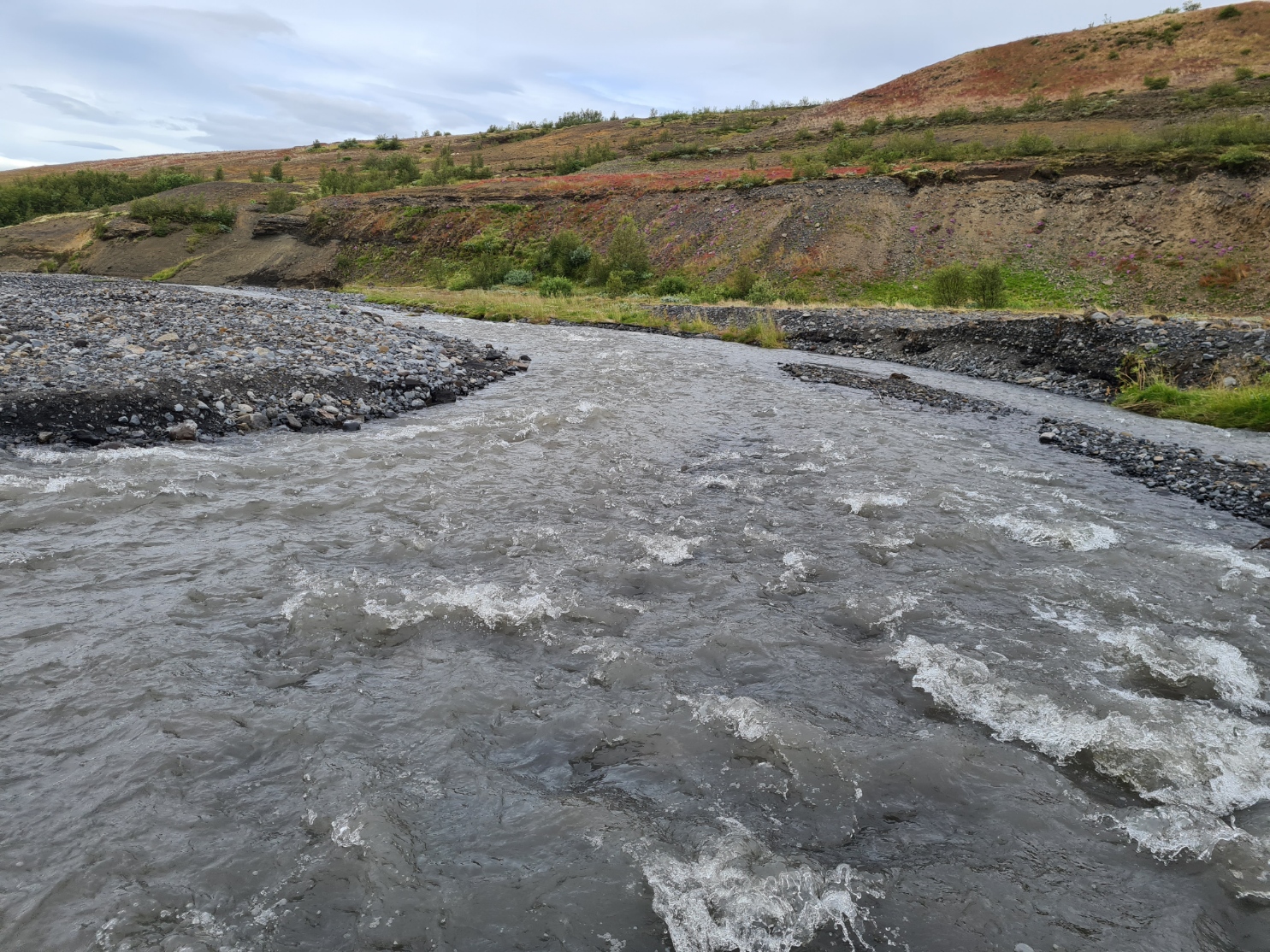 The river Þröngá meanders through a wide gravelly canyon. Þröngá means narrow, which is an odd name for what was a pretty wide crossing. This is a lonely place to come unstuck and again, I took care. Trail shoes remained on for grip, hip belt was undone, most electronics and pack contents double wrapped, face upstream and carefully test my way across the rocky, uneven river bottom. It was an easy crossing. I sploshed out the far side and carried on, water gradually squeezed out of the porous breathable Altras.