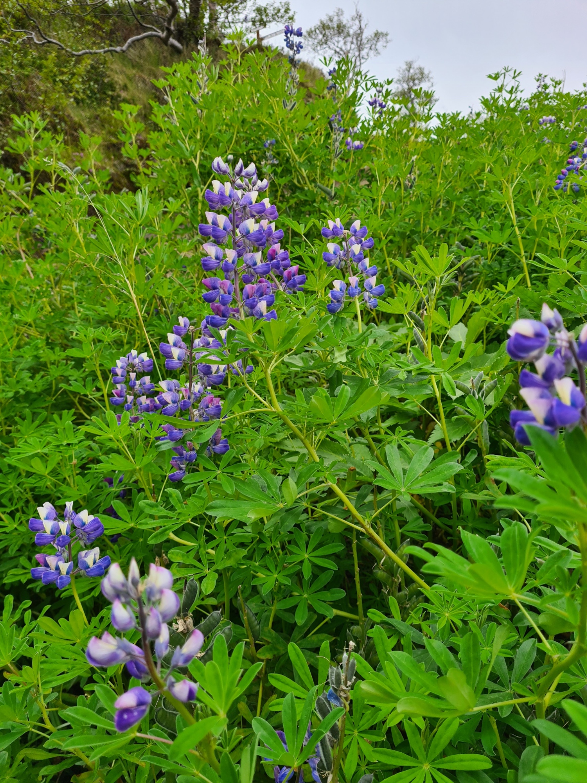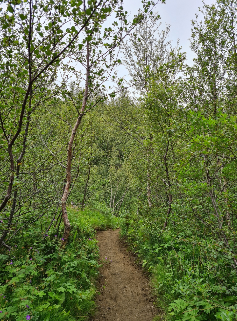 The trail again changed dramatically. I entered Hamraskógar, a forest of birch and other trees and part of Þórsmörk (Thor’s Forest), mostly naturally regenerating but assisted along by the authorities. It is reckoned that Iceland once had as much as 25% of its surface forested. The Vikings arrived and in their ignorance cut down most of them. The fragile thin soil simply blew away. Only about 1% is now forested but efforts are being made to increase this. I now had grass beside the path, sedges and moss abounded. Ground flora is now protected from grazing and is thriving, sadly including the invasive lupin, a problem plant across much of Iceland.