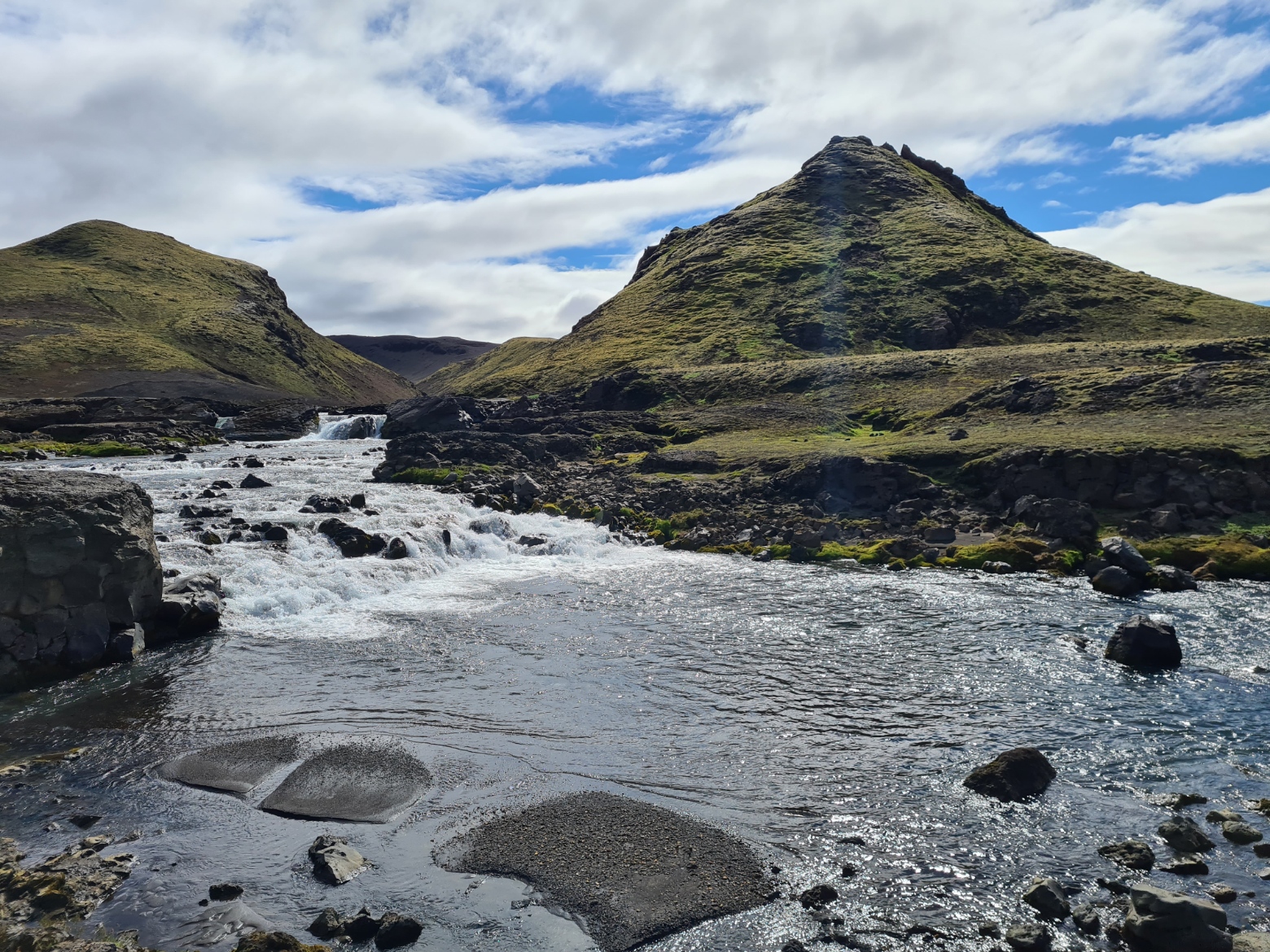 Leaving Álftavatn, the trail heads toward the Hvanngil chasm, crossing the Bratthálskvísl river en route. This is a shallow easy river and, as usual, became a bit of a bottleneck while hikers changed into and out of river shoes. I simply waded across in my trail shoes, leap-frogging twenty of so hikers in the process.