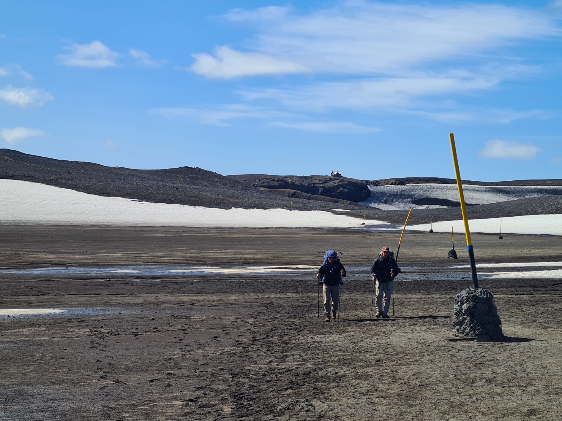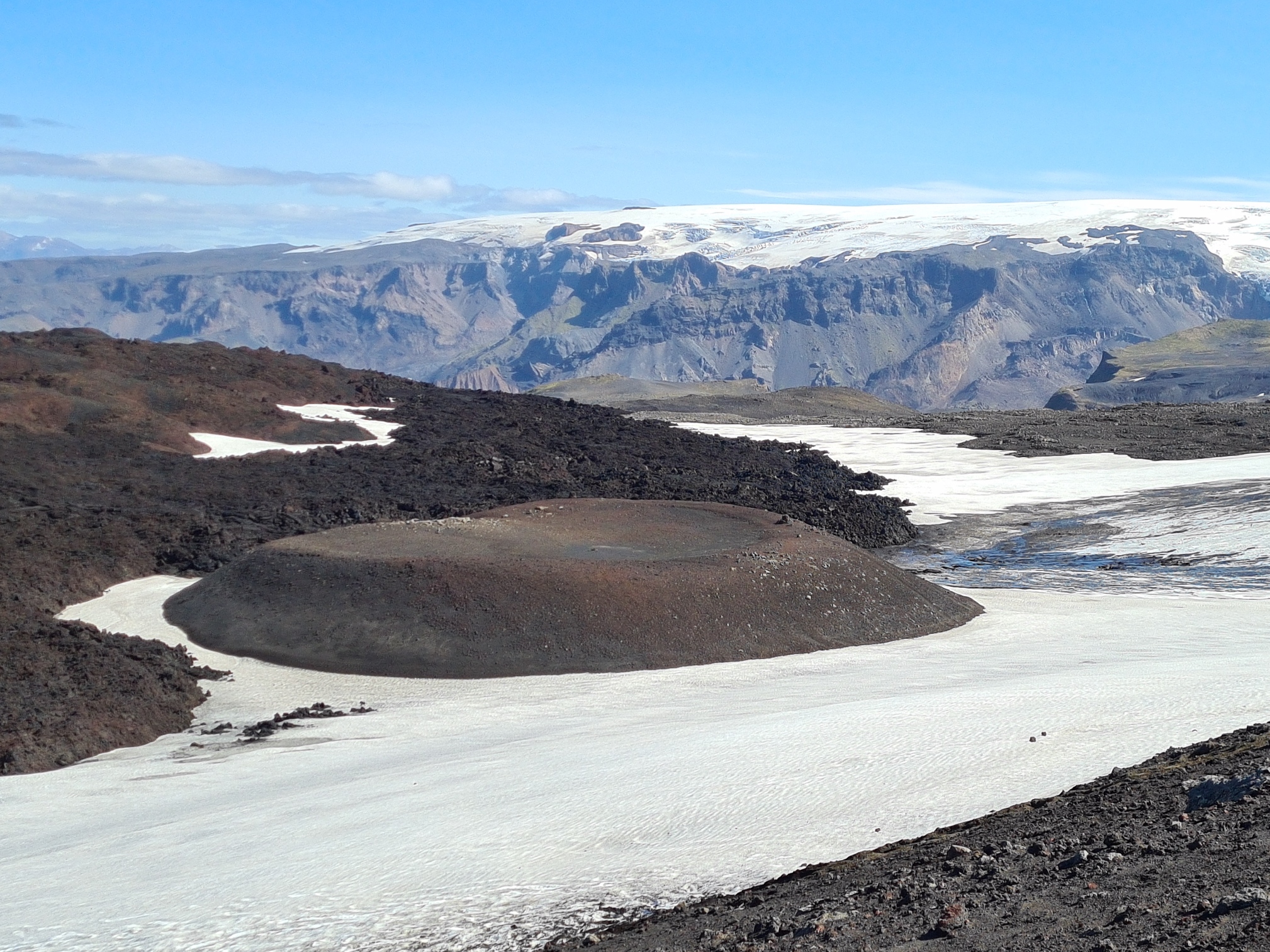 Eight kilometres out of Þórsmörk there is little if any vegetation and it becomes much more of a barren, volcanic environment. Hardly surprising as the trail is now crossing the site of the Eyjafjallajökull eruption. In 2010 vast plumes of smoke, steam and ash had risen into the sky, creating thick choking clouds that poisoned farms downwind and grounded aircraft across Europe for weeks. This large eruption succeeded another. On 20 March 2010 a 0.5 kilometre wide fissure opened to the north of where I was standing. A week later two new craters were formed. They were named Móði and Magni after the sons of Thor.