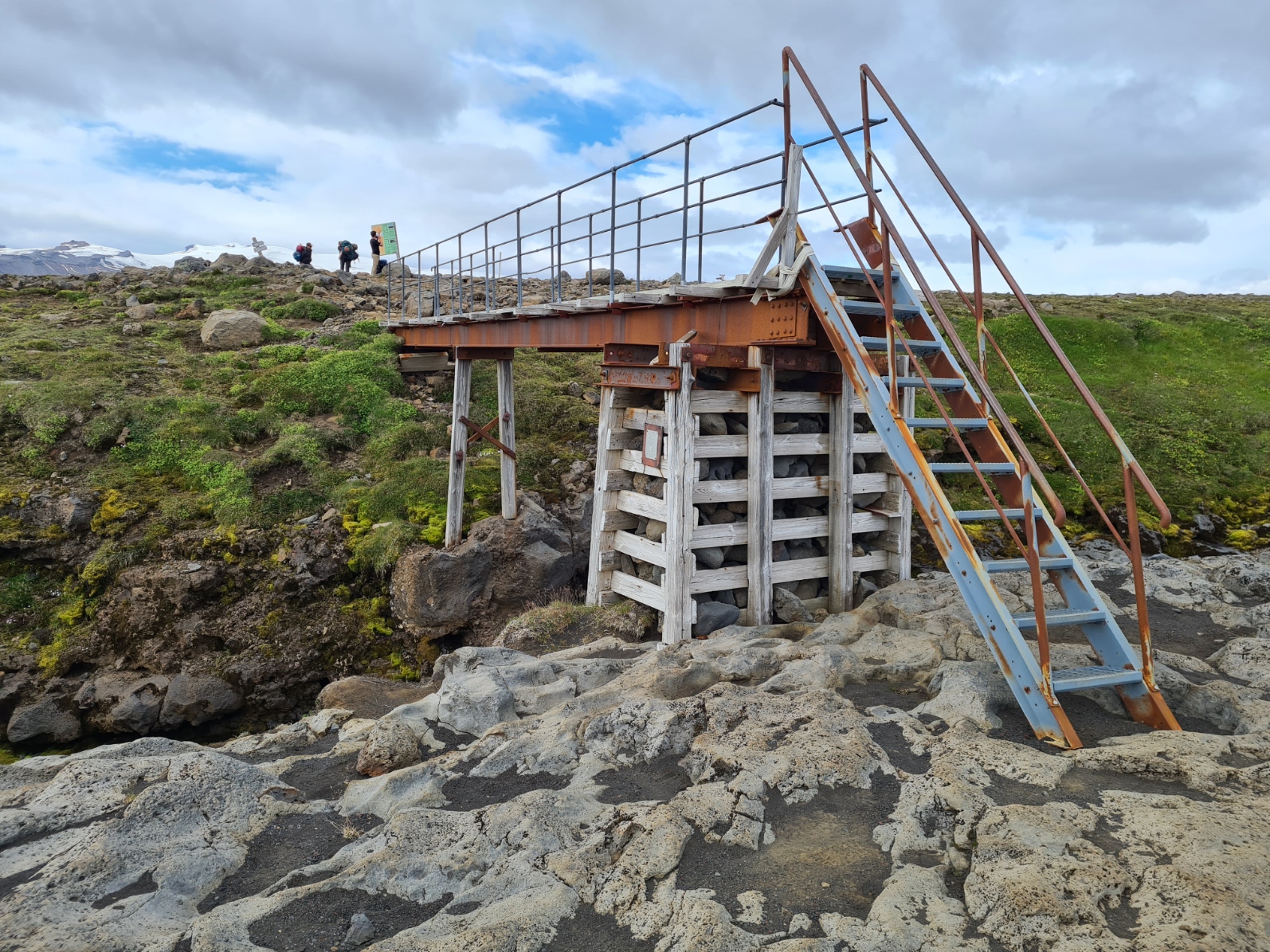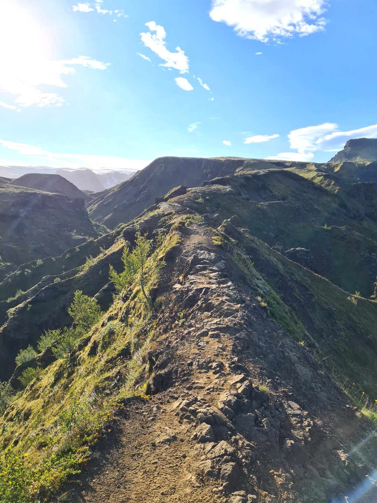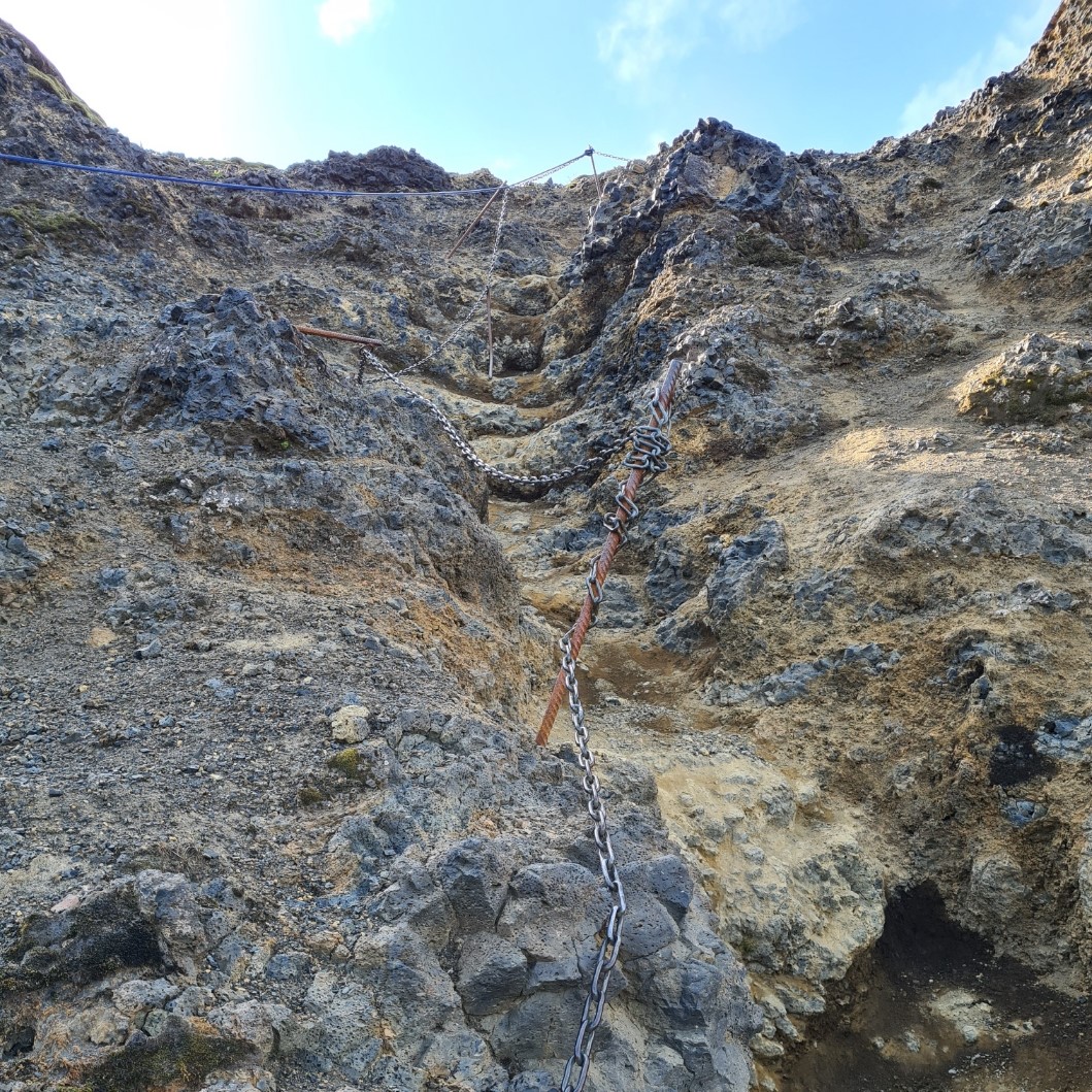 The Kattarhryggir knife edge ridge that leads up to the plateau is brief and not particularly difficult though I imagine it would be a worrying experience in high winds. I didn’t have anything like that to contend with. On a flatter spot I found a rock to sit on and view my surroundings and back to the wide Krossa valley, consuming chocolate covered raisins and water while doing so. I could see two other hikers approaching the way I had come and waited until they had passed before setting off as I hate being chased down and didn’t want any pressure on me to travel faster than I was comfortable with as while most of the path was easy enough, there was the occasional short section that required care. Two sections have chains put in to offer a handhold and there were a couple of slippery descents with sheer drops alongside. Again, nothing to worry over, just somewhere to take a bit of extra care