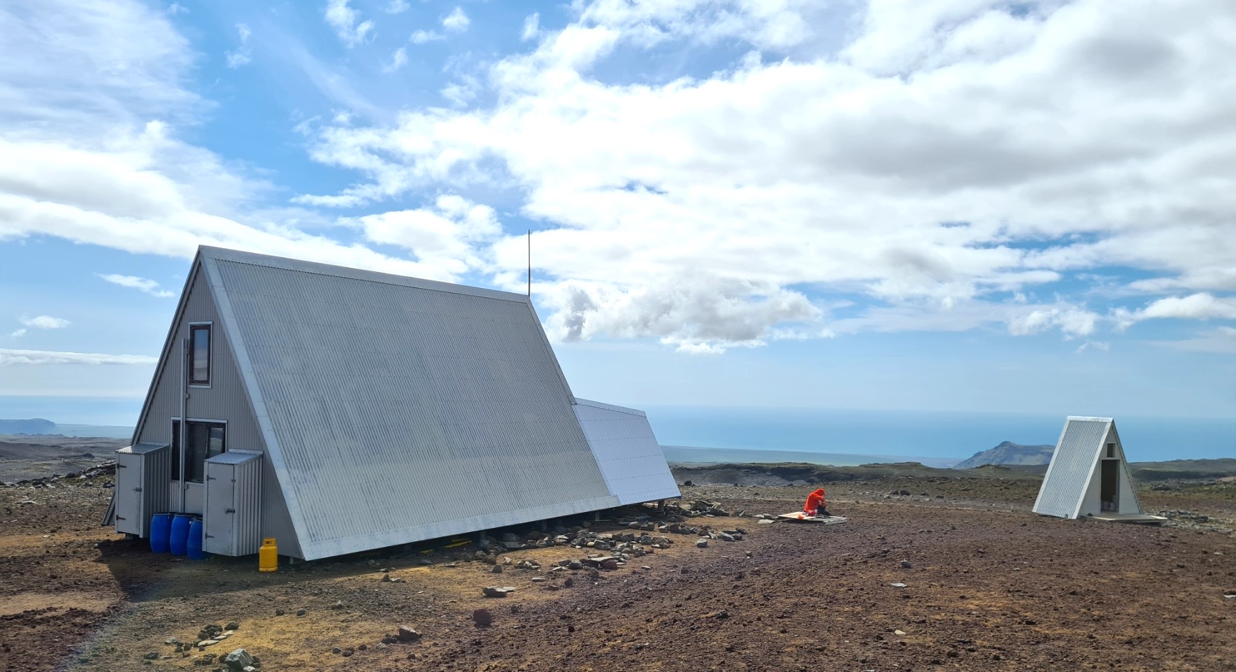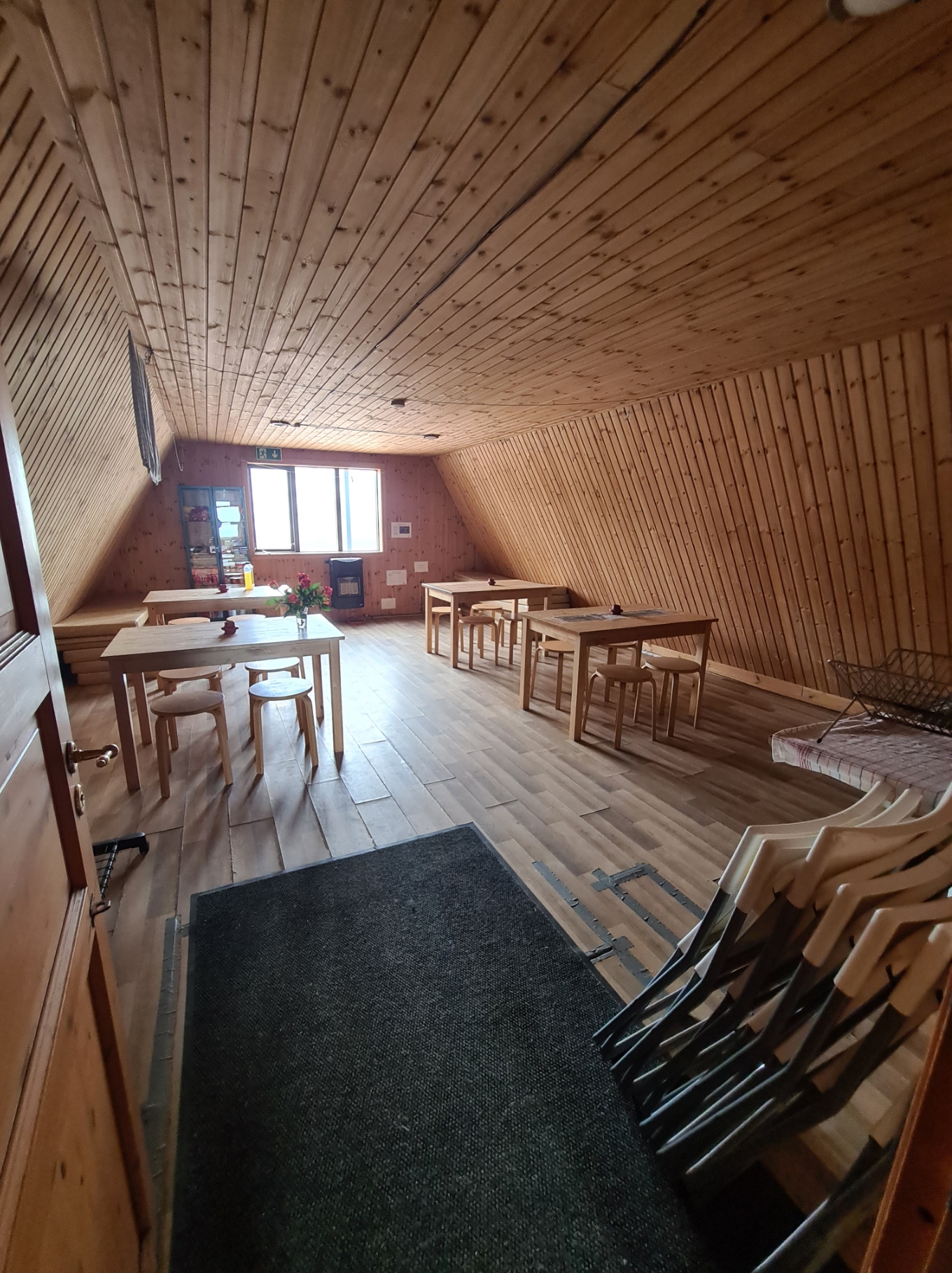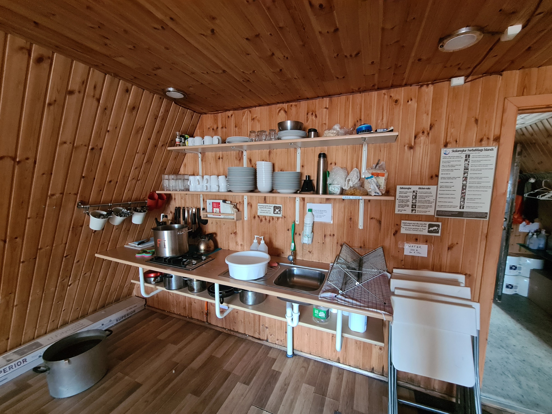 I arrived at the small pointyBaldvinsskáli mountain hut on Fimmvörðuháls to find the warden was away collecting supplies and a friendly contractor unloading tools and materials from his purposeful looking 4×4. I sat on a sunny little veranda, protected from the wind and while I heated water for a hot chocolate and cut wedges of cheese to munch with my Icelandic mutton jerky, we chatted about his work, extending the hut to add on a drying room at one end. While he got his tools together, he invited me to have a look at the hut’s interior. Seeing as I had not had opportunity to explore inside any of the previous huts I was keen to have a glance. Campers can not use the kitchen or other facilities in the huts and access is not normally permitted to them unless the weather is particularly threatening to life and limb. His work was immaculate, though I did tease him about the vicious pointed nails on the interior of his roof beams. He was unconcerned, saying if money could be found for insulation, this would cover the evidence.