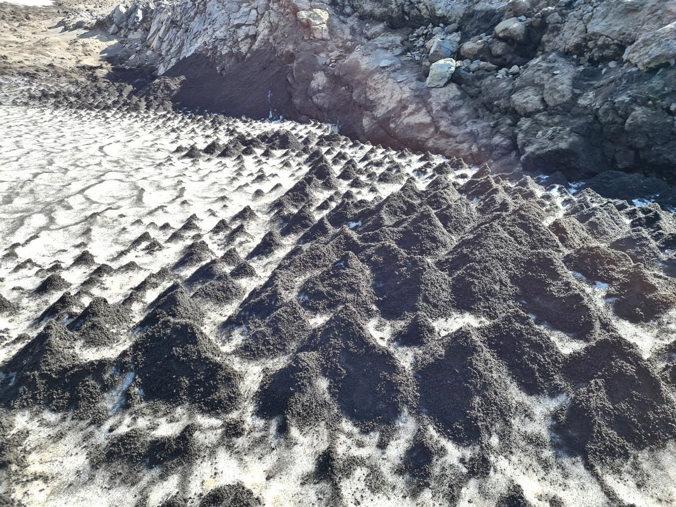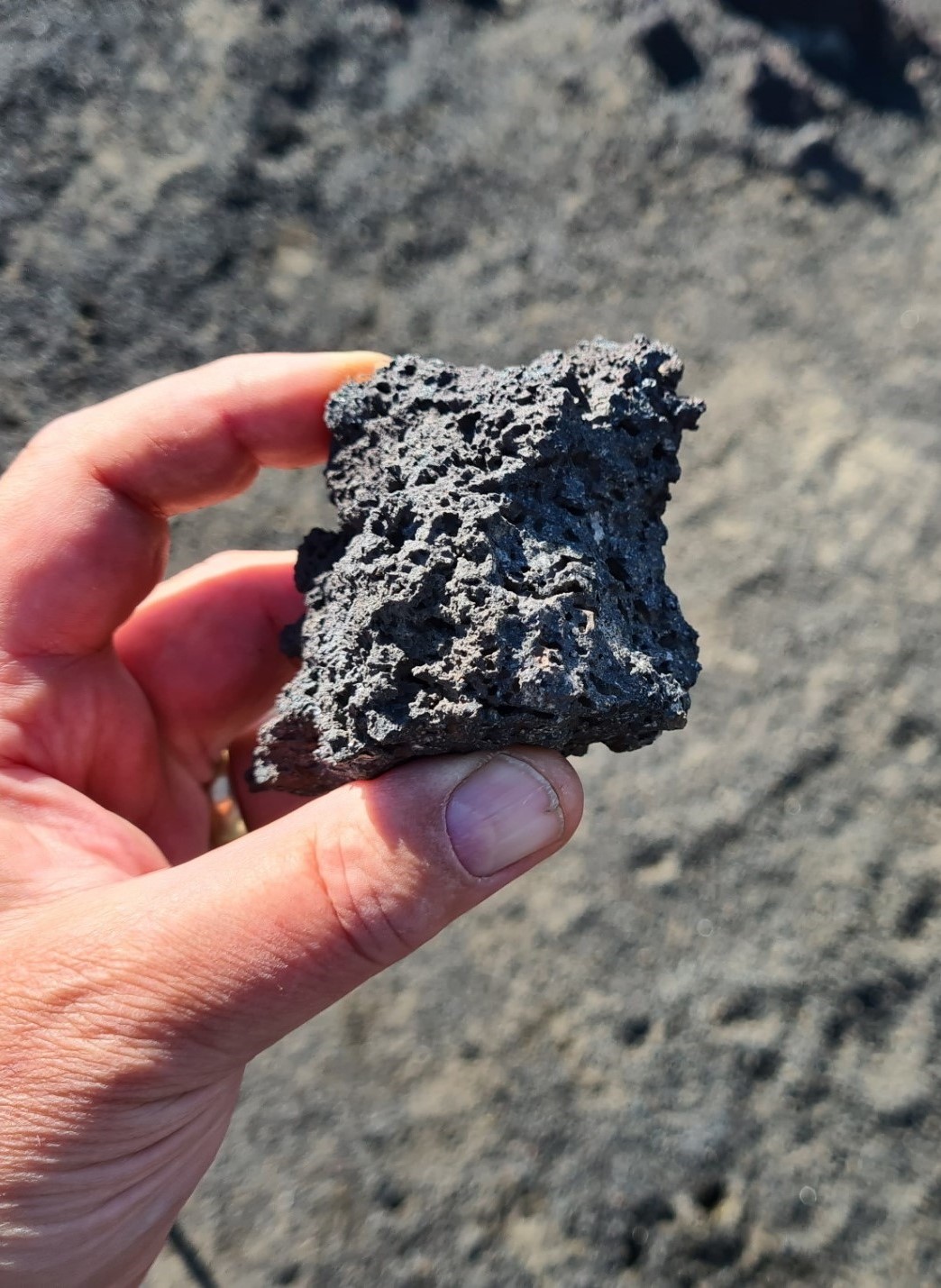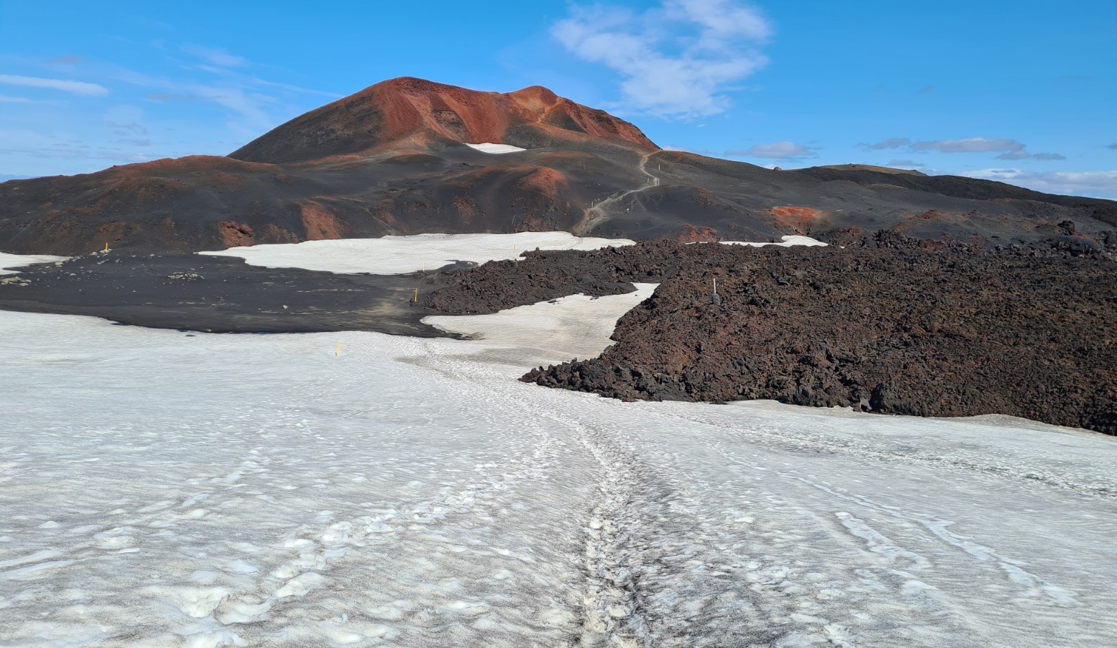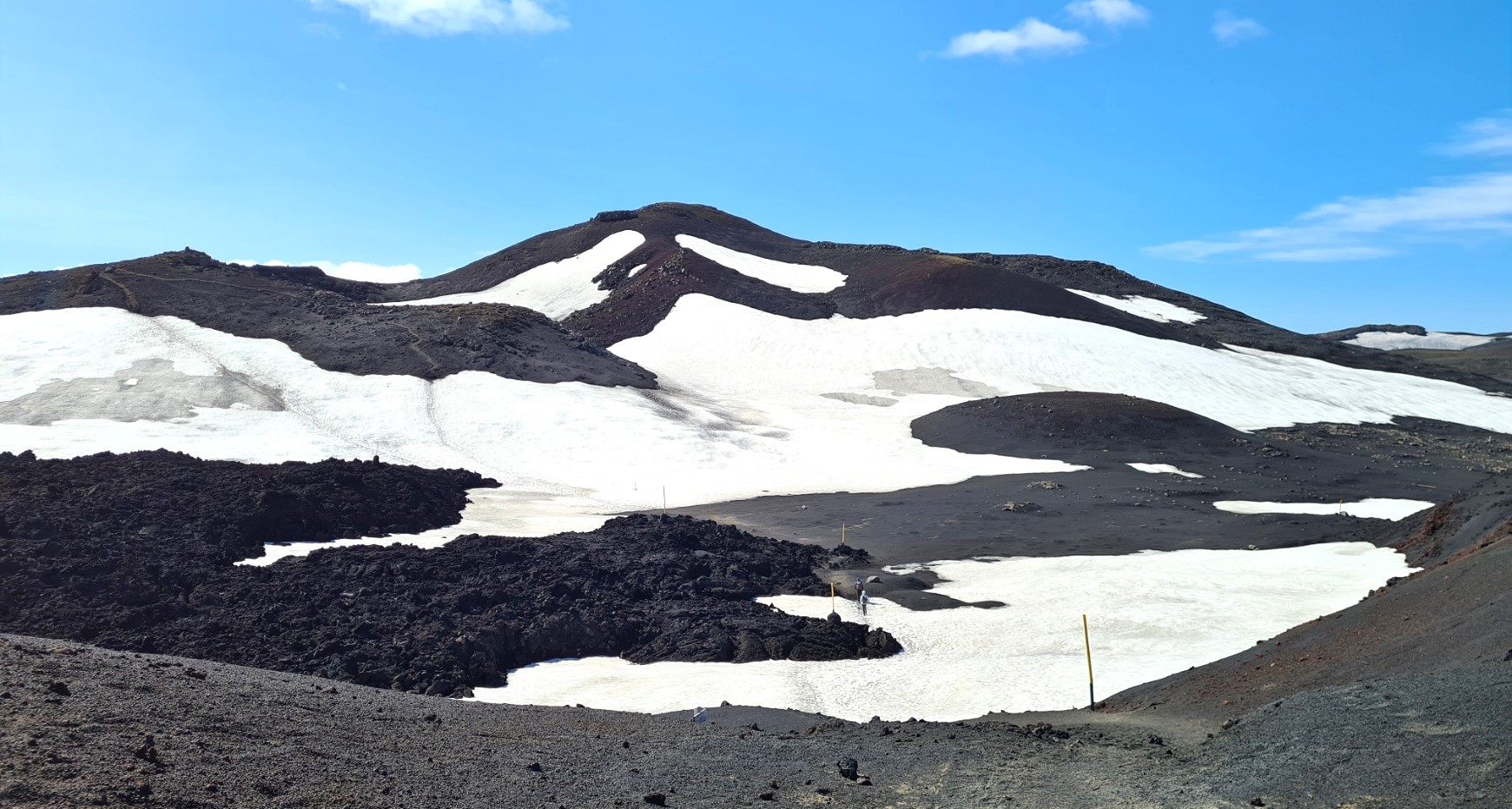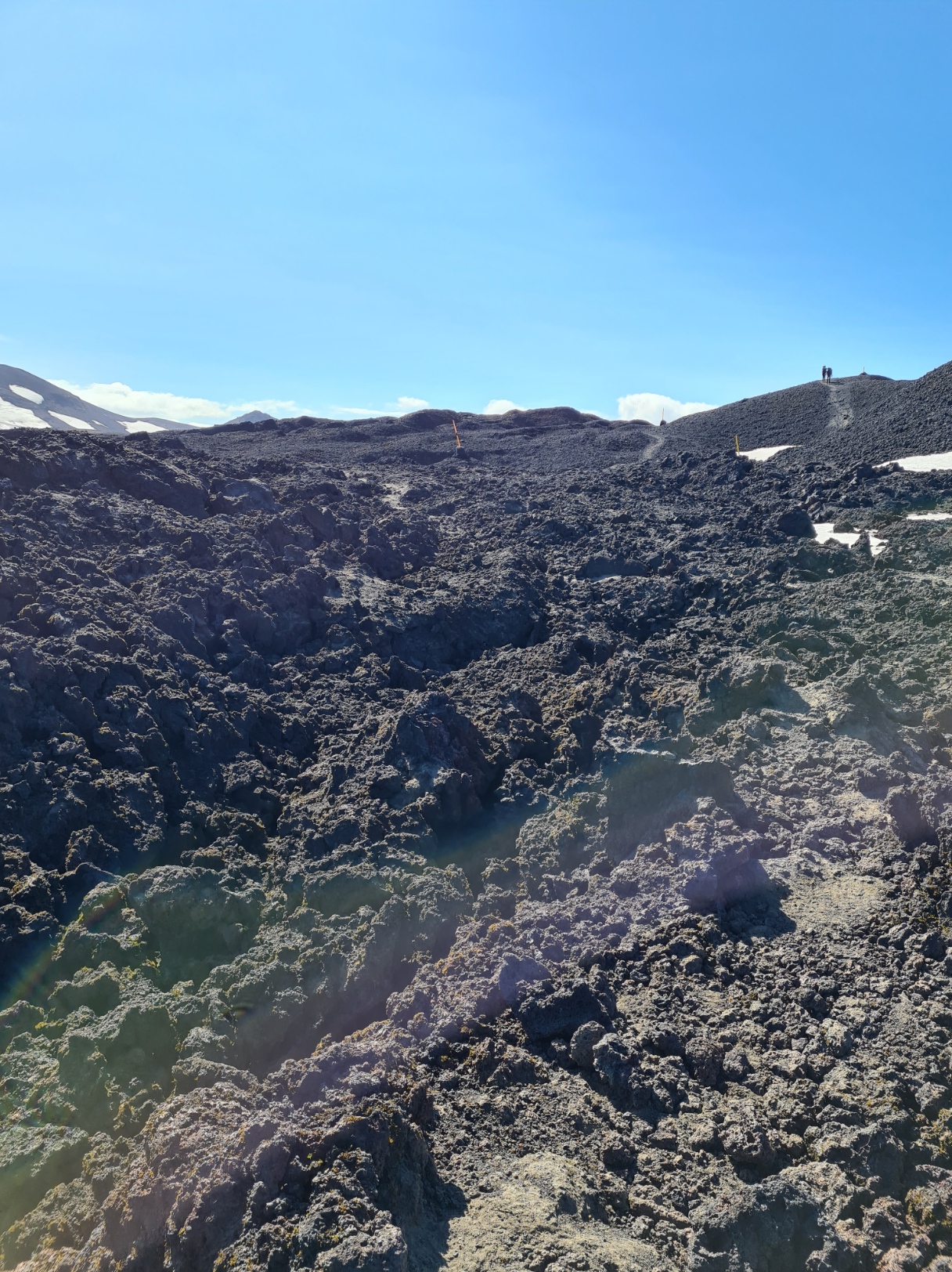 I was really careful crossing the jagged rocking fresh lava fields. They are not consolidated yet and while there are some obvious paths across parts, others require a little clambering and it would be all too easy to come a cropper here. As it was, it was later, while descending one long steep, dusty, crumbly slope on a final approach to the mountain hut that I slipped and fell, not once, but twice, and I was lucky not to break or bend a trekking pole, or worse. As it was, I got a dusty arse and picked up a hole in my Arc’teryx leggings. No harm done.