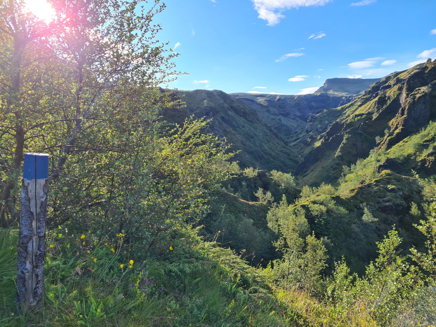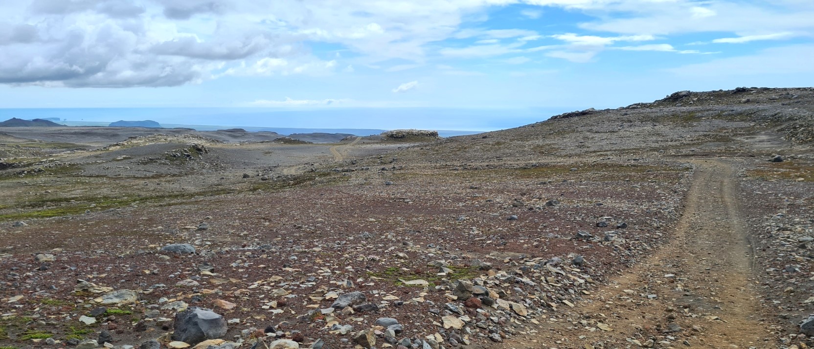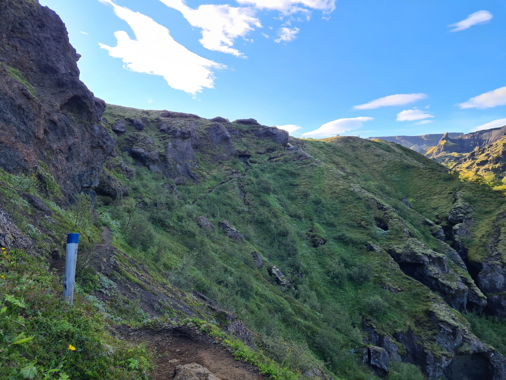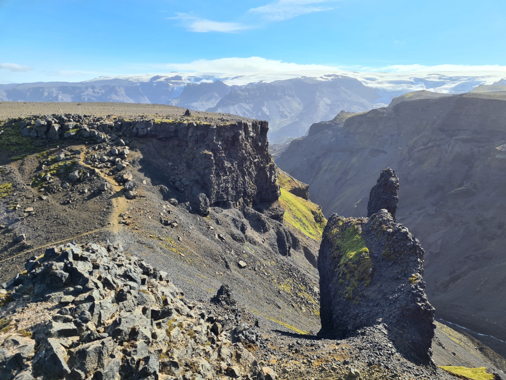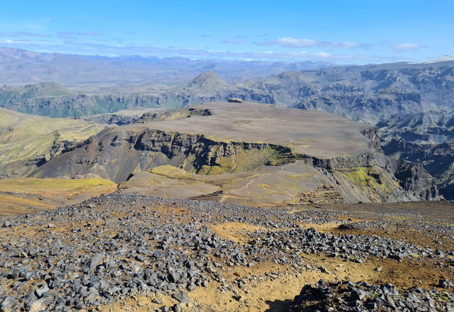 After more climbing I crossed the Morinsheiði plateau, cinders littered with thousands of rock bombs from the 2010 eruption, though that has nothing to do with its name as ‘morins‘ translates as ‘rust red sheep’. There were fantastic views all around and it was very obvious that these were going to improve dramatically as the trail continued. A more sobering sight was a memorial to a hiker who had lost his life here when conditions overtook him. The slight trail could easily be lost if visibility was poor and there are sheer drops on all sides.