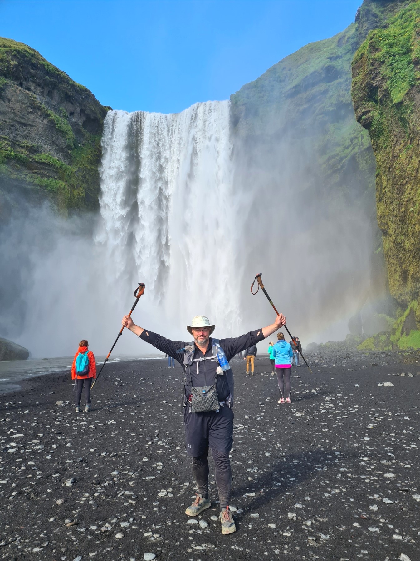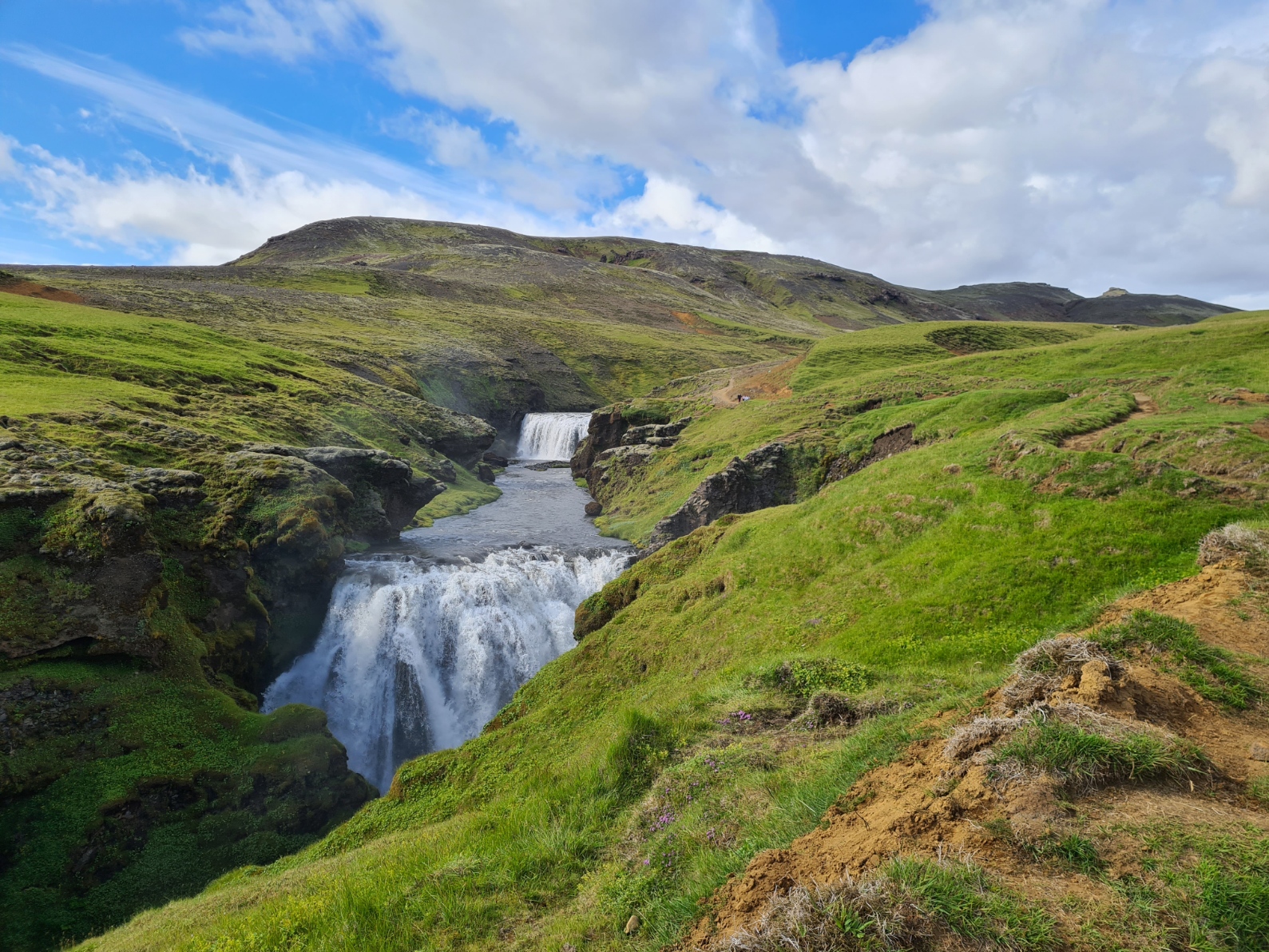 All too often a decent long distance trail finishes with a bit of a whimper. Fizzling out at some nondescript location. In contrast, the Fimmvörðuháls Trail ends well. Standing at the foot of the impressive falls, complete with shimmering rainbows, is marking such a walk properly. I finished the Fimmvörðuháls Trail around 16.00, giving me plenty of time to continue marking my accomplishment with a couple of beers at the Hotel Skógar. Rather than sit there for too long, getting sozzled, I left to pitch up and consider options. I was a day ahead of schedule and I had a Hikers Pass bus trip booked the day after tomorrow. Looking around the site I could see there was little to keep me entertained here for another day. Standing outside the hotel I got both signal and wi-fi so WhatsApped, emailed and eventually phoned the bus company. Result, there was a seat available on the bus the next morning and I swapped over to that. The site management showed up at 19.00 to take monies and I also managed to get change out of her for the campsite’s shower, as the bar staff in the hotel had refused to give this to me, even as change for a beer.