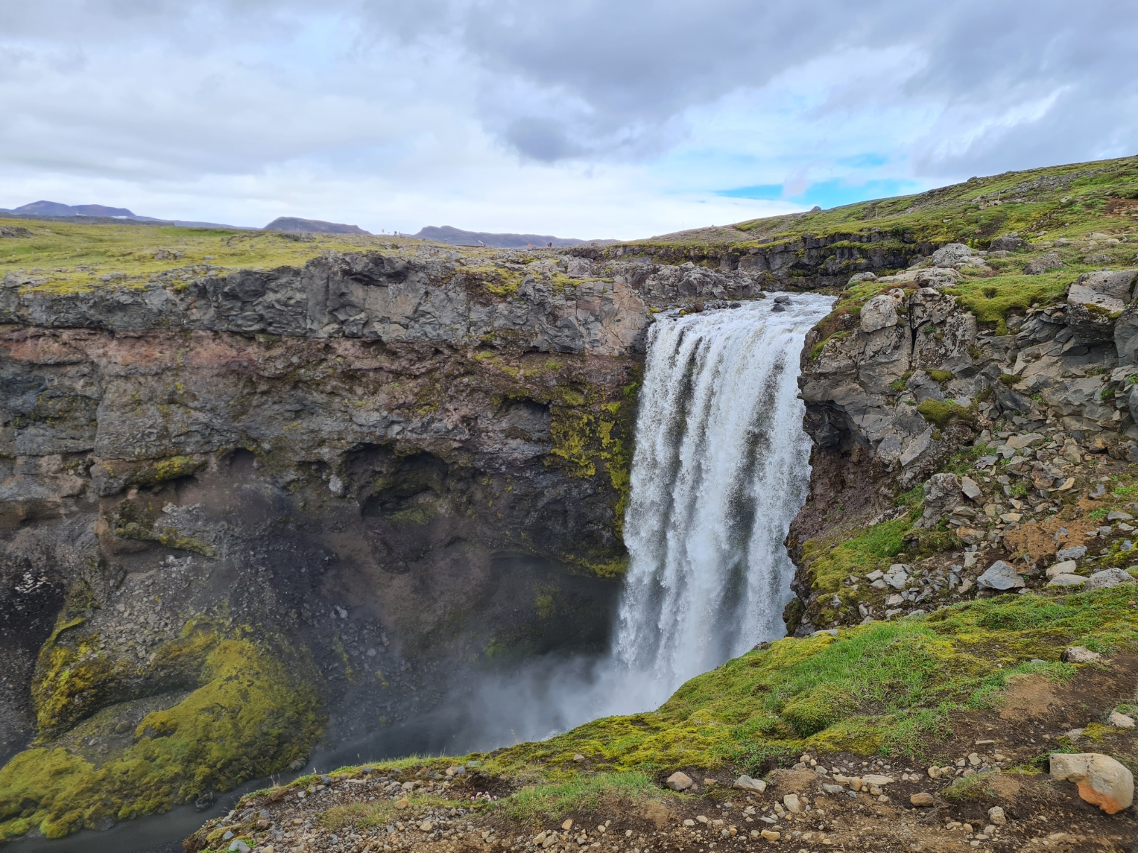 The plateau is followed by a drop to the Heljarkambur ridge with a vast glacier to my left. I could just hear the melt water from the glacier tumbling hundreds of feet down the gorge walls. After that brief traverse, it is a thankfully short(ish) slow and winding slippery ascent. I continued to climb, and either the Eyjafjallajökull or Mýrdalsjökull glacier was in view for much of the morning.