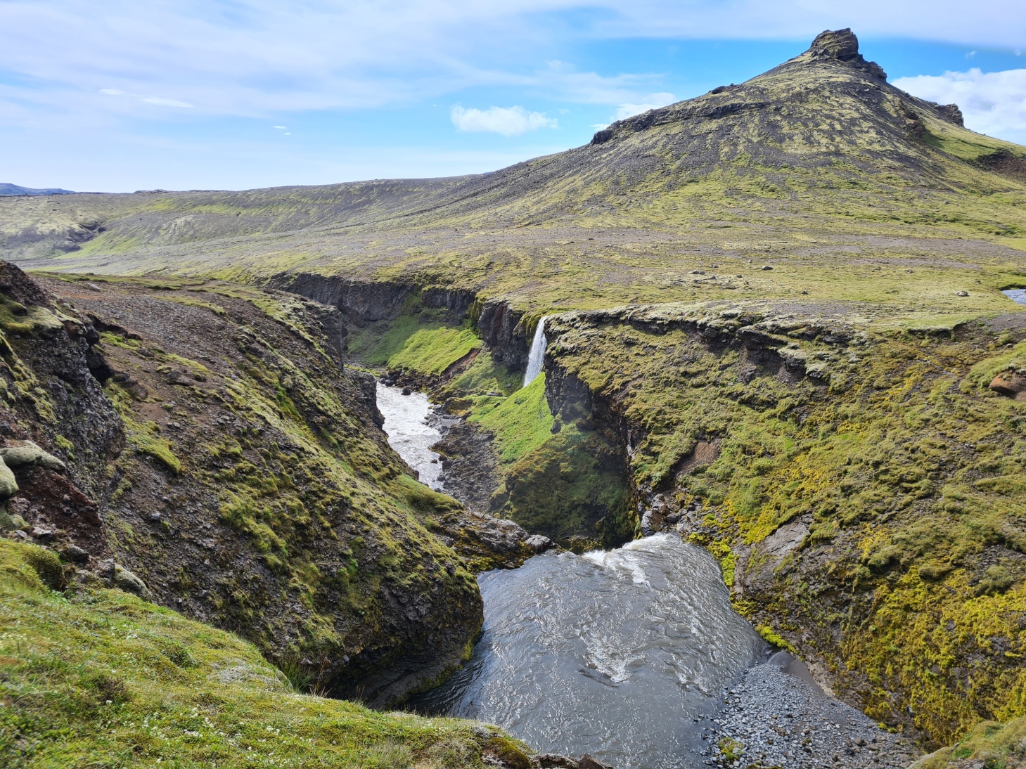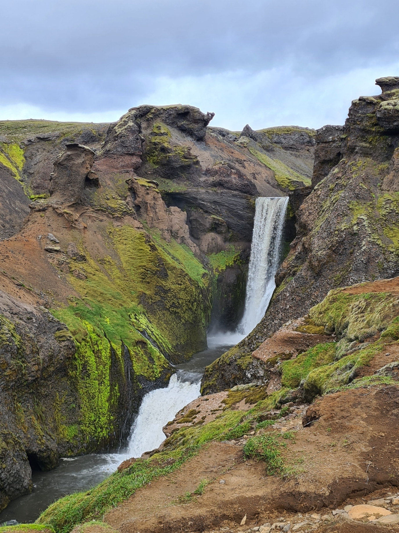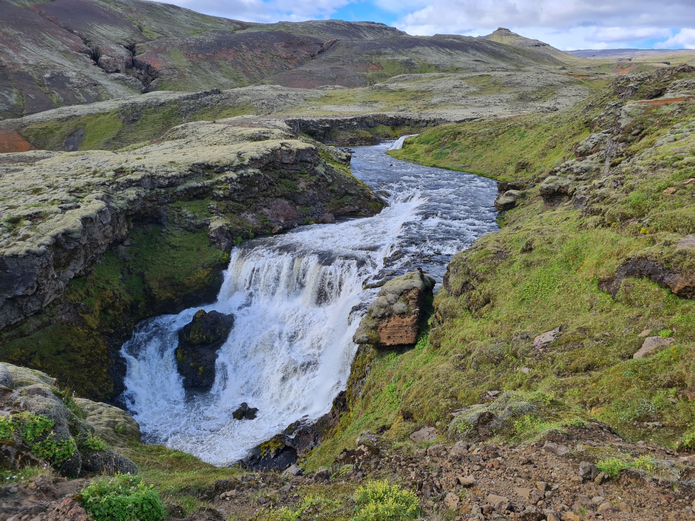 Thankfully the trail soon left the track and crossed the rock strewn cinder fields toward a footbridge over the Skóga River. I was now encountering the first of the twenty-six waterfalls passed on this section, on the approach to the sea. Smaller streams dropped into the gorge, the main river gaining in volume and strength with larger, more dramatic waterfalls as a result. I was passed by more and more people the further I descended. These were the more intrepid of car tourists having ventured up from the carpark at the bottom, for those Instagram moments. While a myriad of photos of waterfalls are an obvious excess, that is what the last few kilometres down to the carpark, hotel and campsite at Skógar comprises and I only show a handful here.