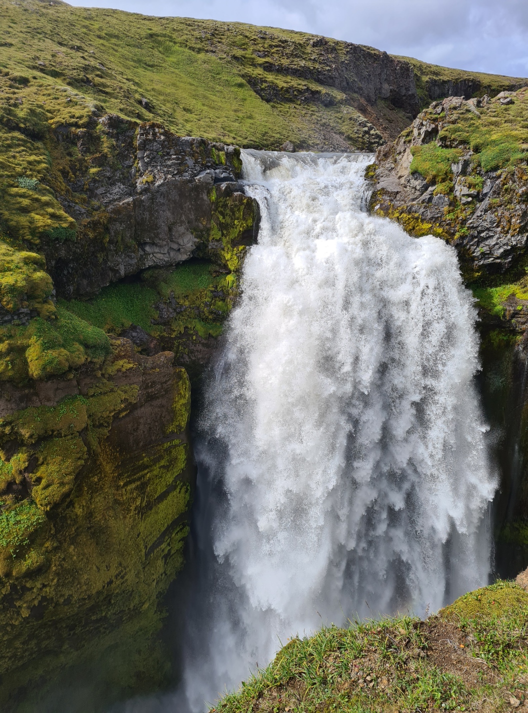 The Fimmvörðuháls Trail ends with a flourish. The final fall is the dramatic 62 metre drop of Skógafoss itself. This is one of the most popular of tourists sites and it was very busy. Most seemed to make the long climb up the steps to the viewing platform at the top. Which is, in fact, a terrific viewpoint.