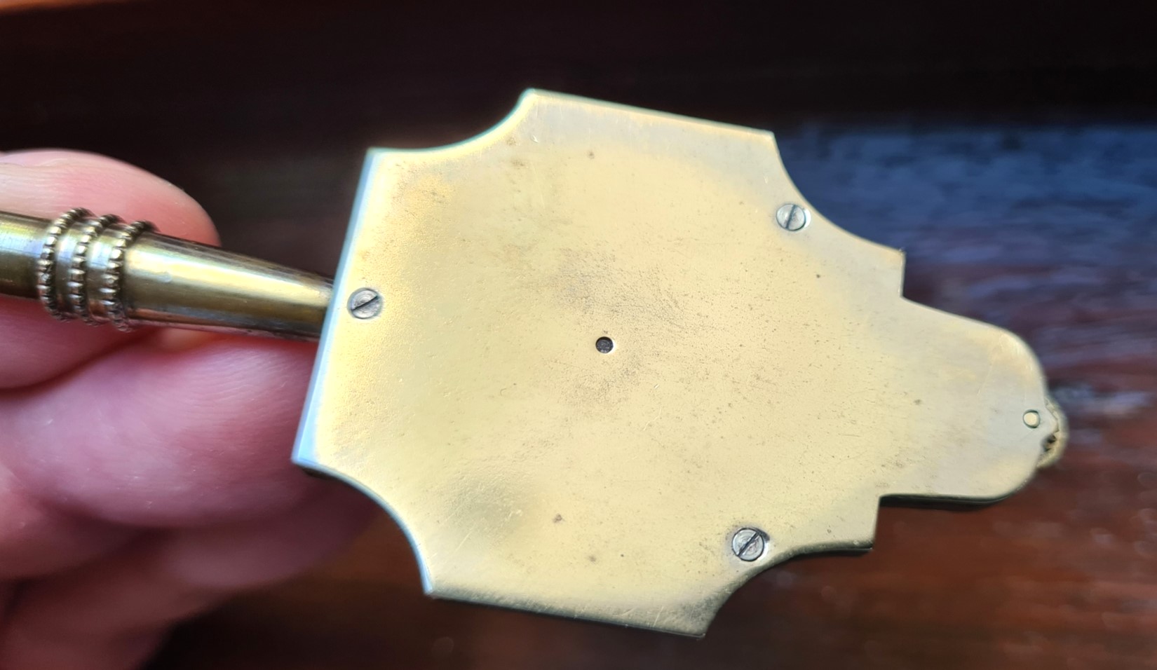The crystal is slightly domed, covering a paper dial with four measuring scales. The crystal is pinned to the case with three small steel screws: two at the top, at the ‘ten’ and ‘two’ positions, one at the ‘six’ position. Tracking the finely toothed wheel at the base of the measure along a line on a map, rotates fine internal gearing, rotating the blued needle around the dial. The rear of the case is plain with no markings. There are three small steel screws holding front and rear of case together. The 65mm long steel handle has three bead rings to aid grip and a circular finial that normally indicates Swiss/French manufacture. The curvimètre weighs 44g.