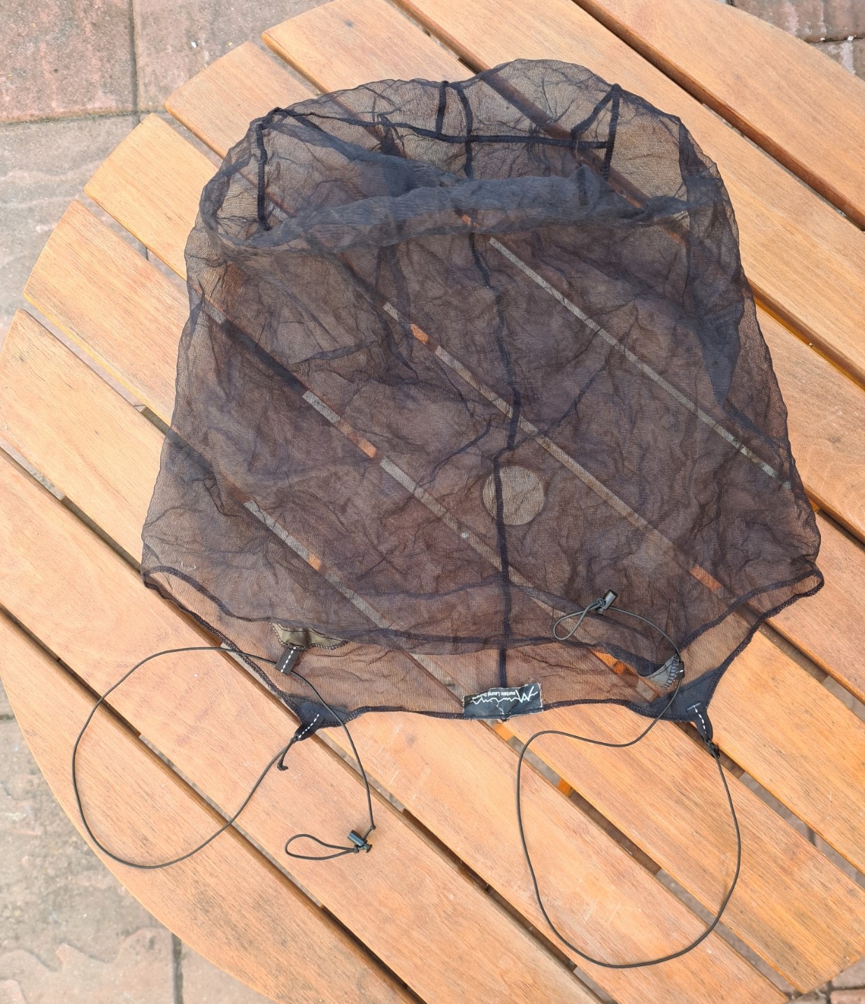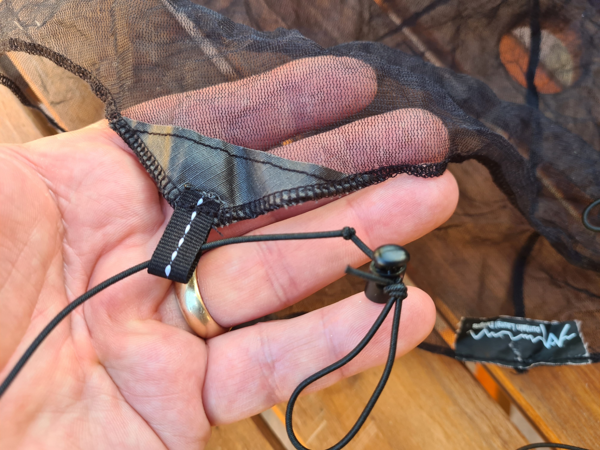 This is not the simplest of head net, though could be just slipped over the head if wished. Instead it has thin shock cord loops that slip under the armpits, tightening down on the two small cord locks at the front enables this net to be tightened down and it then forms an effective sealed barrier that doesn’t move away if bending to put up a shelter or performing camp chores. While this net works well with my medium brimmed Tilley LTM5 Airflo hat, it may not fit over some very wide brimmed hats.