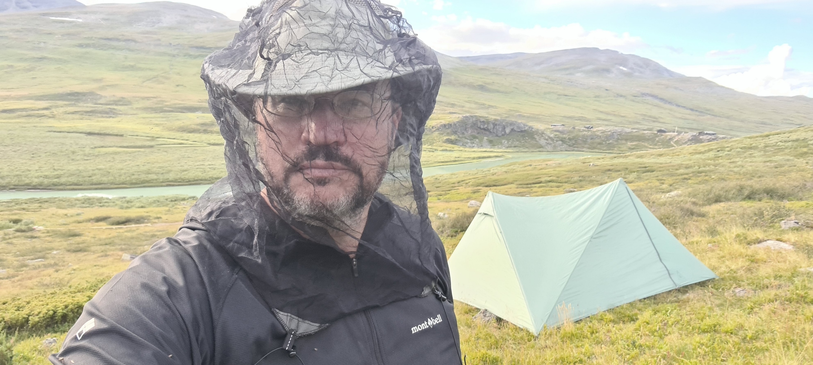 Three Points of the Compass has just returned from backpacking in Sweden’s Arctic Circle. In common with most three-season multi-day hikes I make, before setting off to trail, I slipped a little head net into the pack. When I have had to use this while backpacking it is probably all that has enabled me to keep my sanity. Head nets are relatively cheap, extremely lightweight, easy to use and there is a lot of choice. All of them look daft, though that simply is not a factor. Some are simple narrow tubes, others are a little more complicated in design. It pays to be just a little careful in which is chosen to join you on a hike. I have a favourite, but have tried a small number of others that proved less satisfactory. You can buy a head net for not-a-lot of money and it is easy to scrimp here. You may be afforded plenty of opportunity to regret such a cost saving.