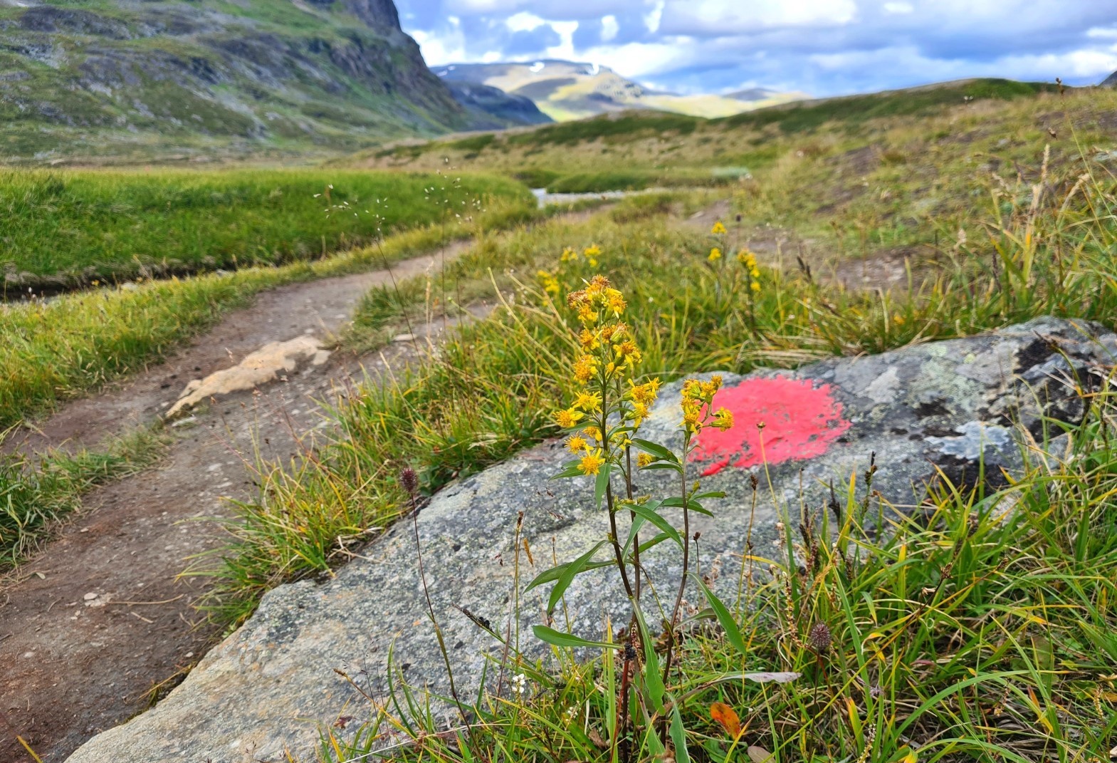 I had left the rocky terrain behind and the walking got progressively easier, often on fairly wide dirt paths. My ‘old man pace’ had increased just a tad on the easier paths but I noticed that a few of the greyhounds had slowed, it was evident that some were now nursing blisters, sprains and strains and I heard complaints of aching knees, hips, backs and feet. I was fortunate that my body seemed to be hanging together quite well. The trail passes close to the Tjäktja mountain huts, but doesn’t actually visit them. If you want to go there you have to turn left and cross the suspension bridge and climb up to them. Carrying on, the path got grassy and there were some really lovely places along here that would have made for spectacular wildcamping, but it was too early and I had another location in mind that would leave me easily achievable 18km and 15km days to finish off with.