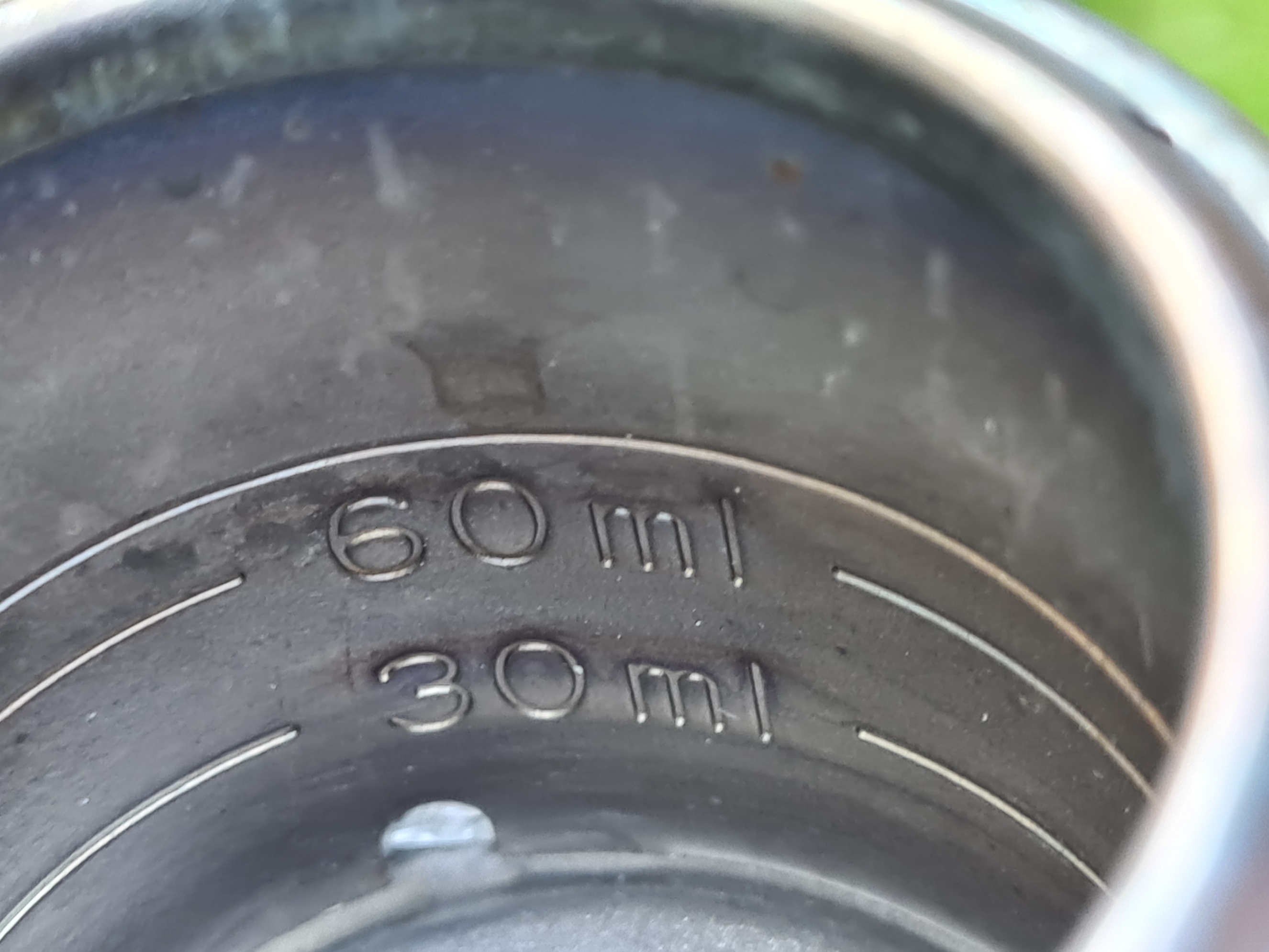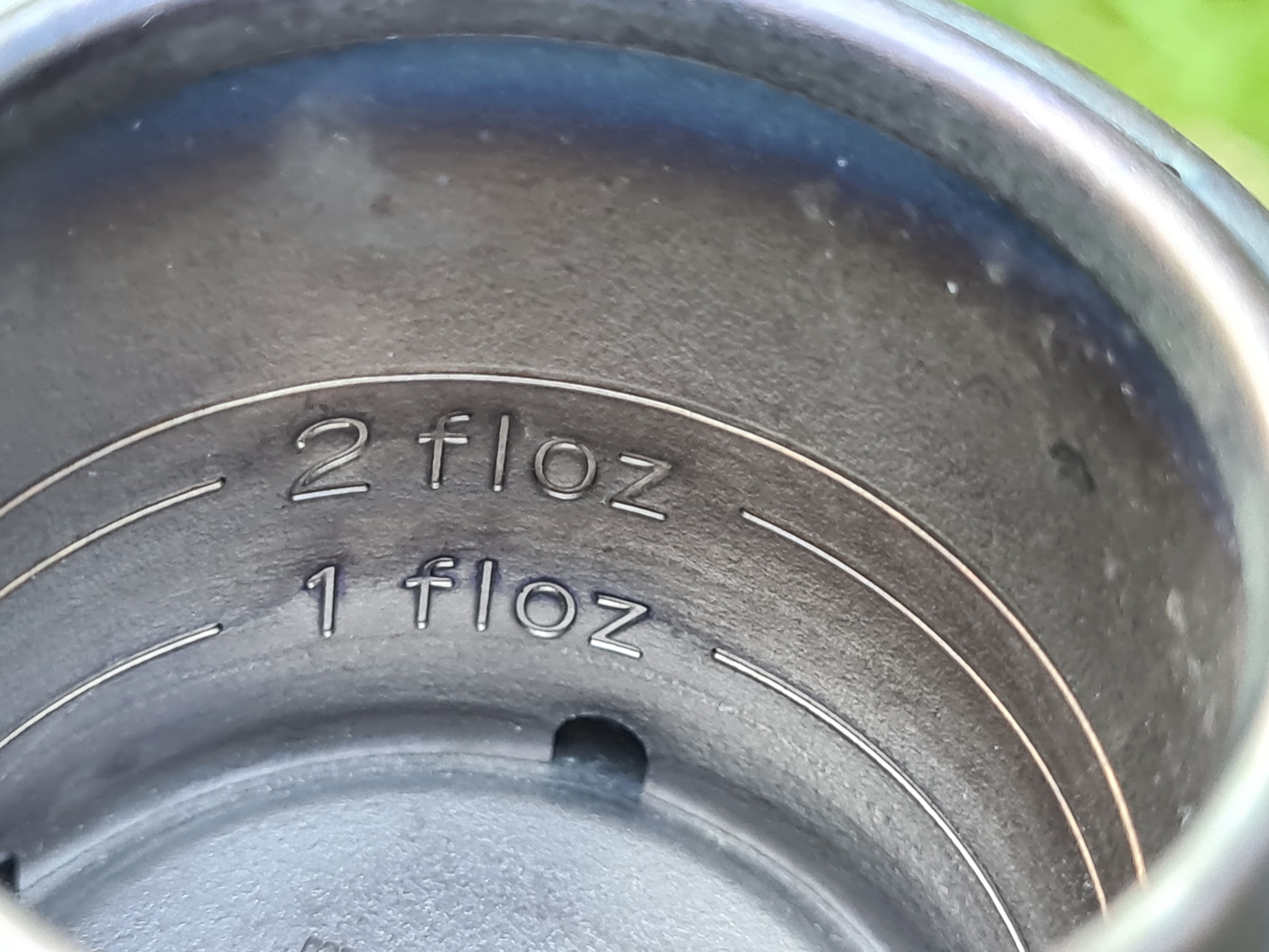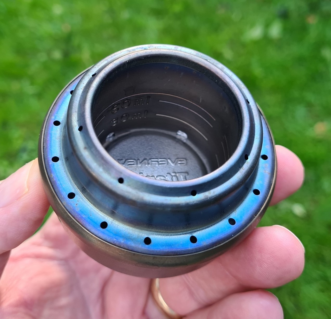 The inside of the burner has both ml and fl.oz fuel fill graduations and it has a maximum capacity of 70ml. You might also be able to see the glass wool wick between the double titanium side walls that soaks up fuel and provides an improved burn.