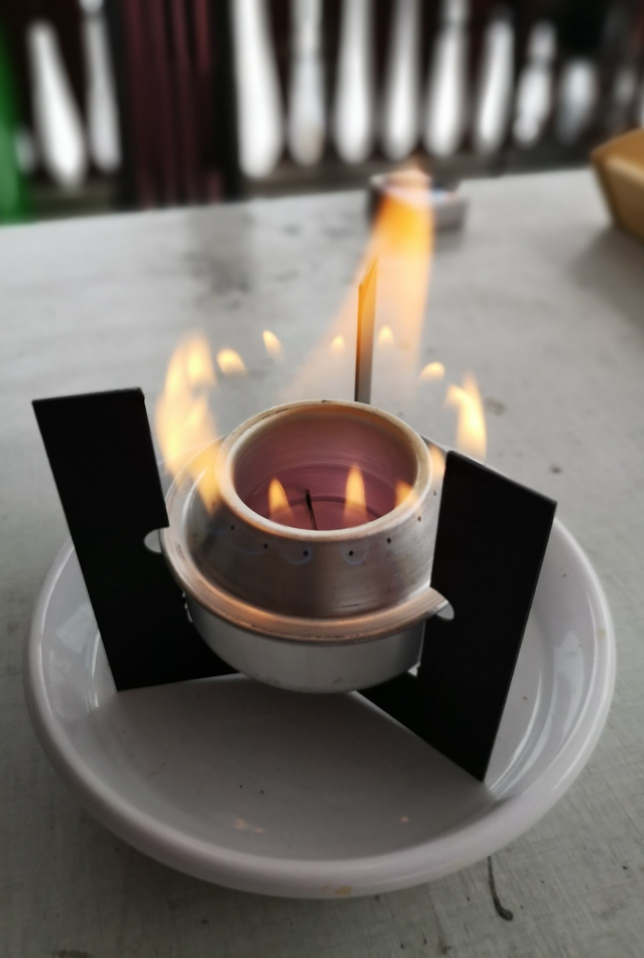 Trangia supplied the Swedish military with a much larger version of their spirit burner from 1964- 1976. These are still available on the second hand market though condition unsurprisingly varies for a product over fifty years old. Leaving out the Triangle’s burner support, the large 169g military burner slots straight into the remaining three sides as though it were made for it. This provides a large fuel capacity and very long burn capability.