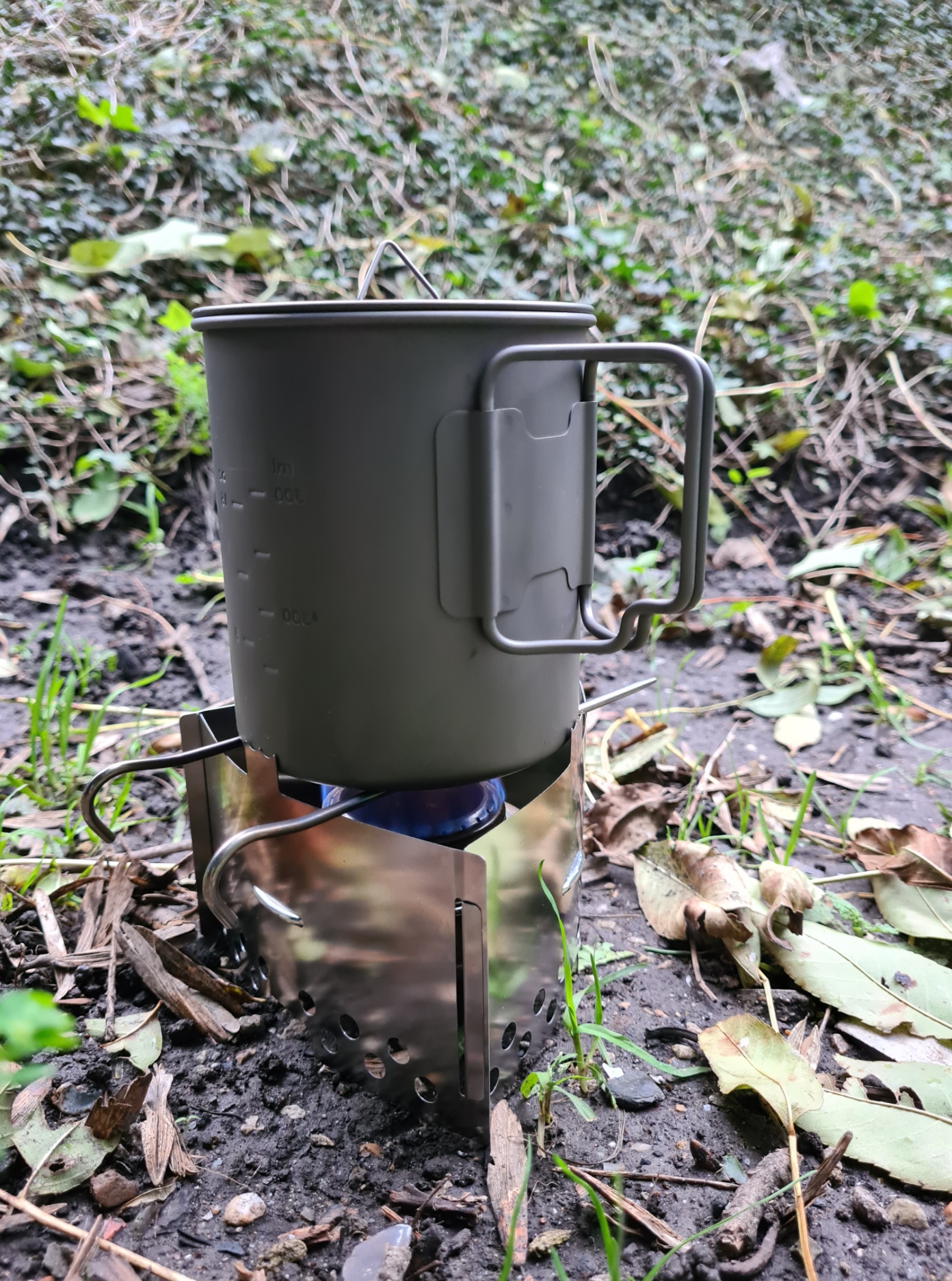 In 2025 Trangia released the Pan stand Triangle (art. no. BF400330). Costing £8.28, this little 11g stainless steel pot has extreme measurements of 130mm x 2.5mm. It clips over the three lugs at the top of the stand and allows narrow pots of 60mm to 90mm diameter to be supported above the burner.