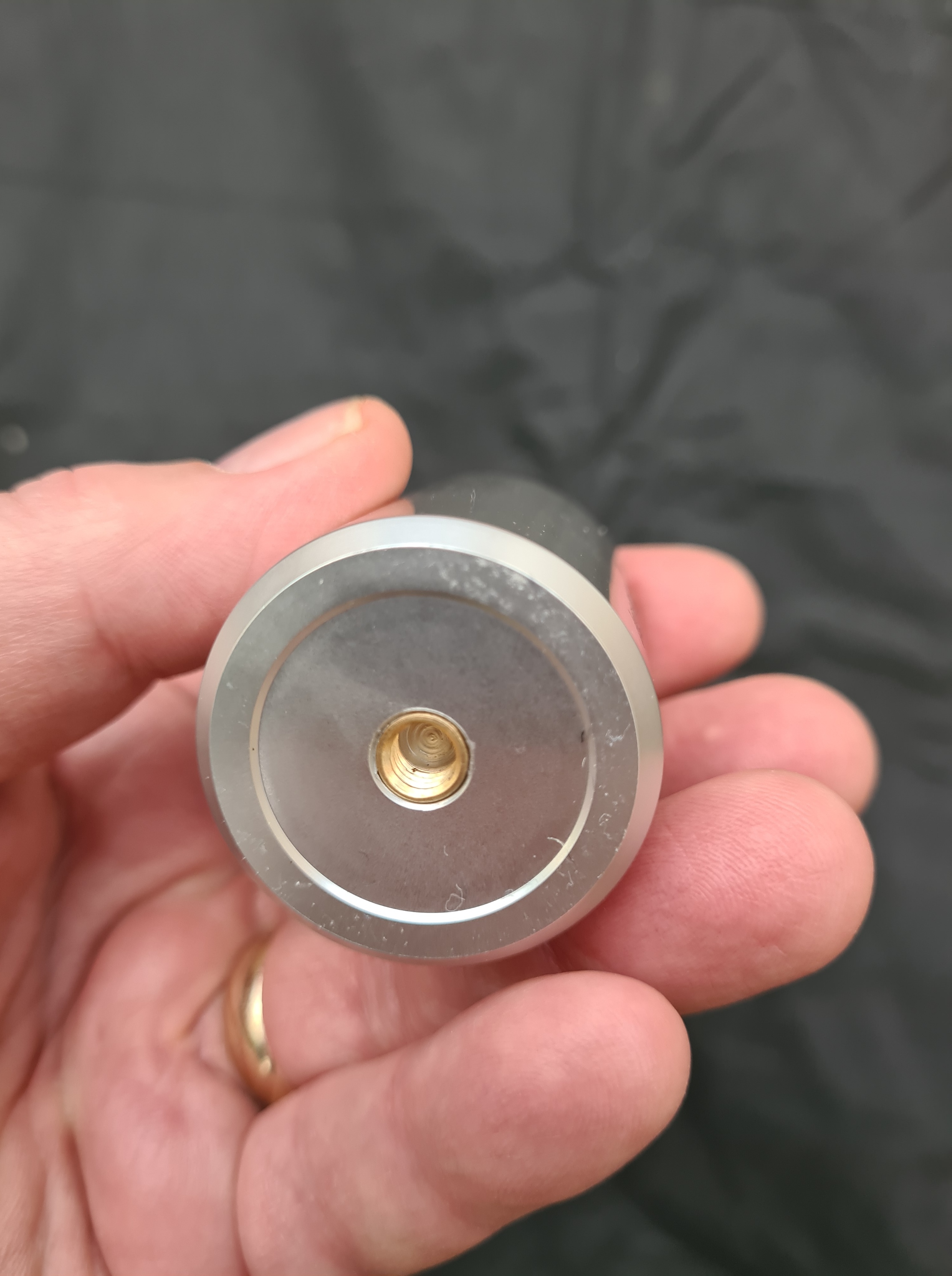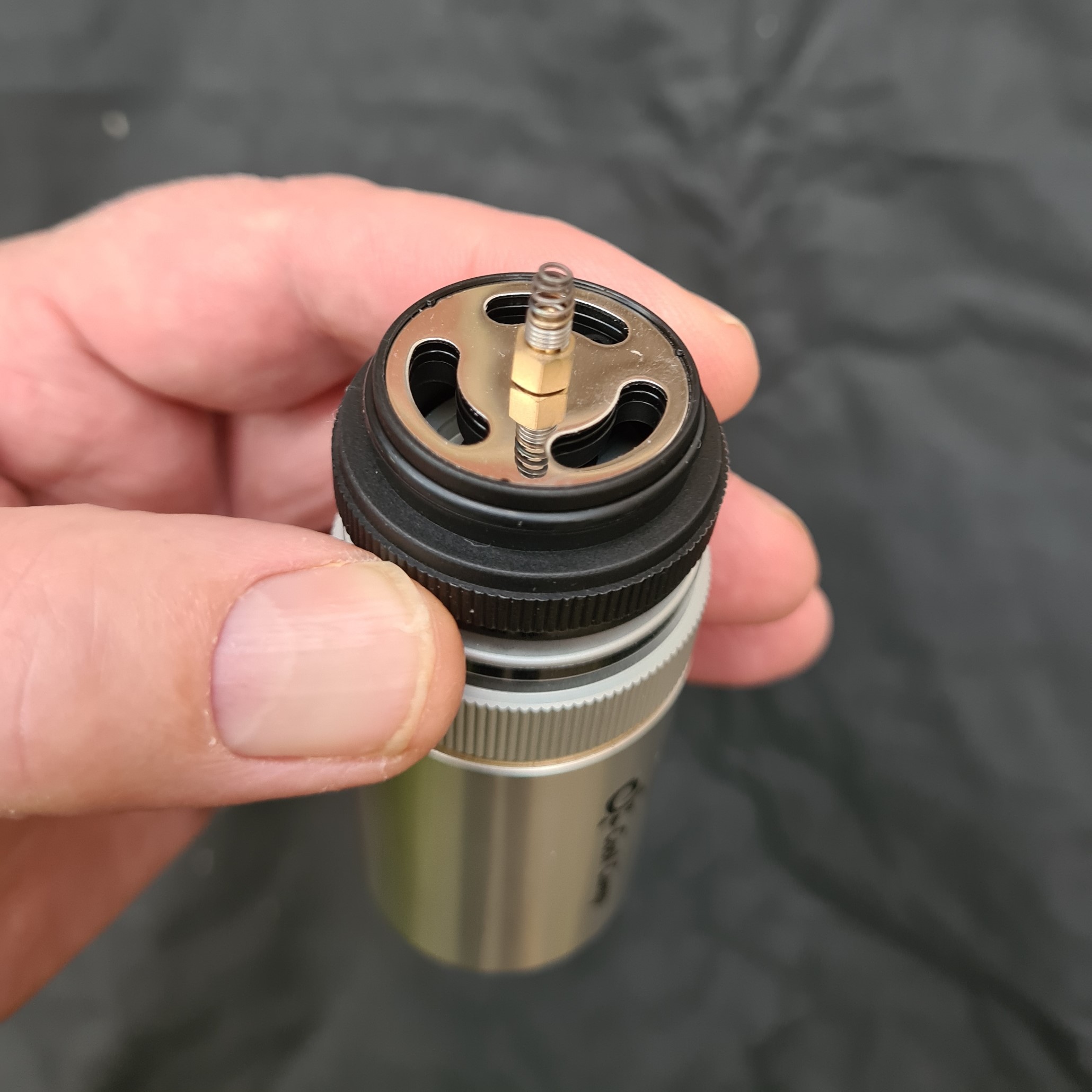 The gas powered candle can be connected to any screw-type EN417 lindal valve iso-butane gas canister. The ‘candle’ and valve control come as one block weighing 67.5g with a tight fitting removable cylindrical 50g glass chimney surround. The glass chimney is kept tight fitting to the main candle block by a thick O-ring. This glass is quite thick (2.7mm) and has a metal surround to the top. It is a tough little thing but could obviously break if dropped on to anything hard. It comes with a soft 7g fabric drawstring closure baggie but this has no padding and will do little beyond preventing scratching or rattling.