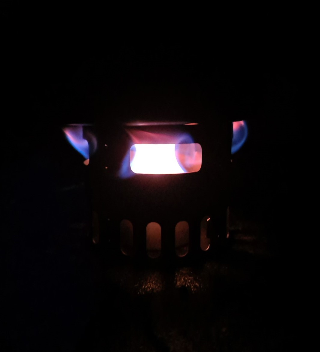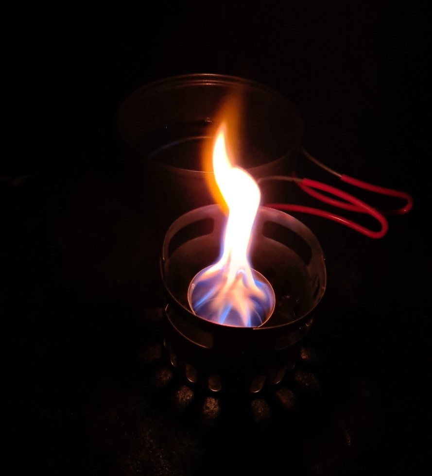 Released by Toaks in 2015, their Titanium Siphon is a sturdy little burner due to its all titanium construction and double wall design. It is a great deal tougher than almost any home made affair. It weighs 20g, stands 40mm tall with a 53mm diameter. Up to 80ml of fuel can be poured into the centre and 30ml of fuel will burn for over ten minutes. If upset, the lit fuel will spill out, making this a dangerous stove to use inside a tent, and especially so on a tent footprint due to the heat generated beneath. Not that I use this on multi-day walks. I carry a little 60ml Nalgene bottle for the fuel which makes for two or three boils. This is plenty for a day-walk and the bottle will fit inside the stove in transit. I don’t time boil times as they are never consistent and if you are worried about such things, then alcohol is the wrong fuel for you. A match is the ideal way to light it, however if the fuel is warm enough it can be also be easily lit with a ferrocerium rod. Or use a lighter, though the deep design doesn’t lend itself to this source of ignition if only a little fuel is being used. Despite this, I usually use a lighter with this particular stove as it lights and blooms so easily. The two thin walls allow the liquid fuel between them to heat up quickly and vaporise and it takes just a few seconds to prime. Despite the fuel type, this is not a silent stove and you can hear the gas exiting the jets under pressure and it is the flame from these burning jets that mostly heat the contents of a pan or pot supported, ideally, around an inch above them. In addition to the blue flames, it also burns less efficiently from the centre of the burner and this part of the flame can creep up the side of a pot in a breeze, hence the advised use of a wider pot to capture and use as much of any drifting flame as possible.